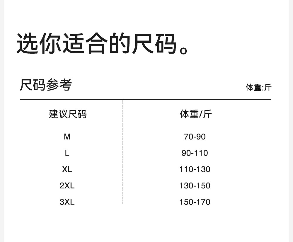 China (cm) 165 / 88-90 170 / 96-98 175 / 108-110 180 / 118-122 185 / 126-130