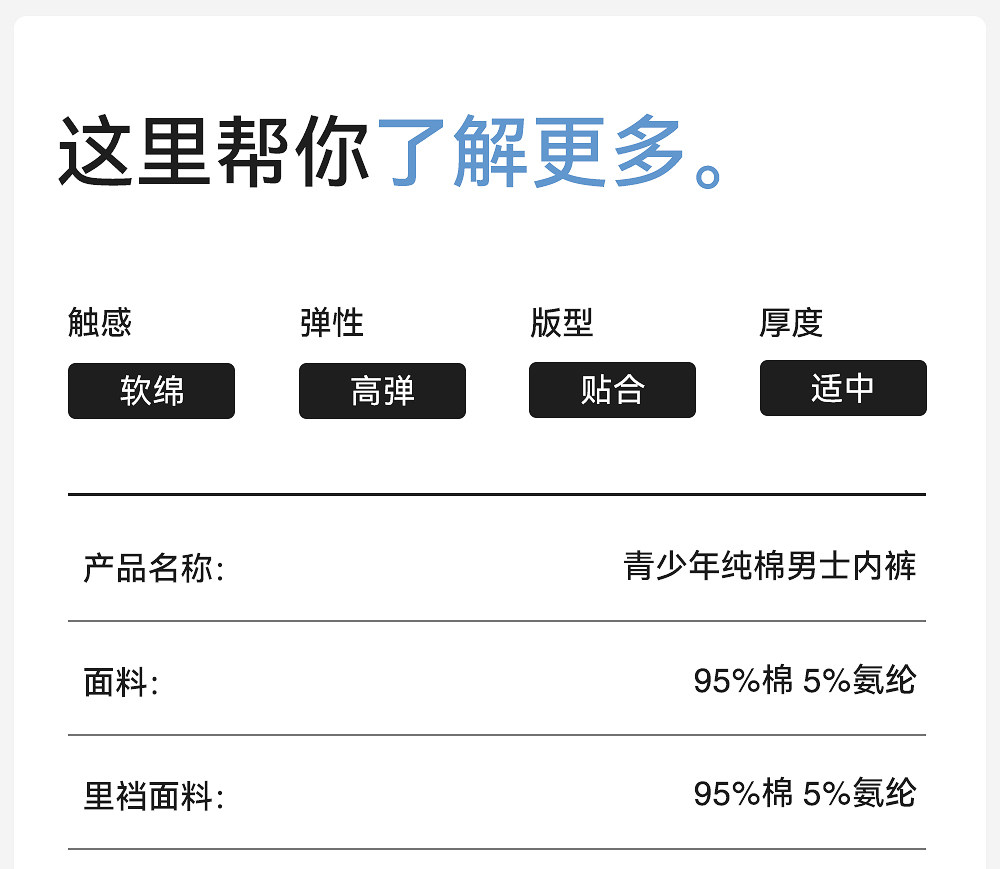 Crotch material composition Cotton 95% polyurethane elastic fiber (spandex) 5%