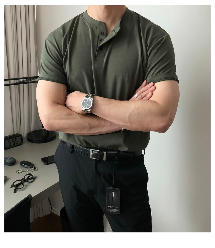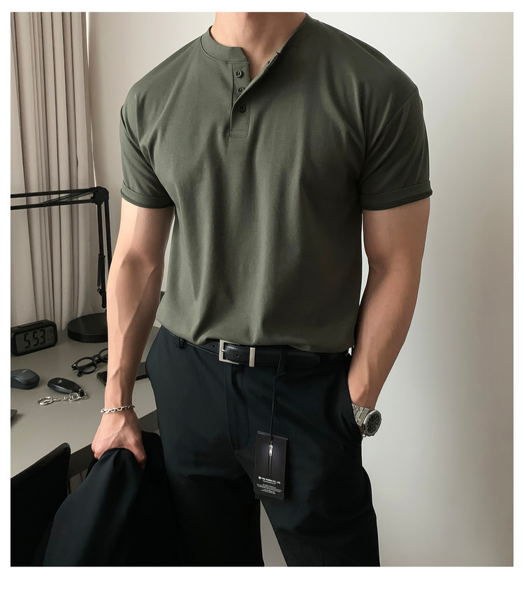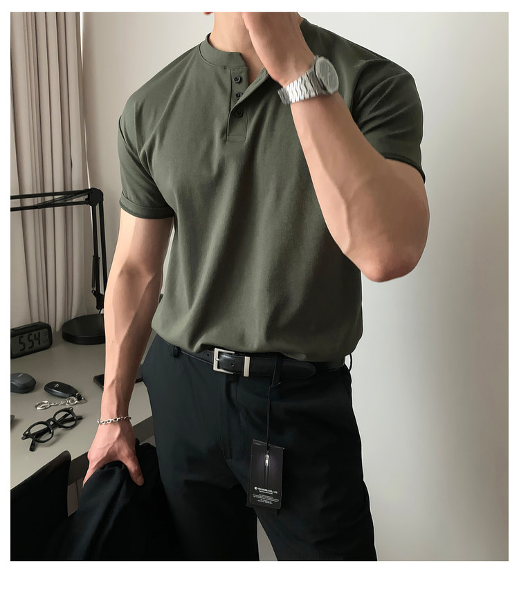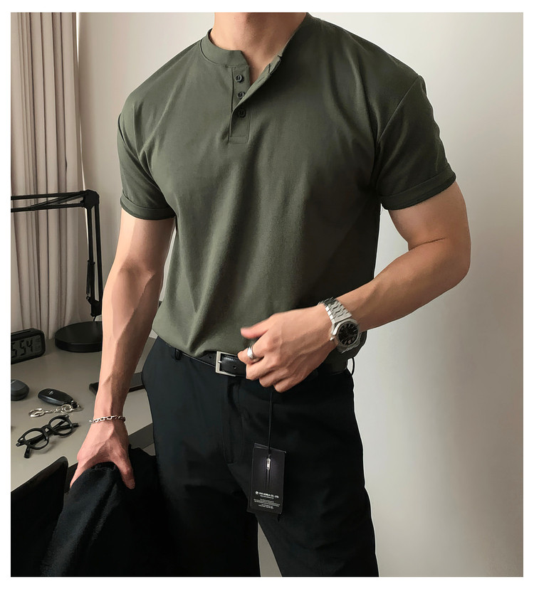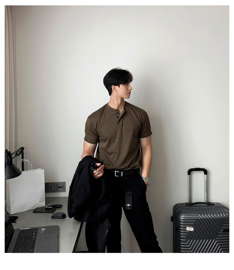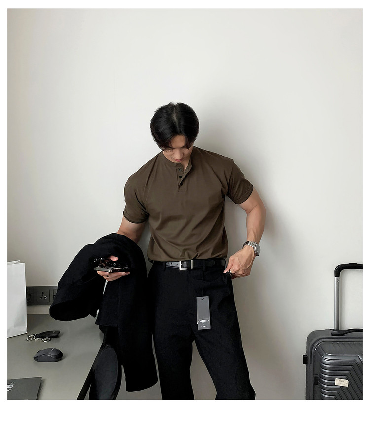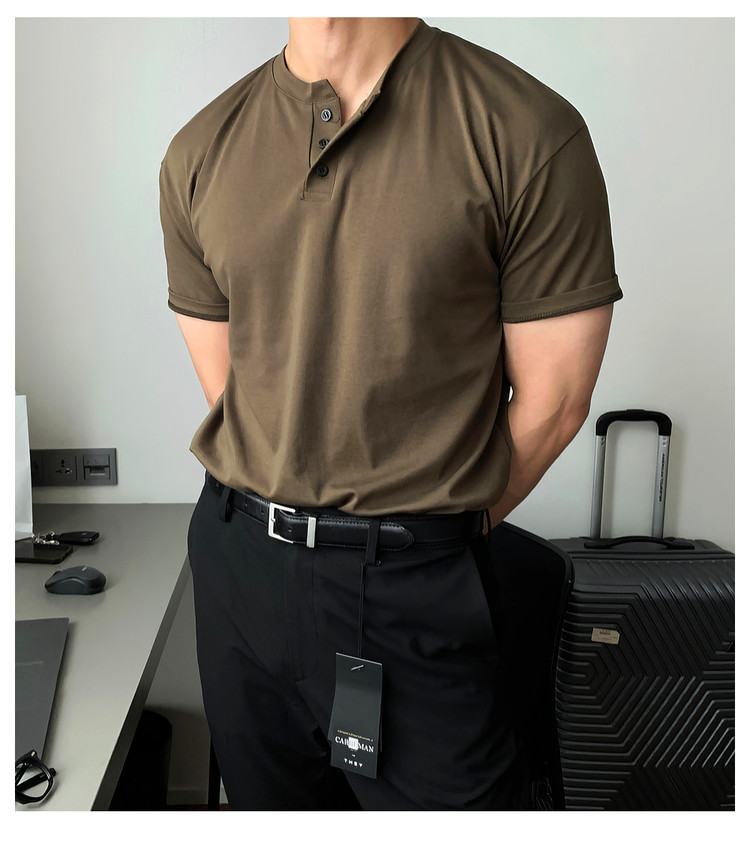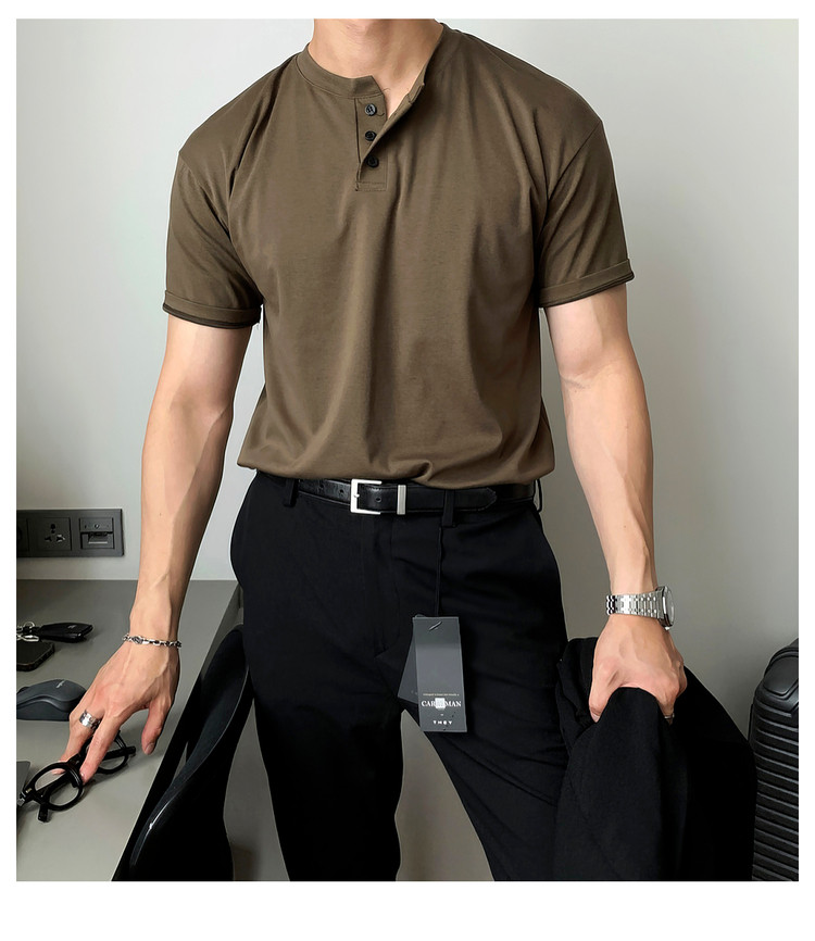 Dark brown Henry collar short-sleeved T-shirt for men, Korean retro trendy heavyweight T-shirt, simple casual and versatile top