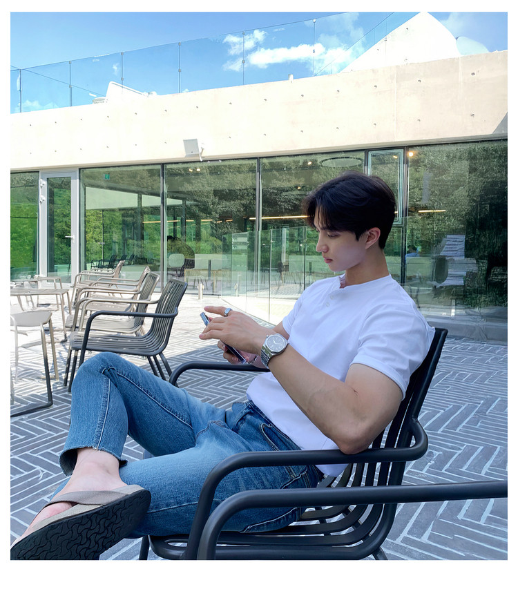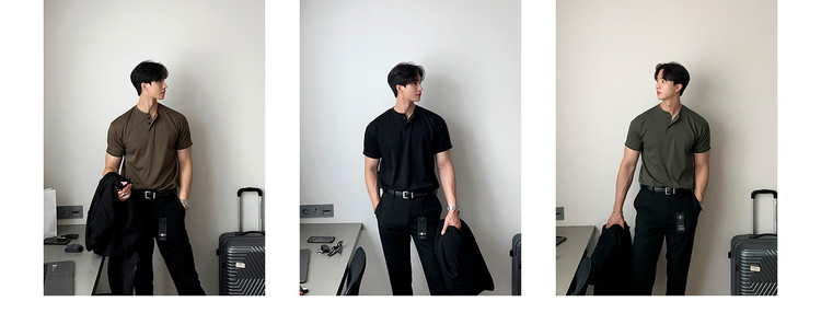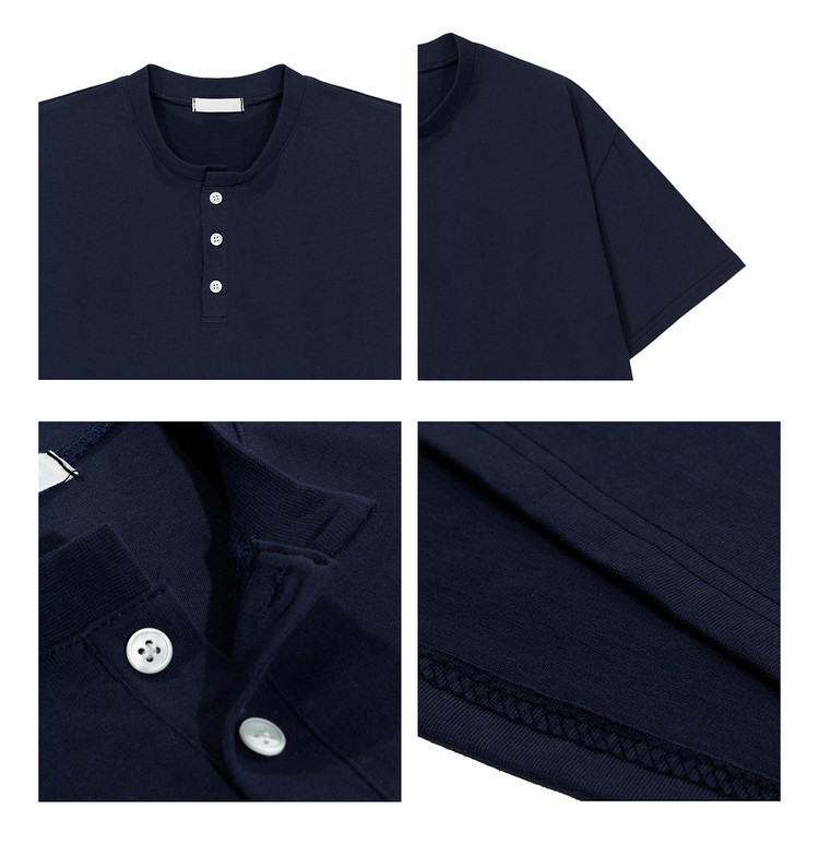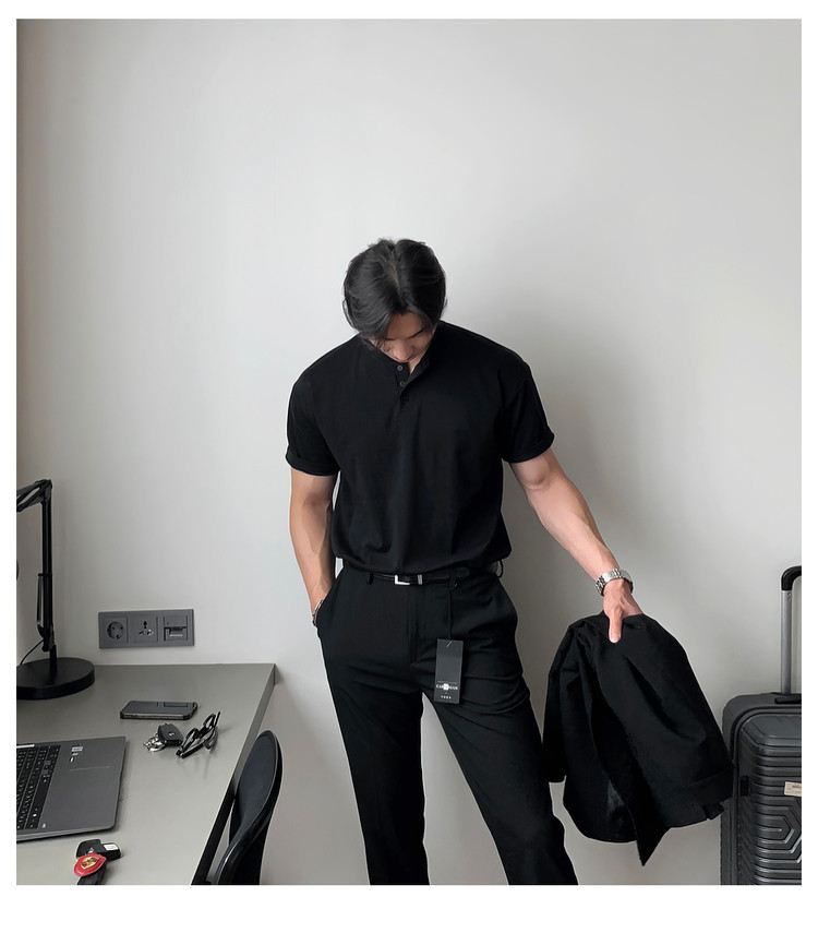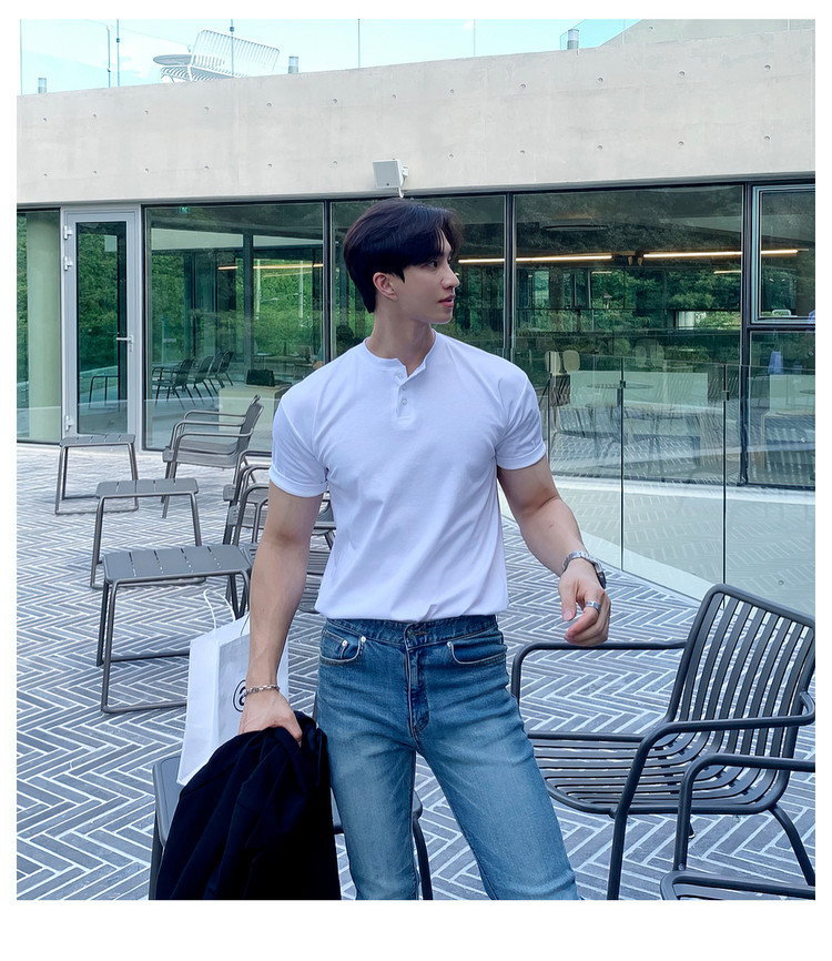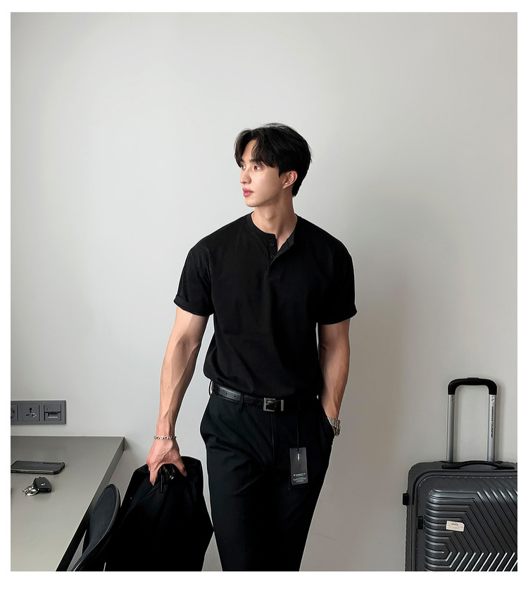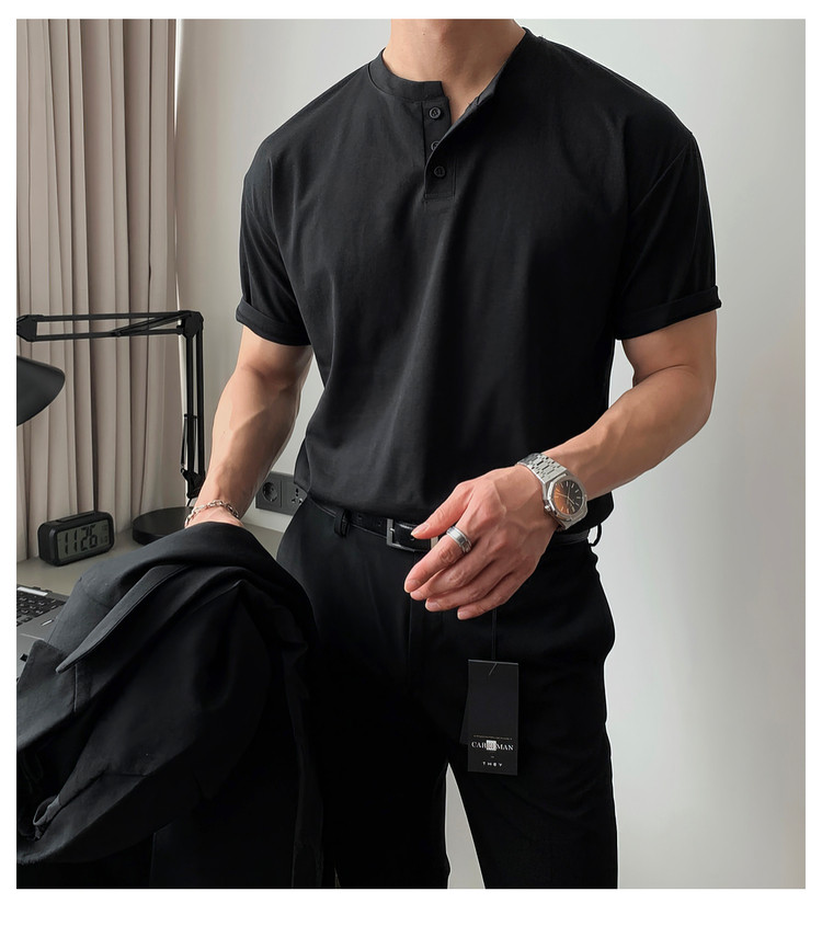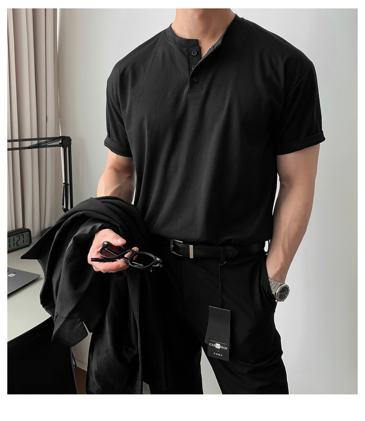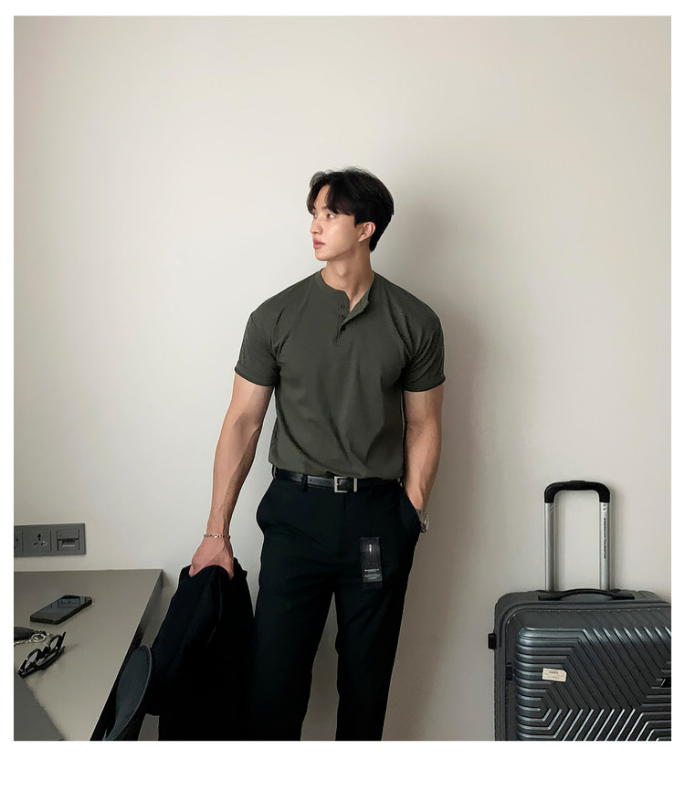 Dark brown Henry collar short-sleeved T-shirt for men, Korean retro trendy heavyweight T-shirt, simple casual and versatile top