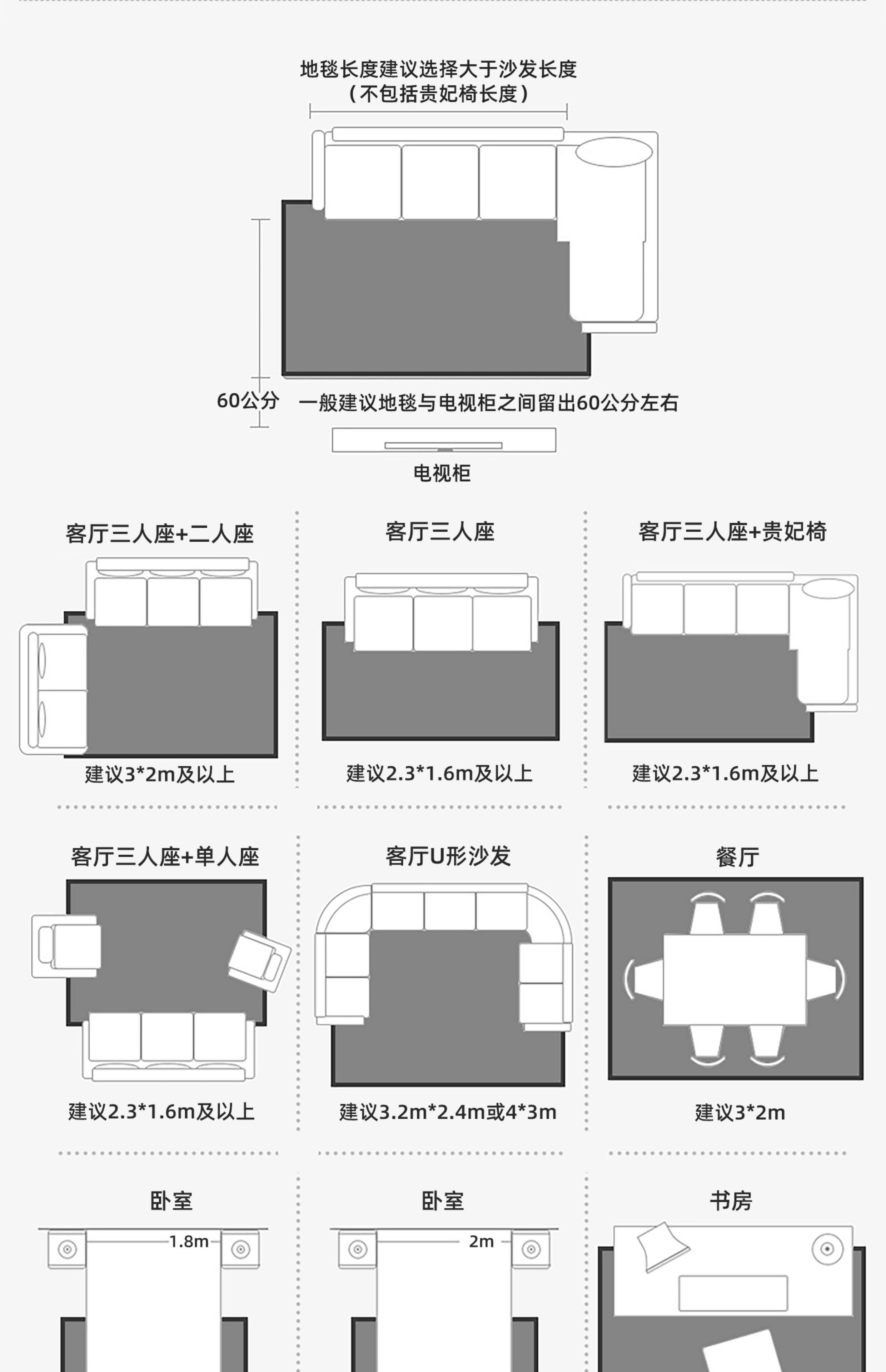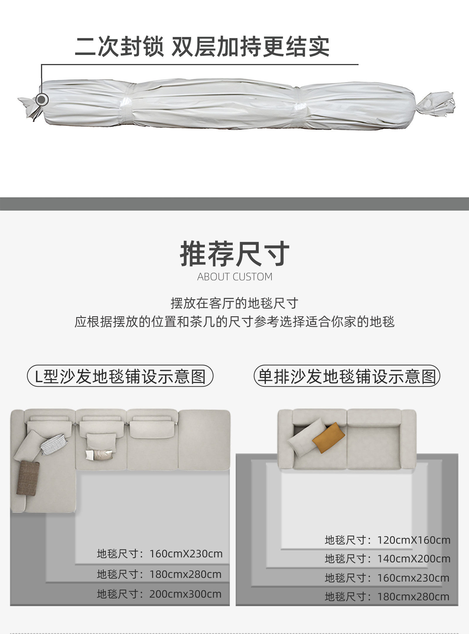 Carpet Size 140*200cm (Suitable for Small Sofa of 2-3 People),160*230cm (Suitable for 2-3 Person Sofa),180*250cm (Suitable for Small and Medium-Sized Living Rooms),180*280cm (Suitable for 3 People or L-Shaped Sofa),200*300cm (Suitable for 3 People or L-Shaped Sofa),200*340cm (Suitable for 4 People or L-Shaped Sofa),240*360cm (Suitable for 4 People or L-Shaped Sofa, Customized, Non-Refundable and Non-Exchangeable),240*400cm (Suitable for U-Shaped Sofa, Customized, Non-Refundable and Non-Exchangeable),300*400cm (Suitable for 4 People or L-Shaped Sofa, Customized, Non-Refundable and Non-Exchangeable),300*450cm (Suitable for U-Shaped Sofa, Customized, Non-Refundable and Non-Exchangeable)