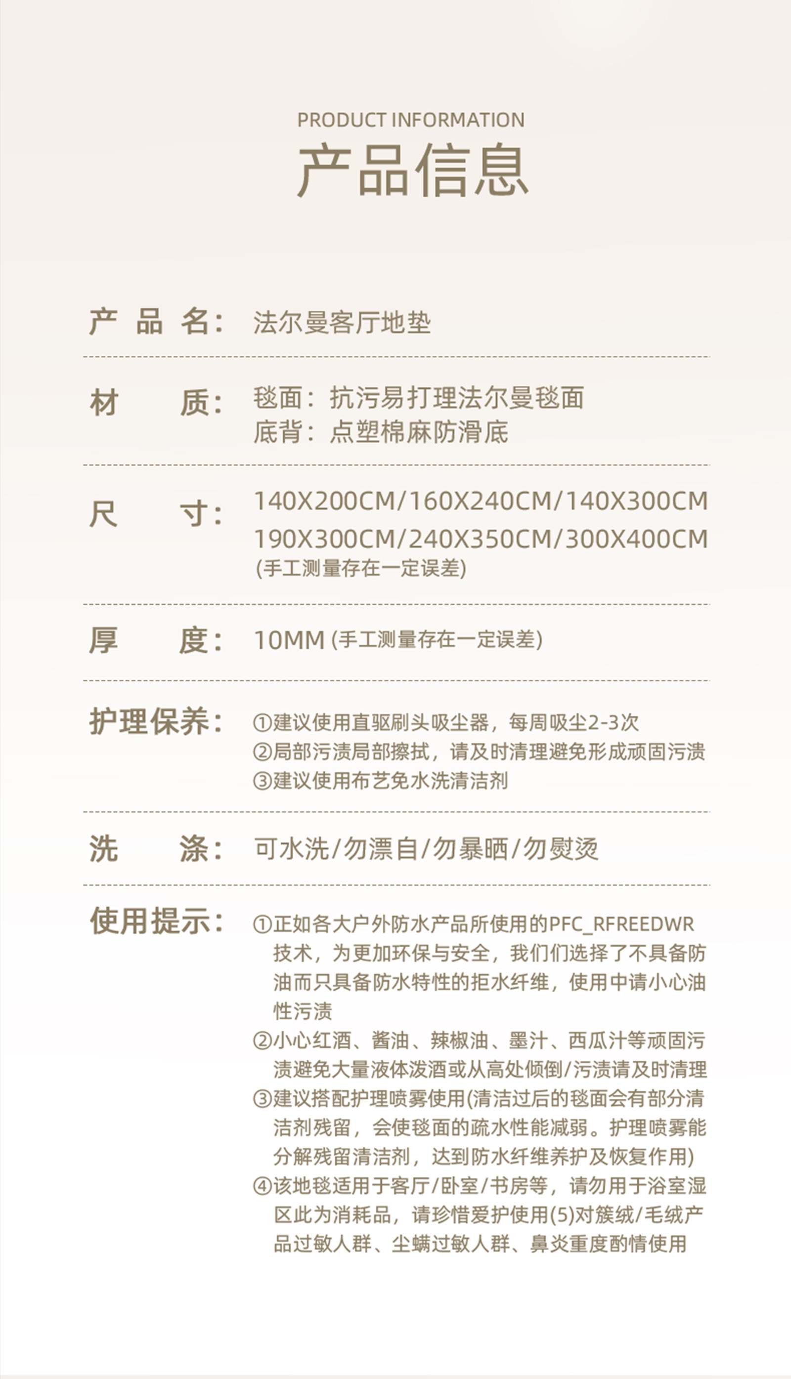 Carpet size 140cm*200cm, no odor, no lint, 0 formaldehyde,160cm*230cm genuine original designer style,180cm*250cm wipeable and easy to clean,180cm*280cm thick encrypted plush,200cm*300cm recommended size to collect and purchase,200cm*340cm soft and skin-friendly, comfortable on the feet,240cm*360cm carpet surface is flat and easy to care for,240cm*400cm, upgraded waterproof, worry-free care,300cm*400cm larger size please consult customer service,300cm*450cm customized size, non-refundable and non-exchangeable