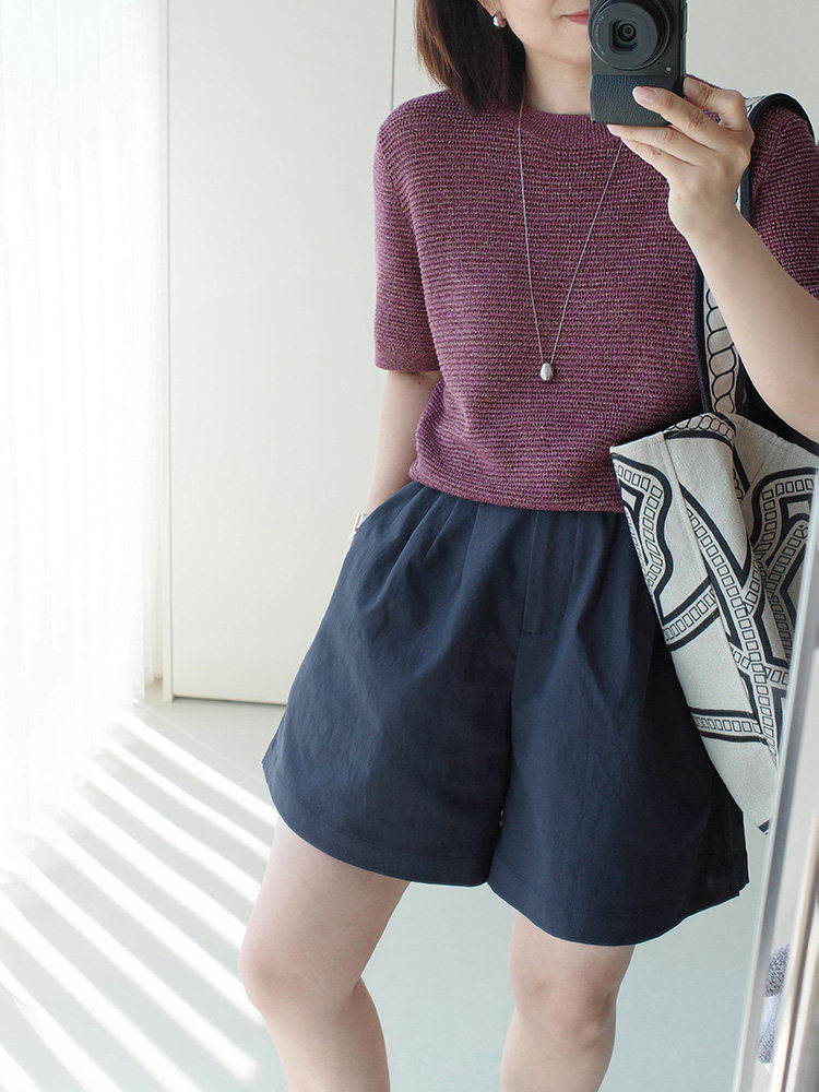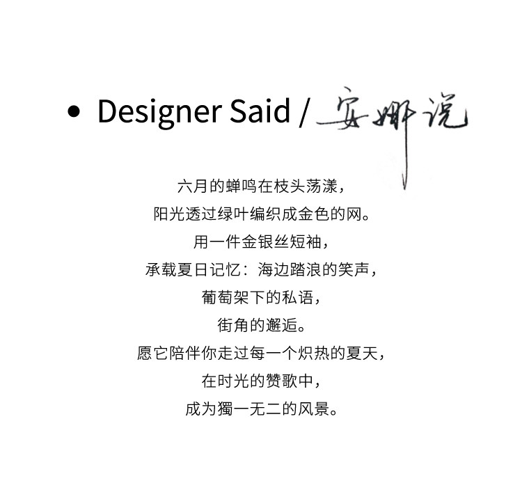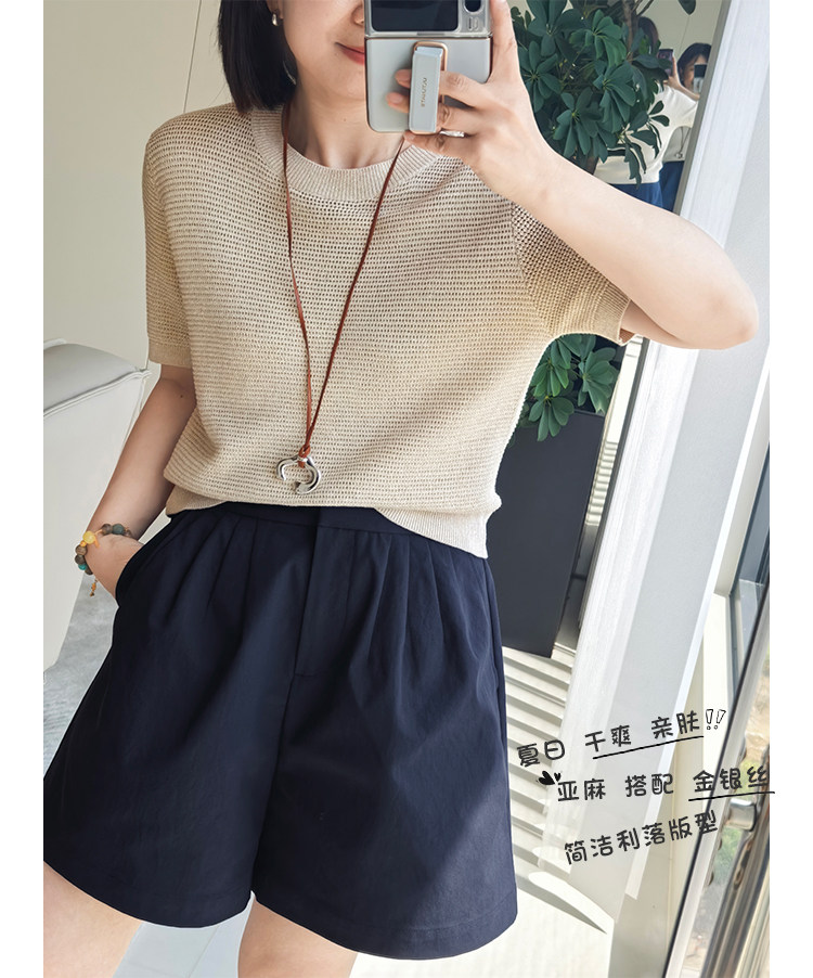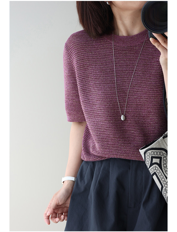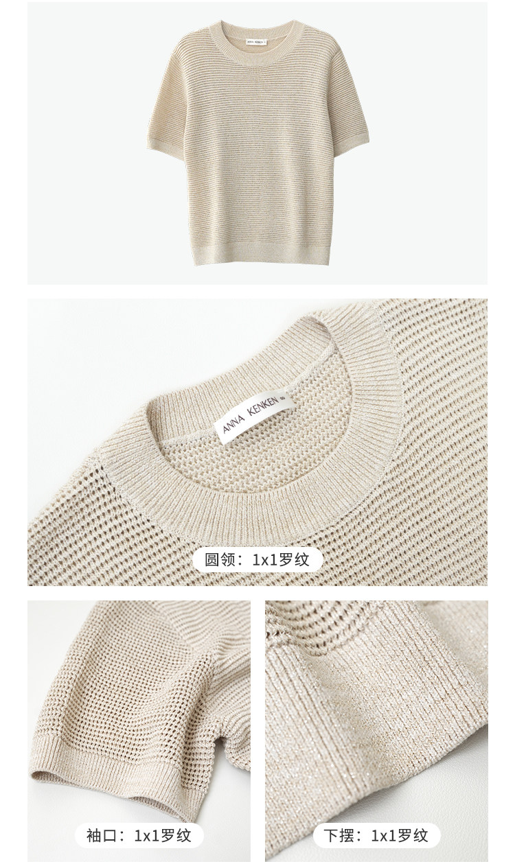 Anna's Time Hymn Linen Gold and Silver Thread Perforated Elegant Versatile Round Neck Stretch Knit Short Sleeve Women's Top
