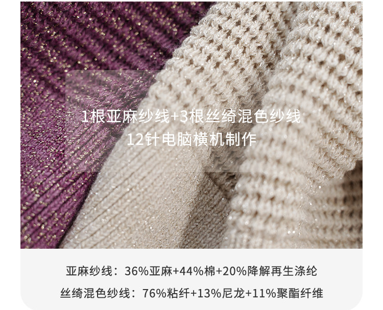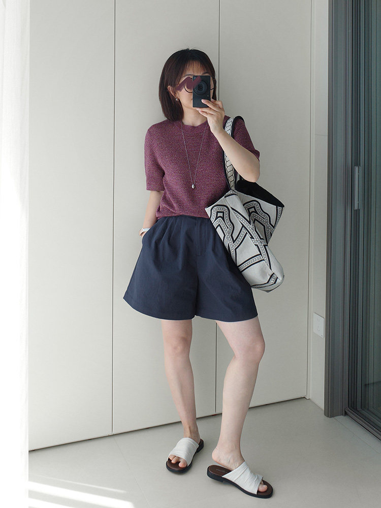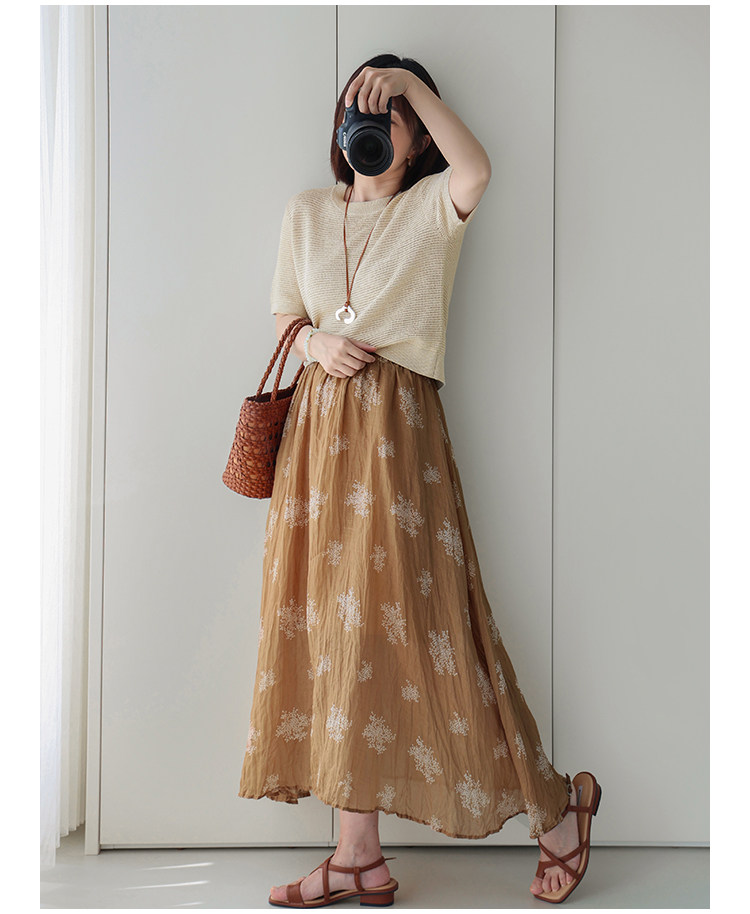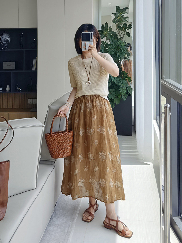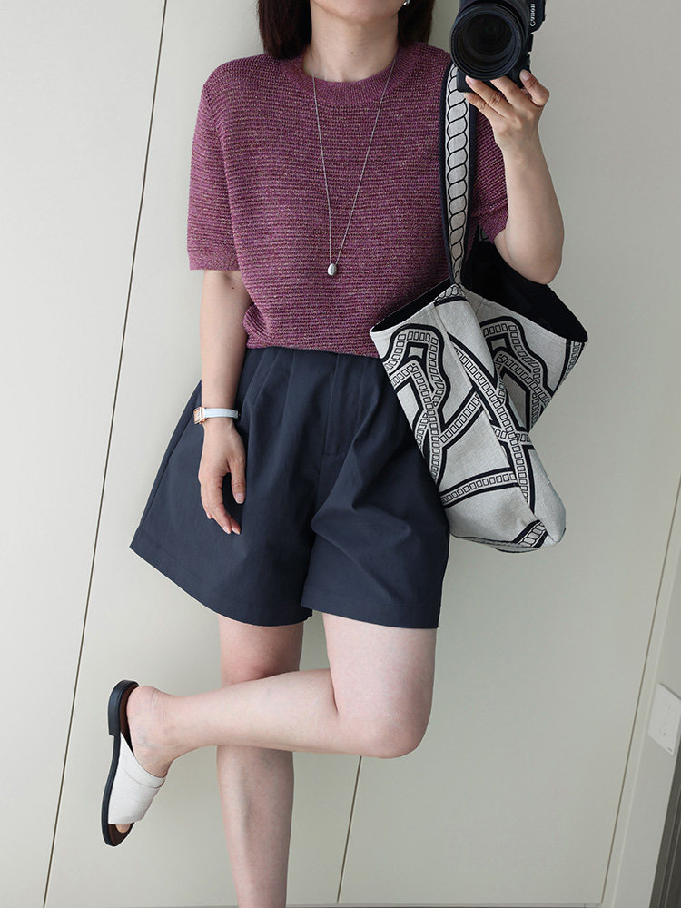 Anna's Time Hymn Linen Gold and Silver Thread Perforated Elegant Versatile Round Neck Stretch Knit Short Sleeve Women's Top