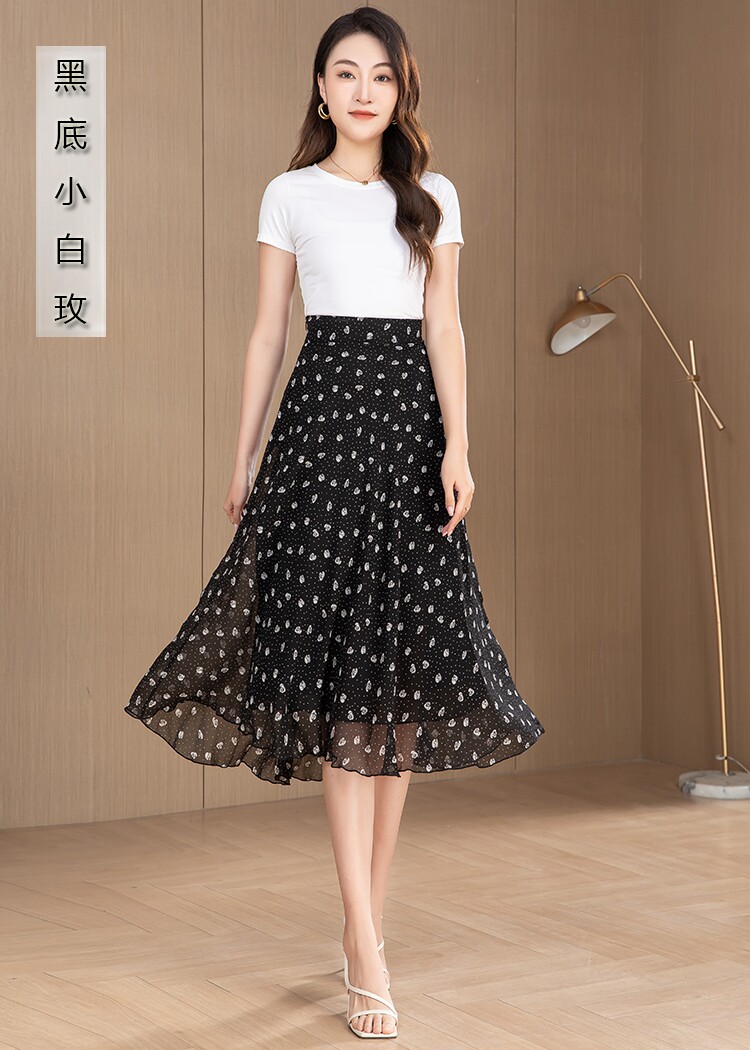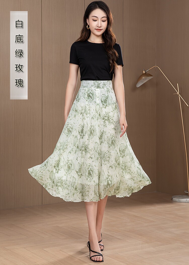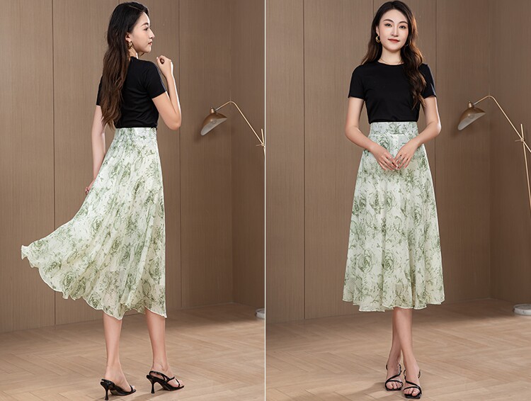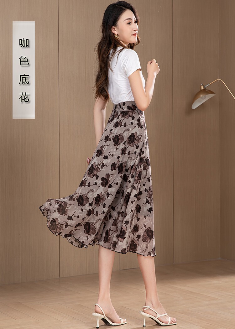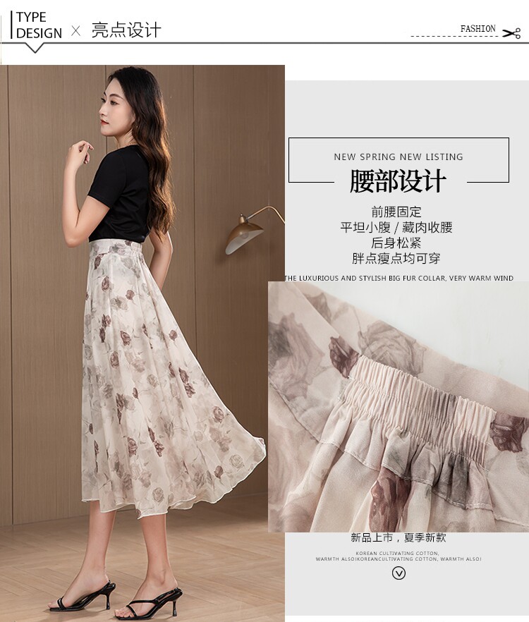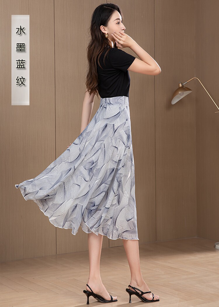 Skirt Women's Summer Mid-Length New Style Fresh Printed A-Line Skirt Slimming Look over the Knee Draped Holiday Chiffon Women's Mid-Skirt