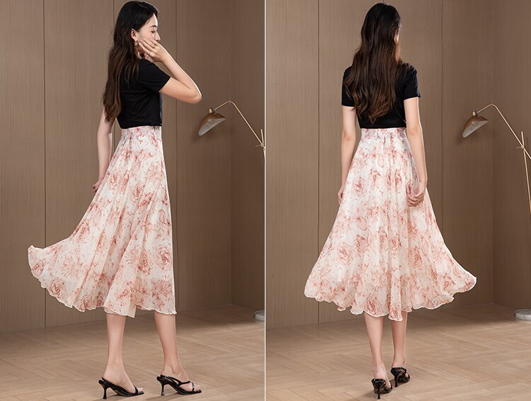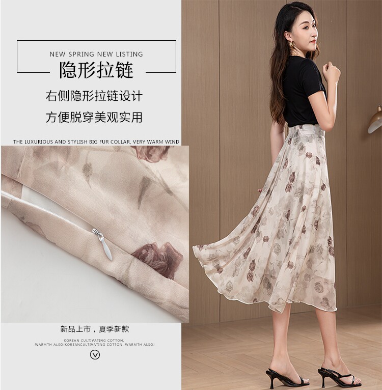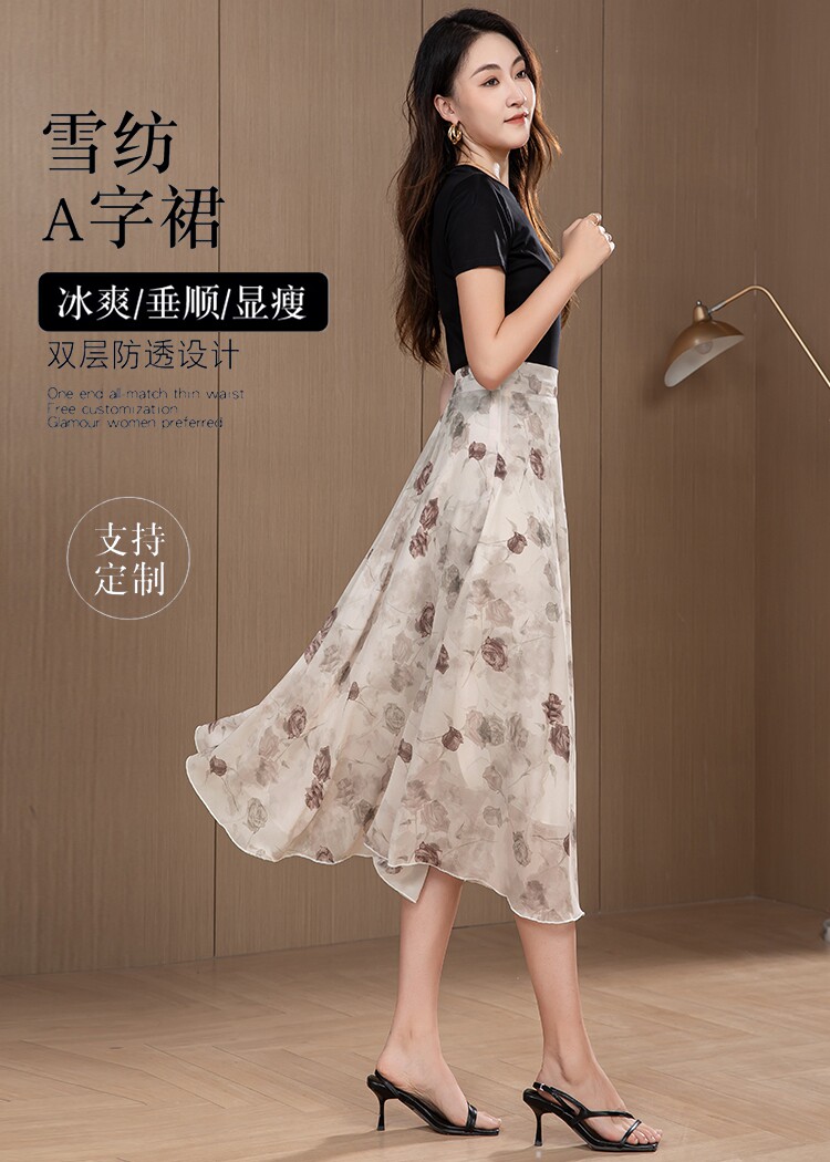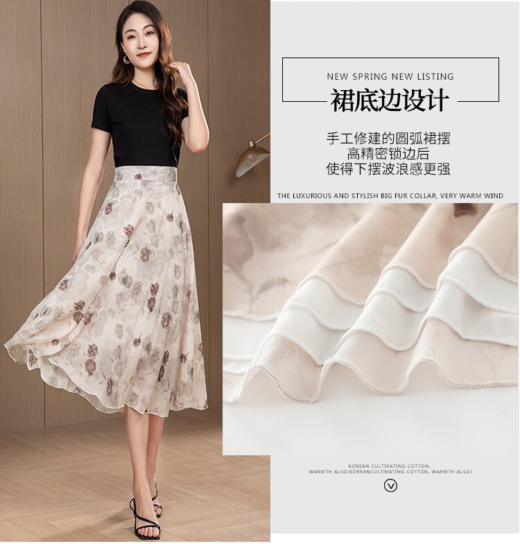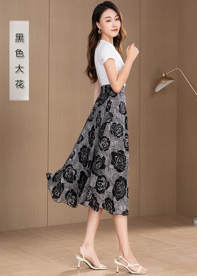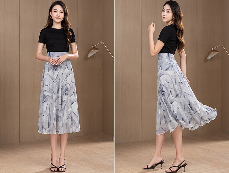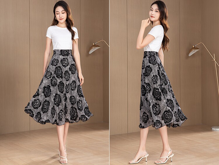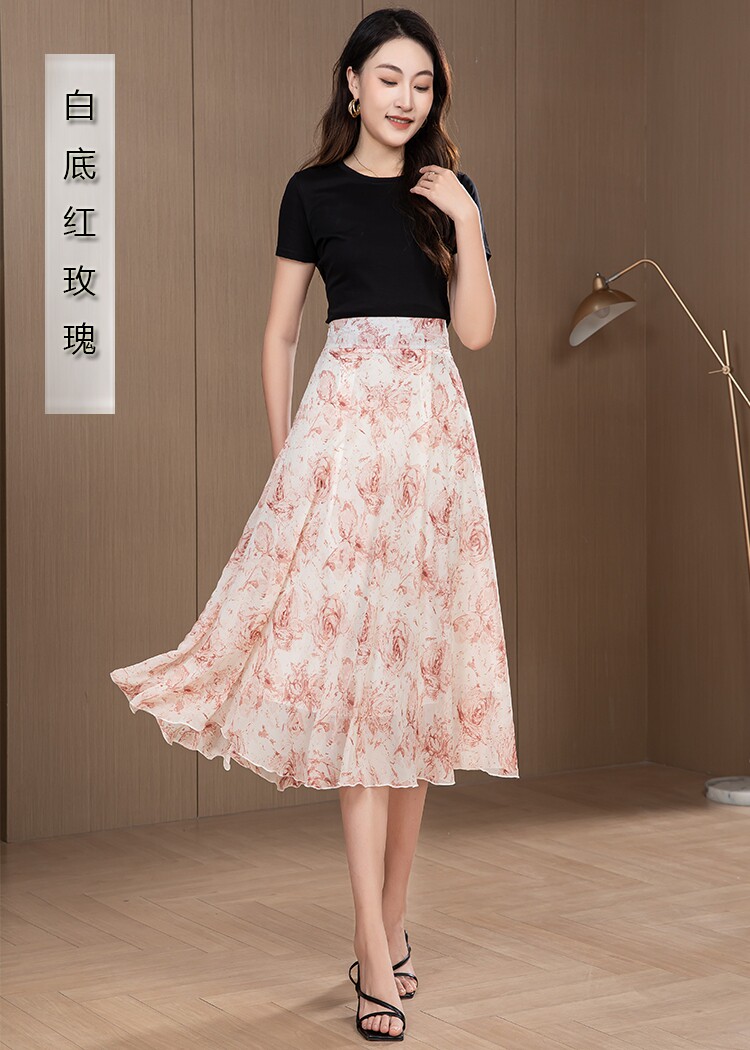 Skirt Women's Summer Mid-Length New Style Fresh Printed A-Line Skirt Slimming Look over the Knee Draped Holiday Chiffon Women's Mid-Skirt