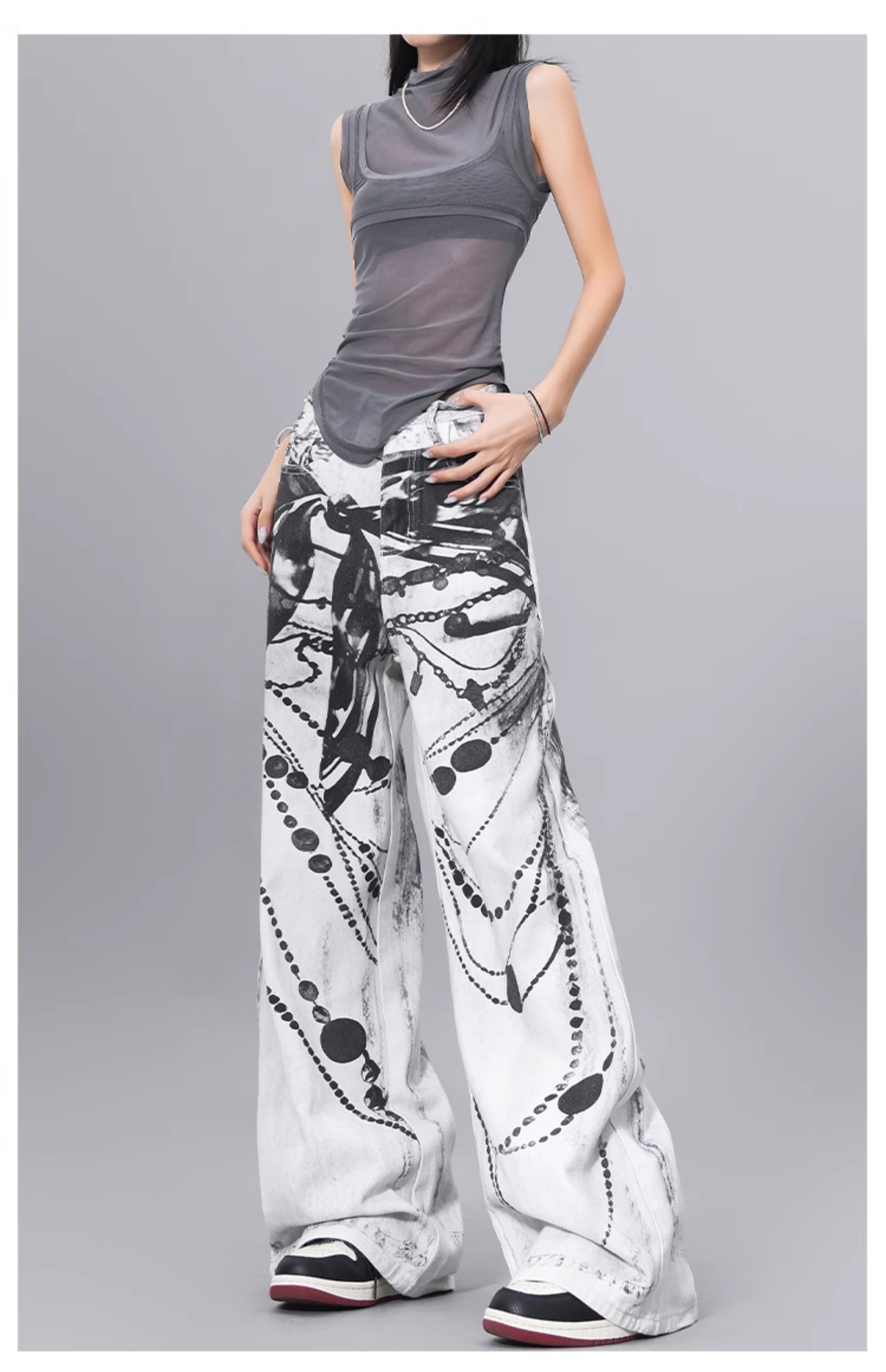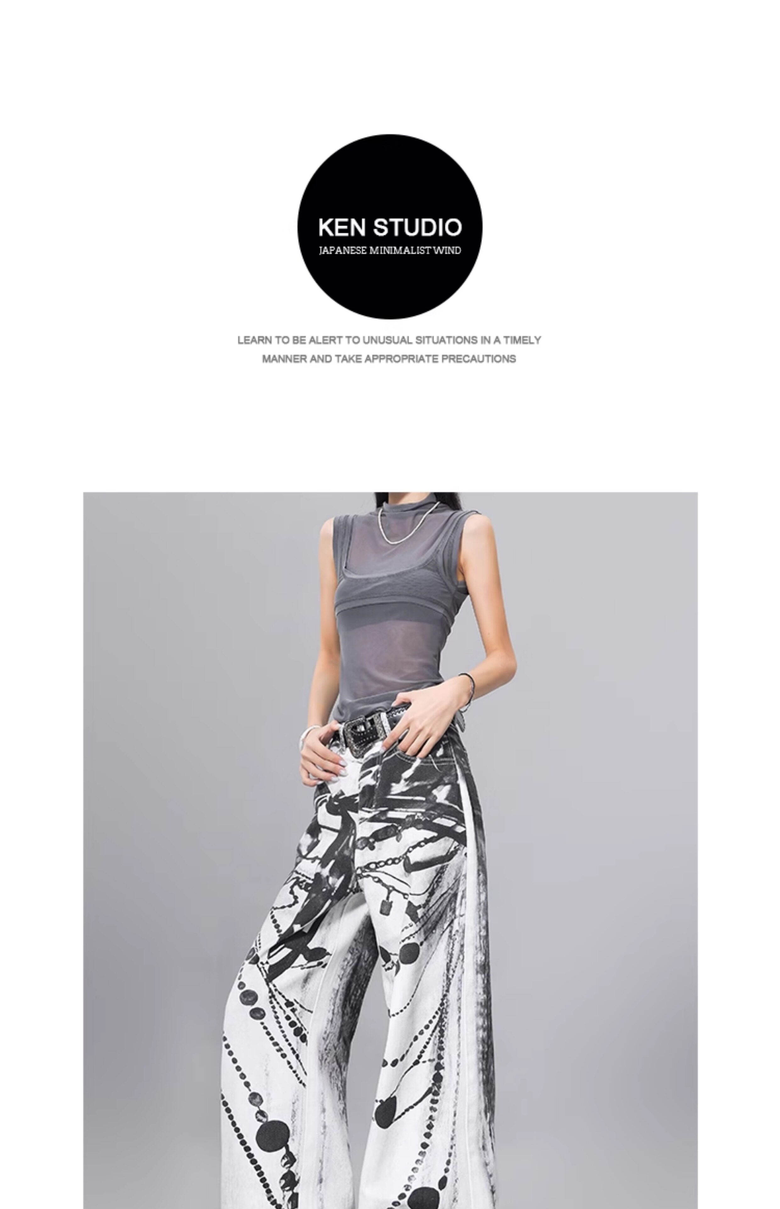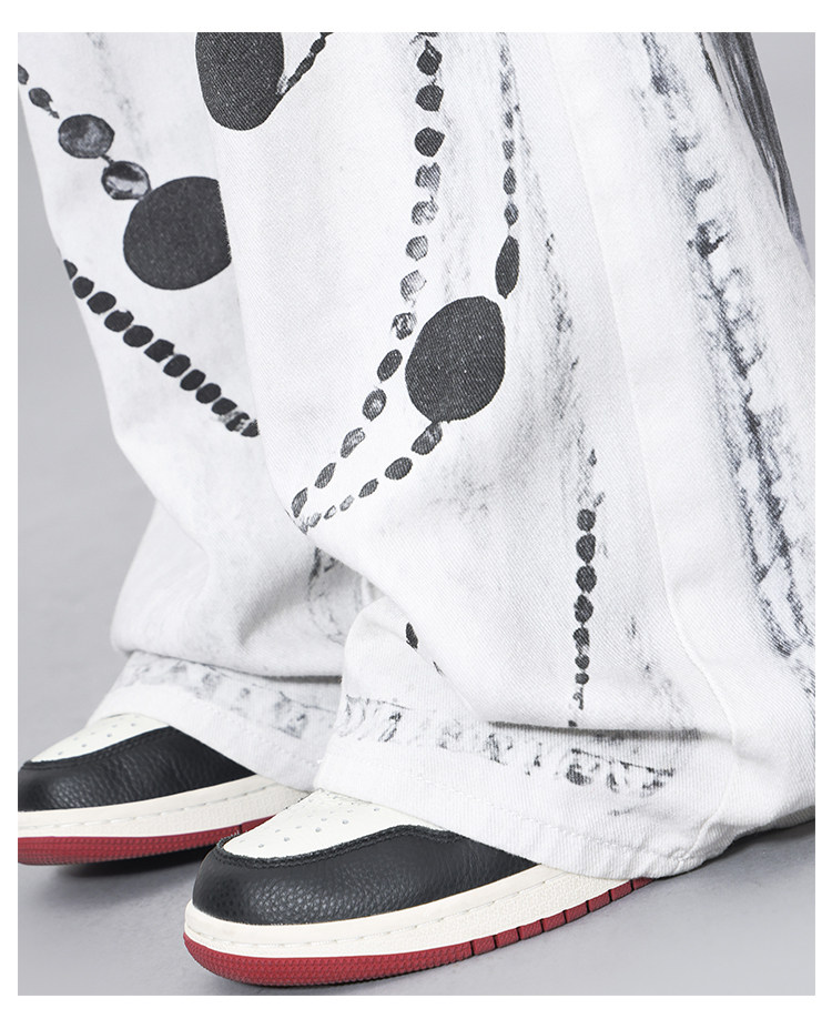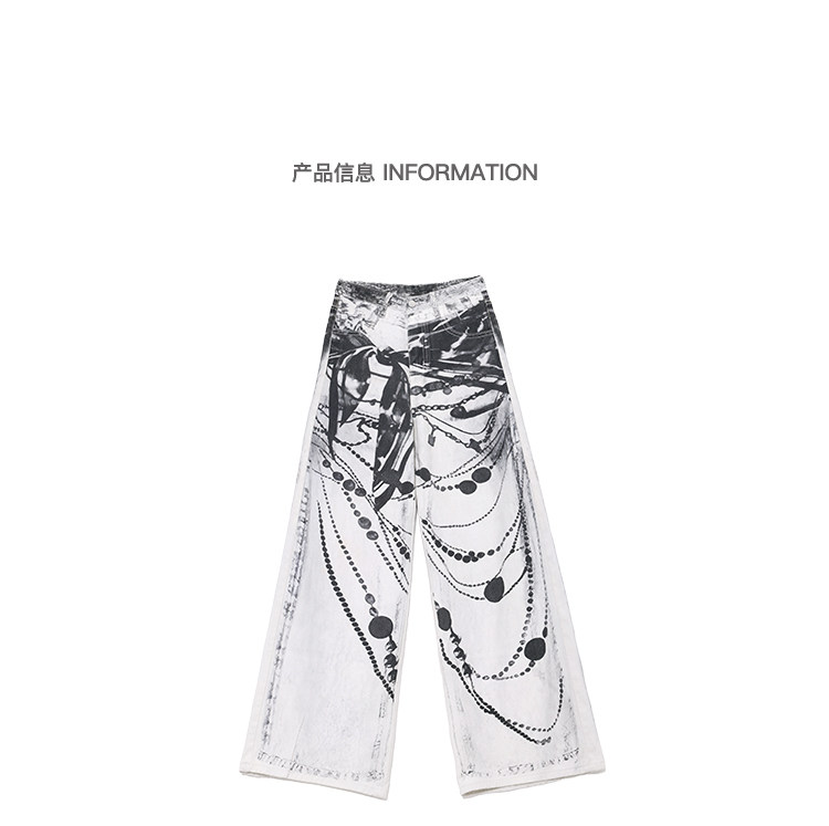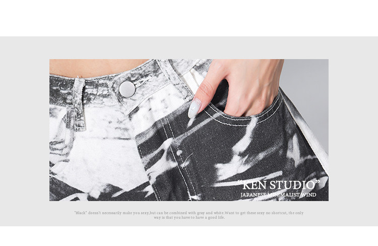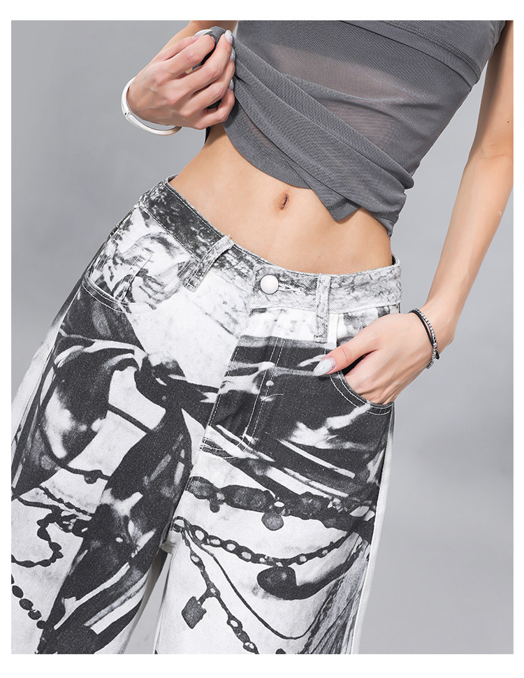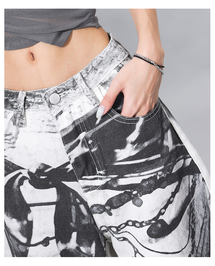 Ken Studio Ink Print Design Washed Jeans for Women Summer Street High-Waisted Loose Slimming Pants