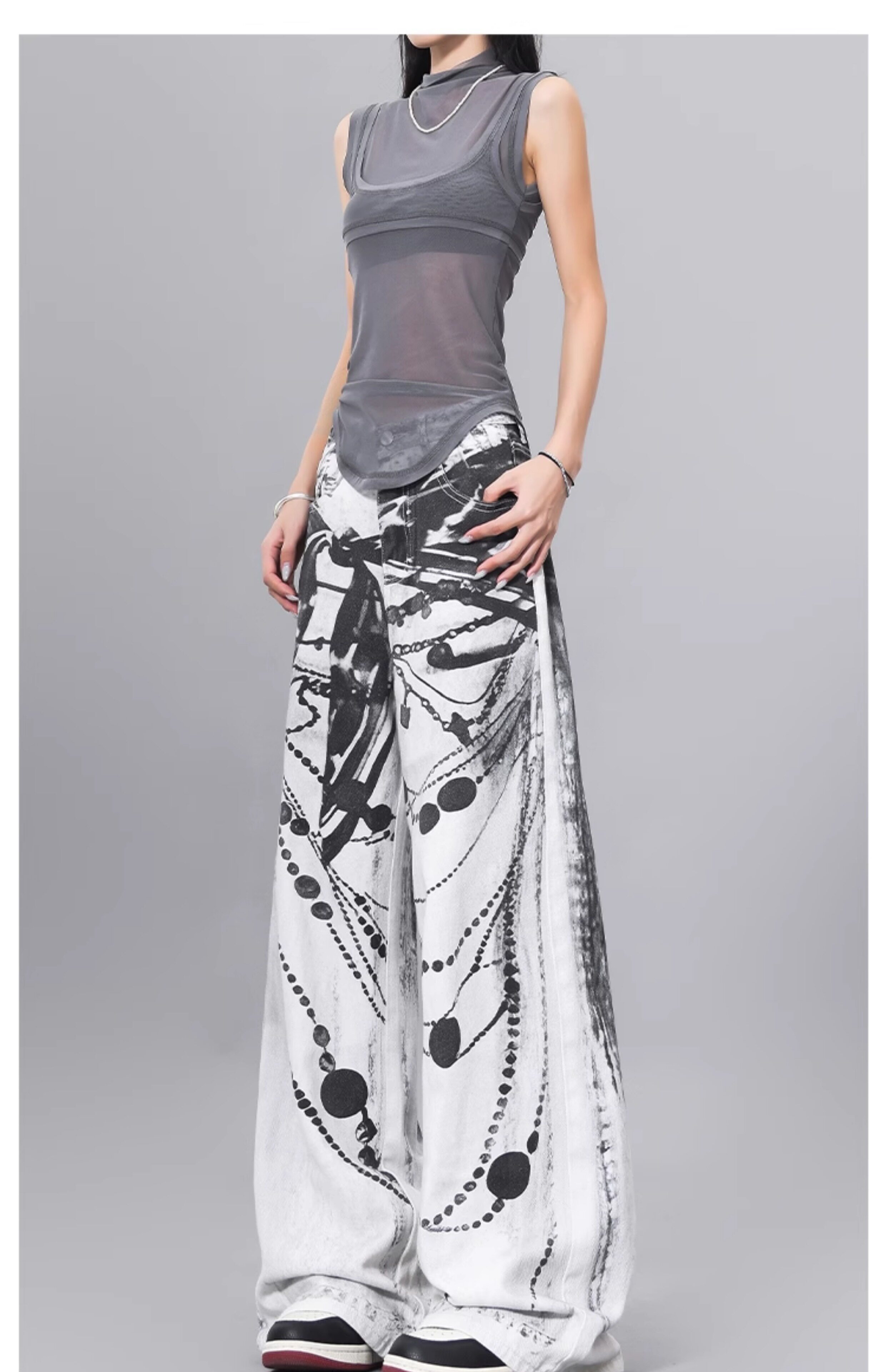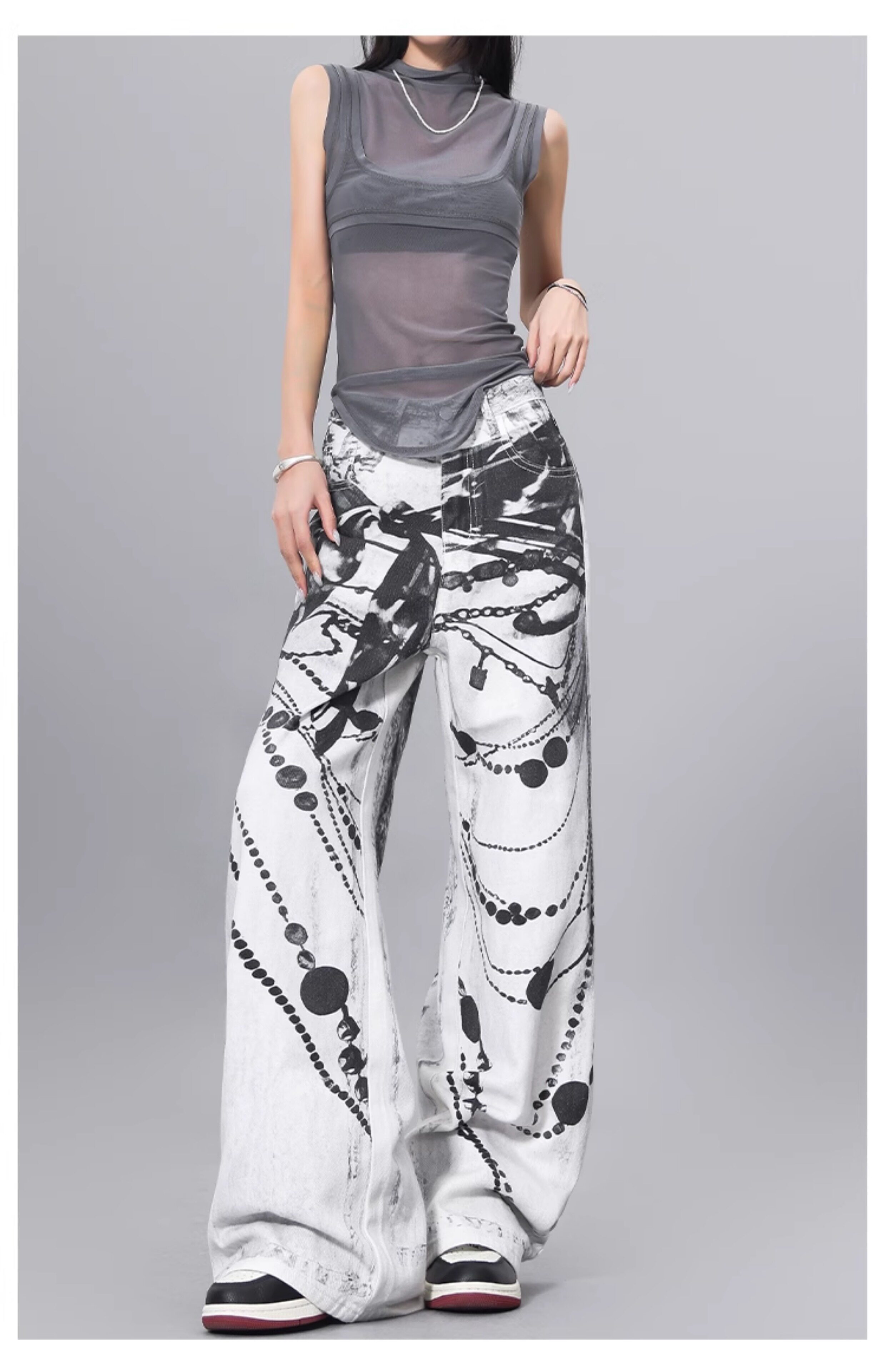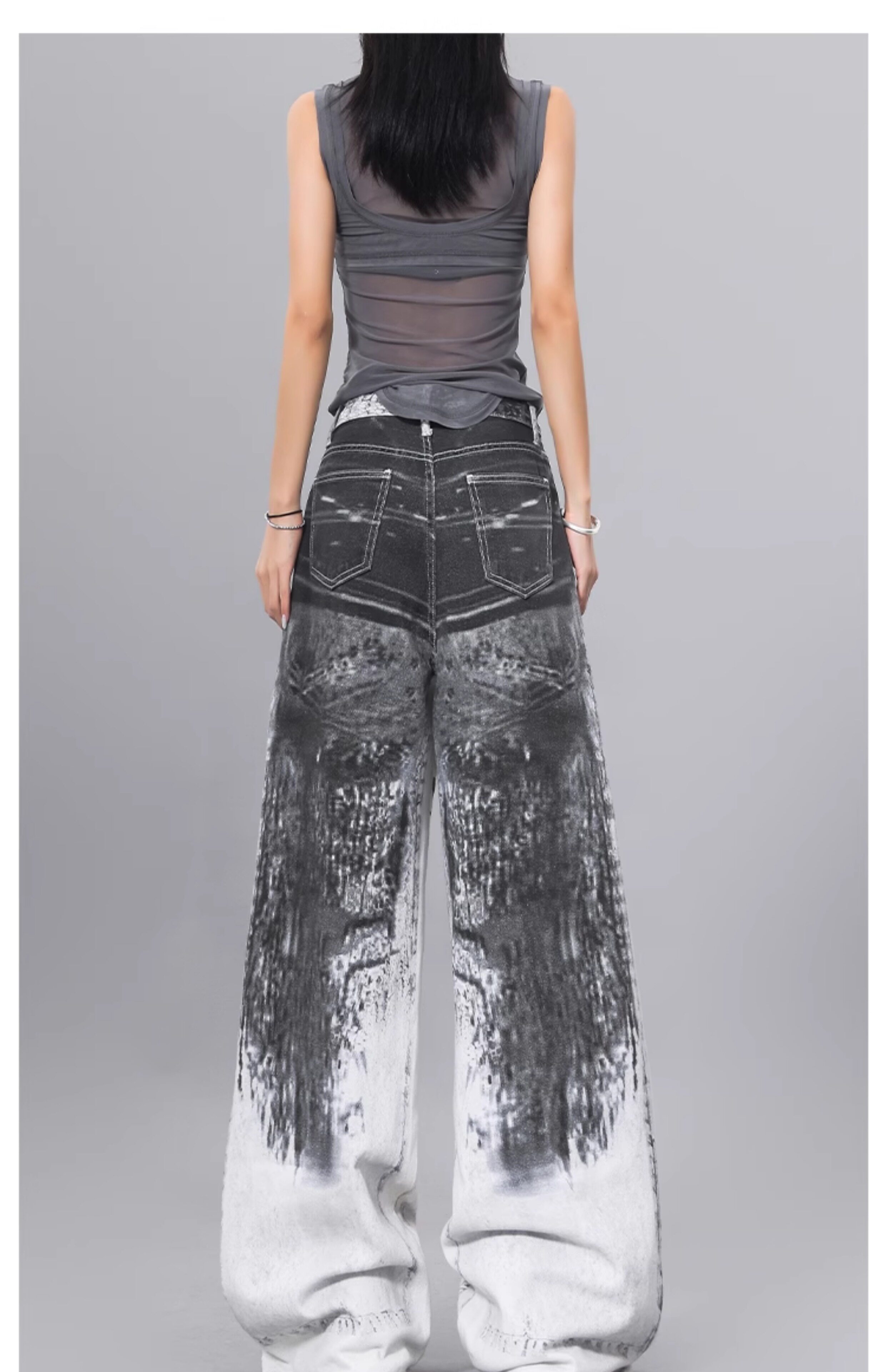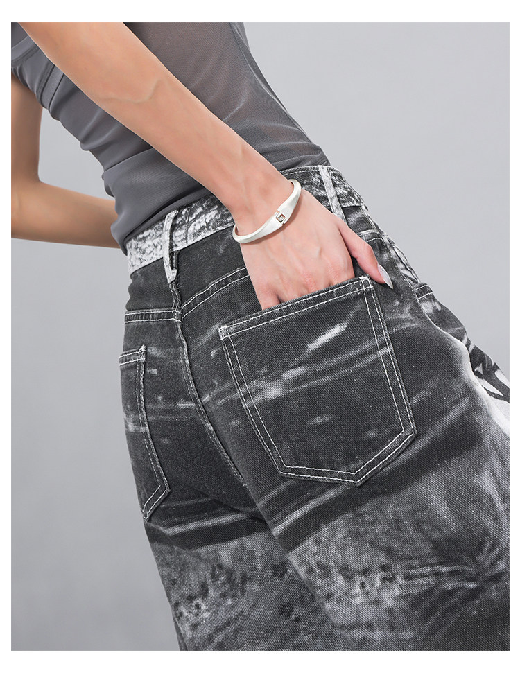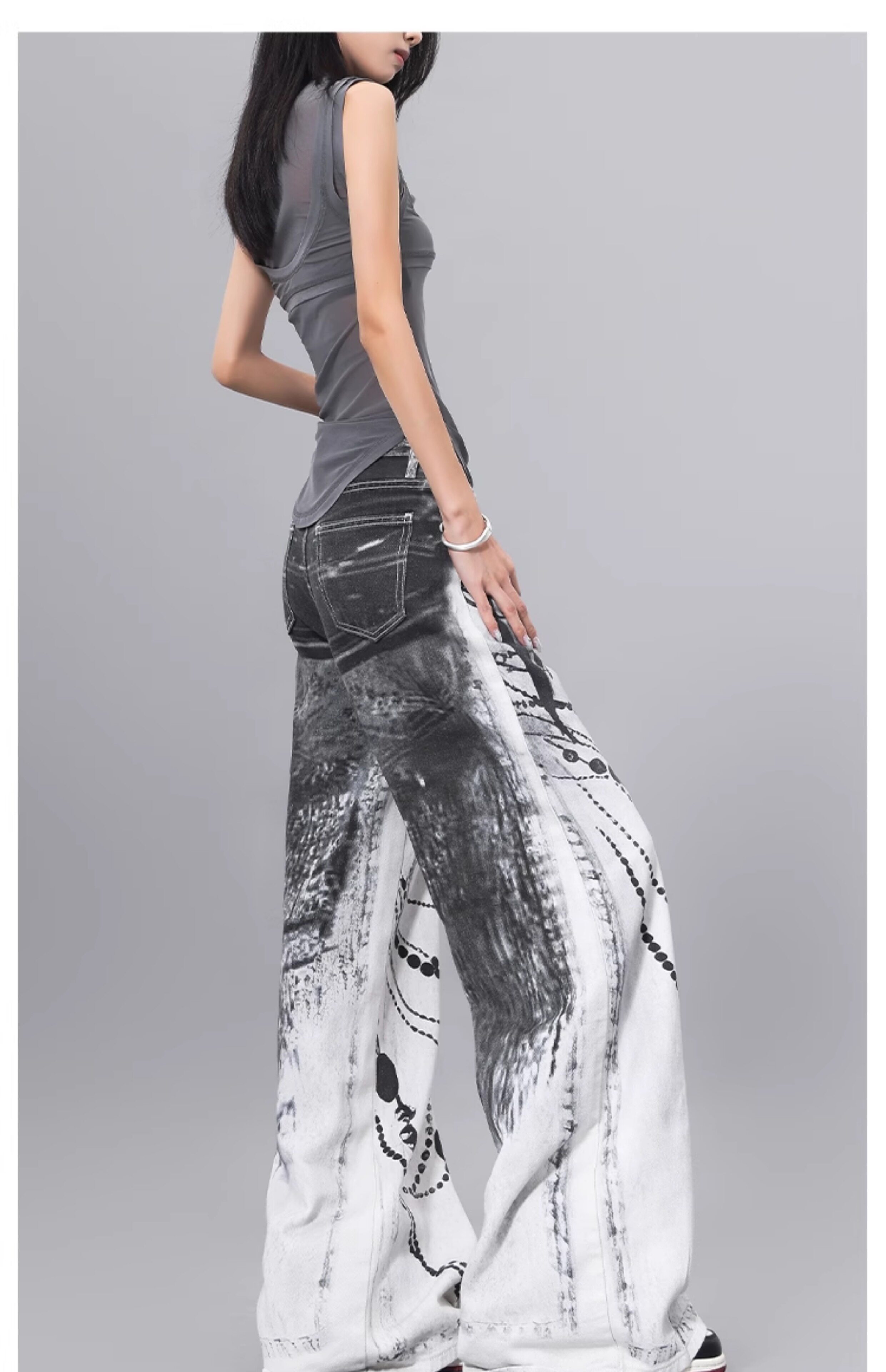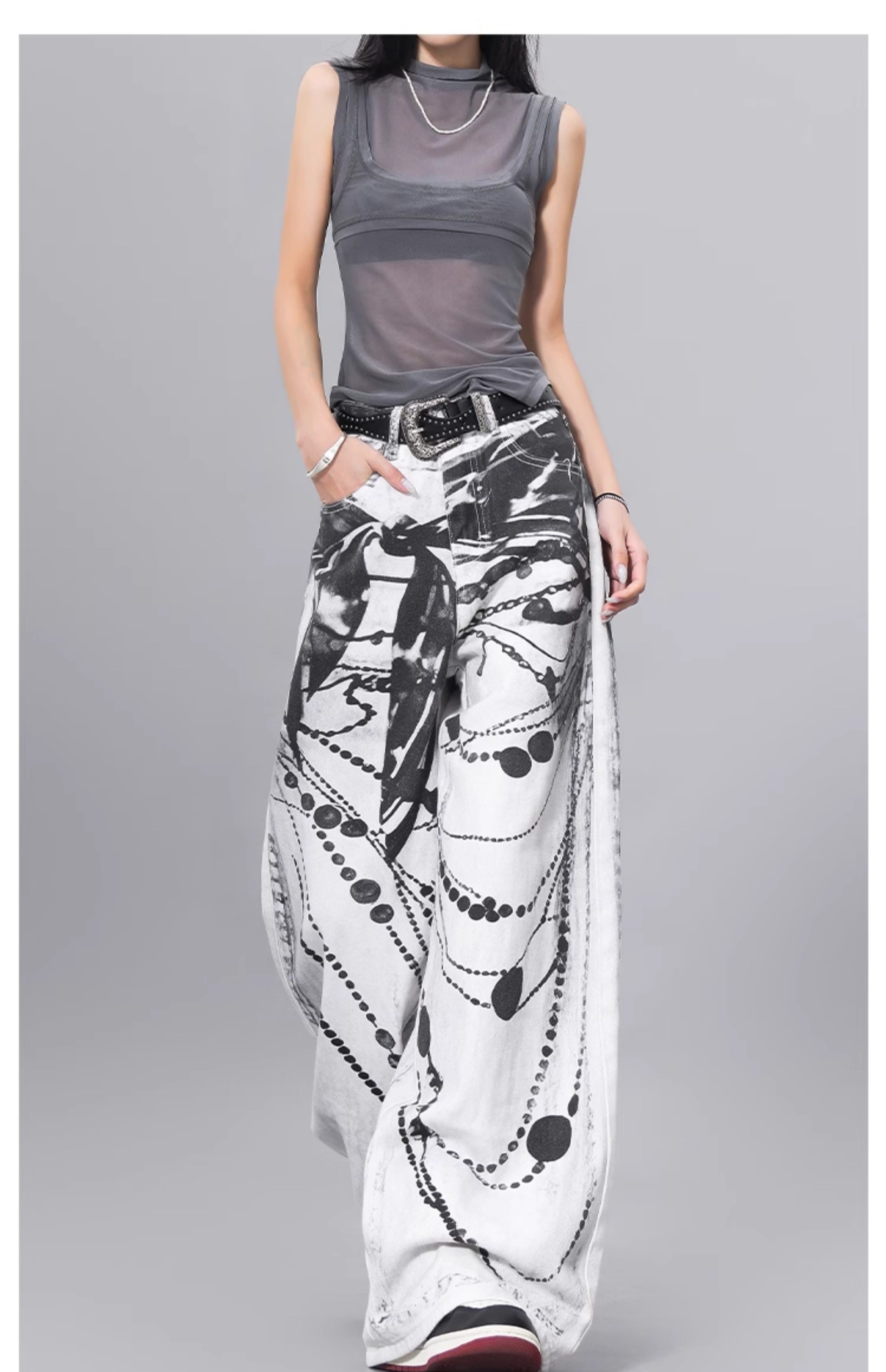 Ken Studio Ink Print Design Washed Jeans for Women Summer Street High-Waisted Loose Slimming Pants
