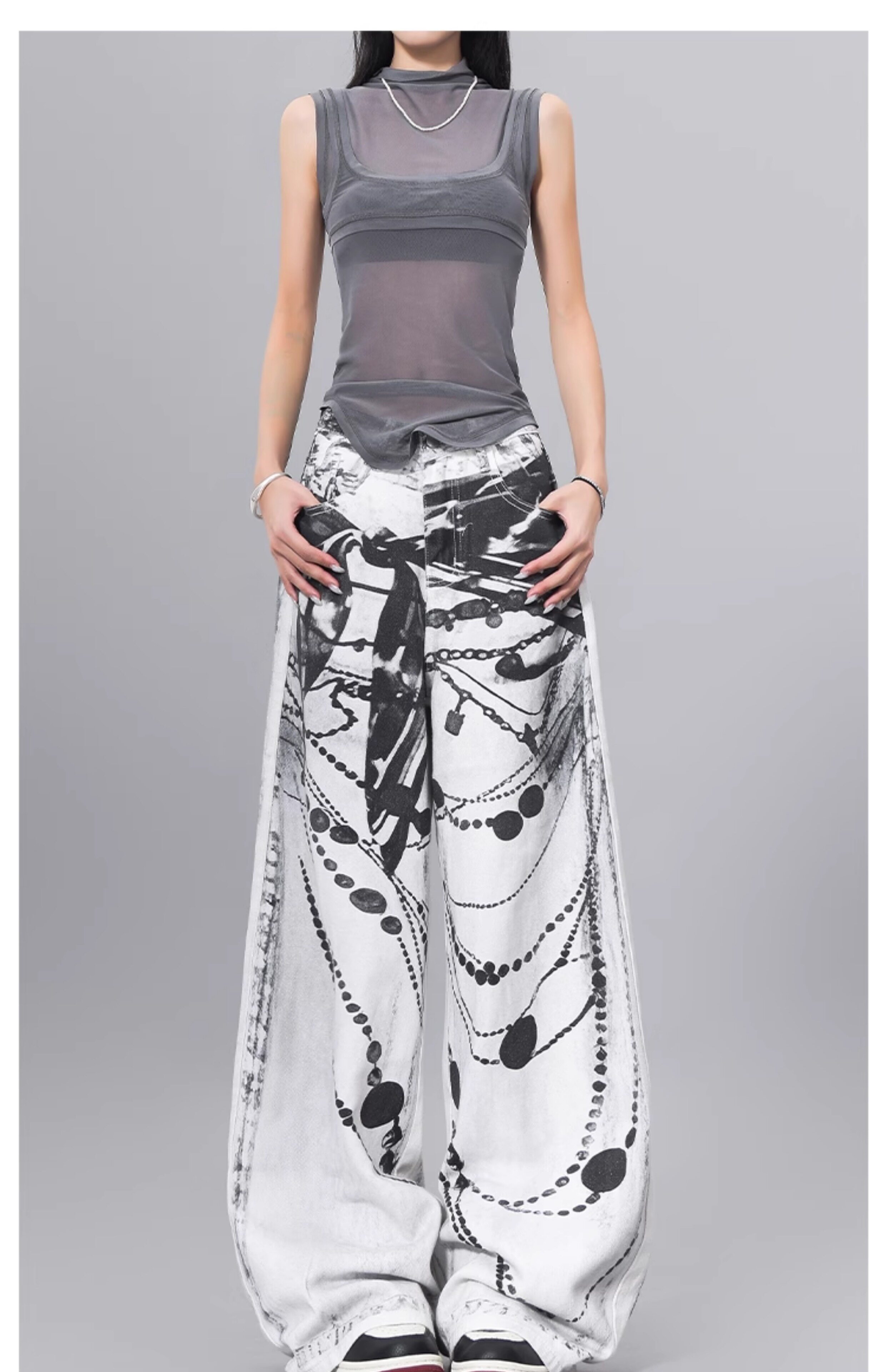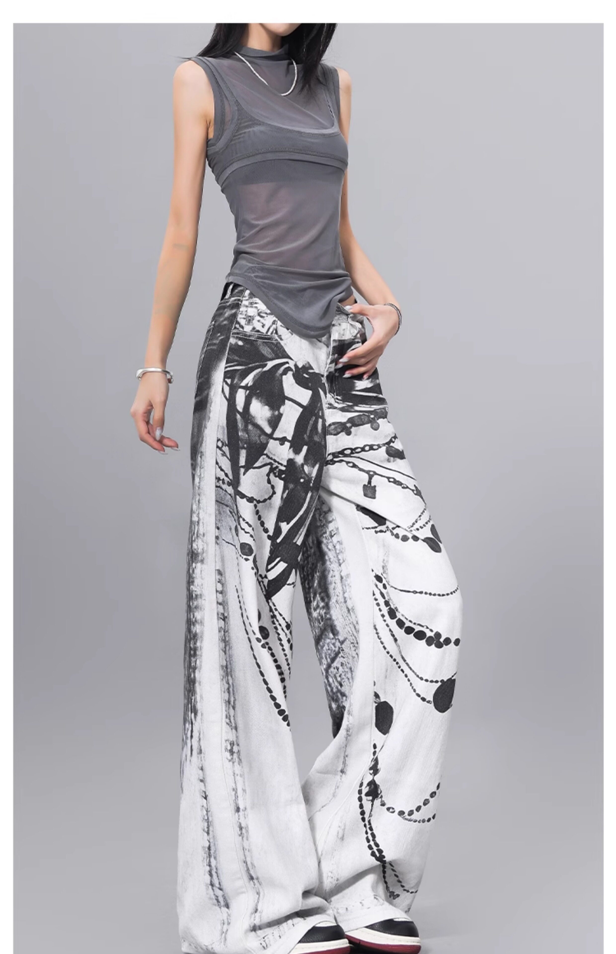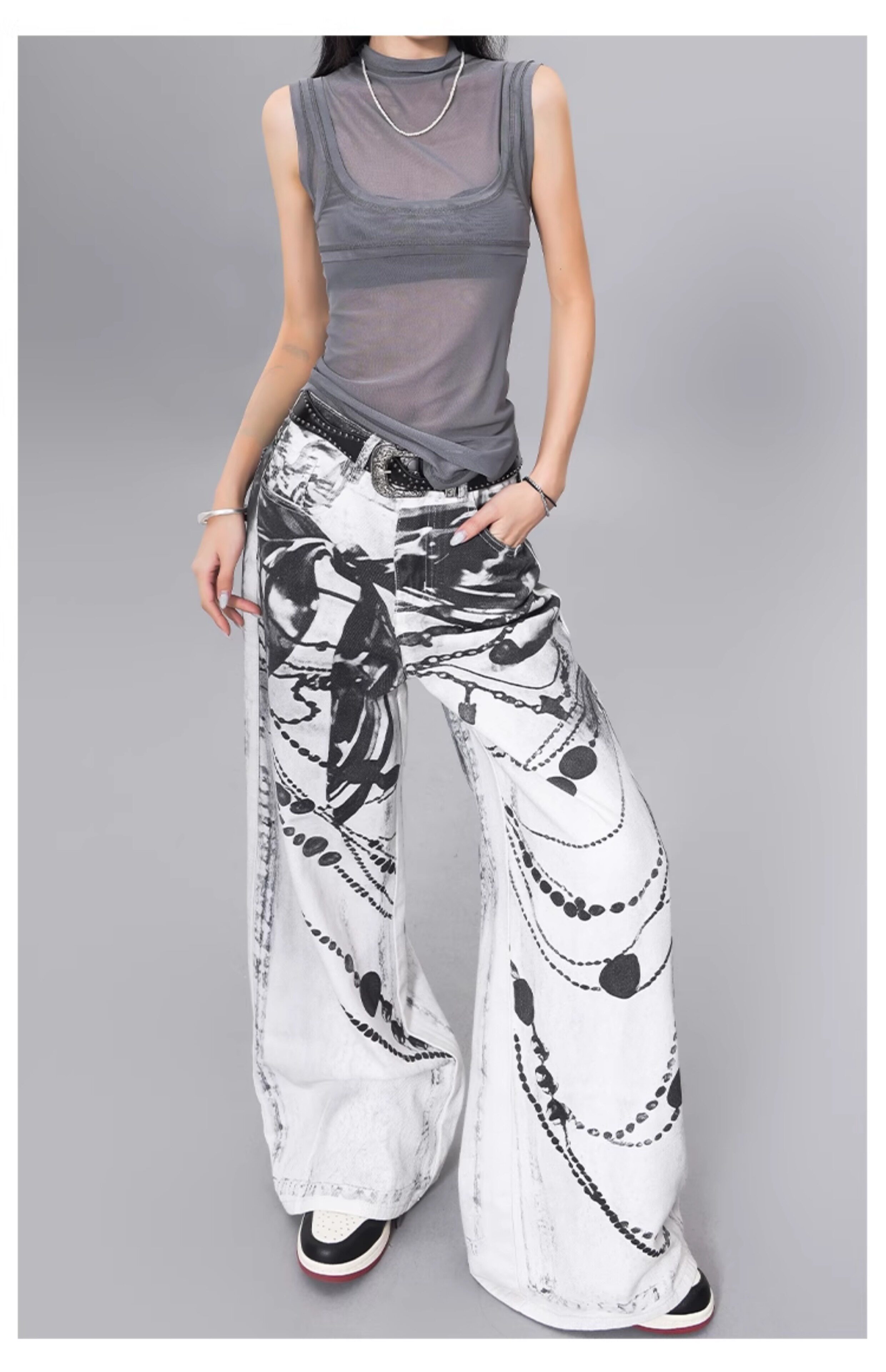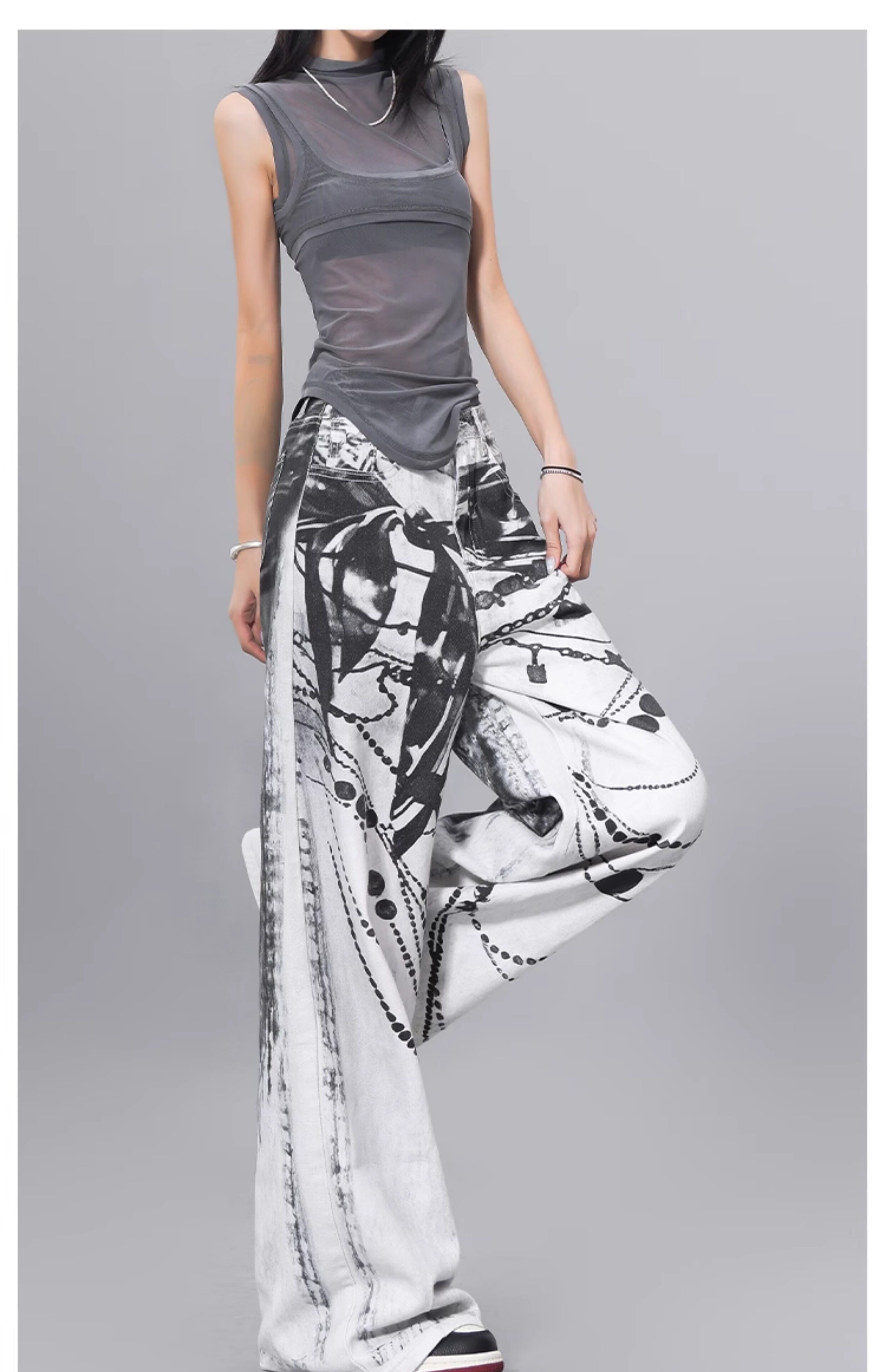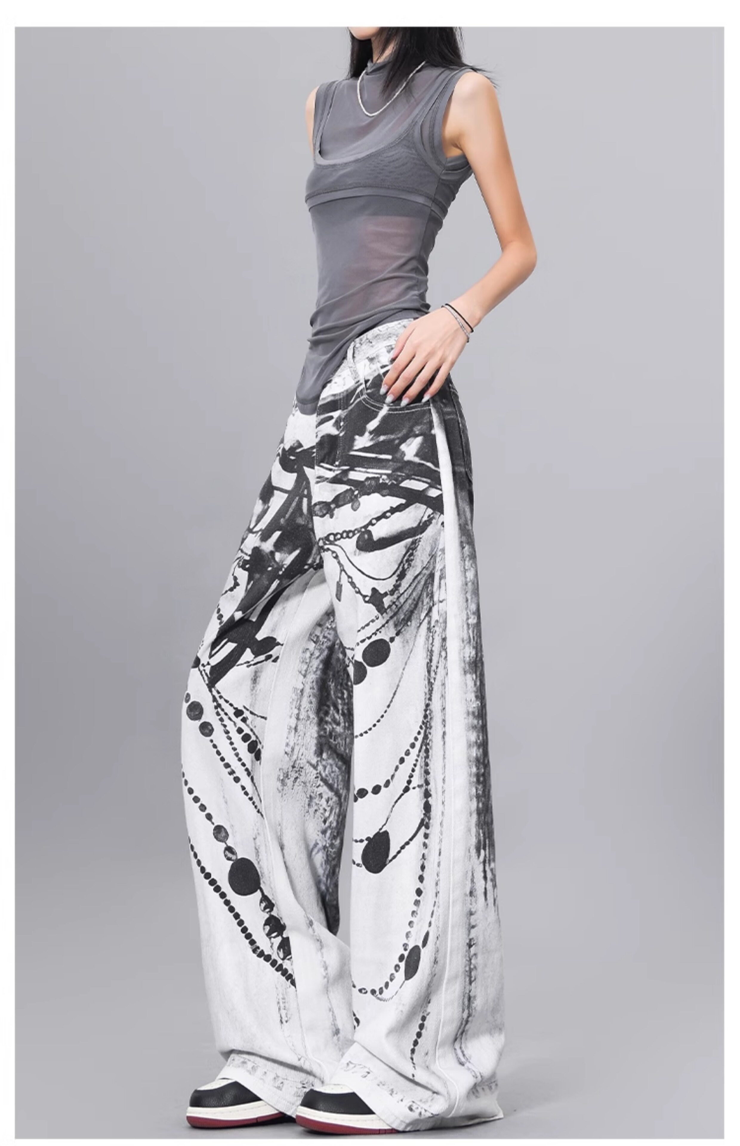 Ken Studio Ink Print Design Washed Jeans for Women Summer Street High-Waisted Loose Slimming Pants