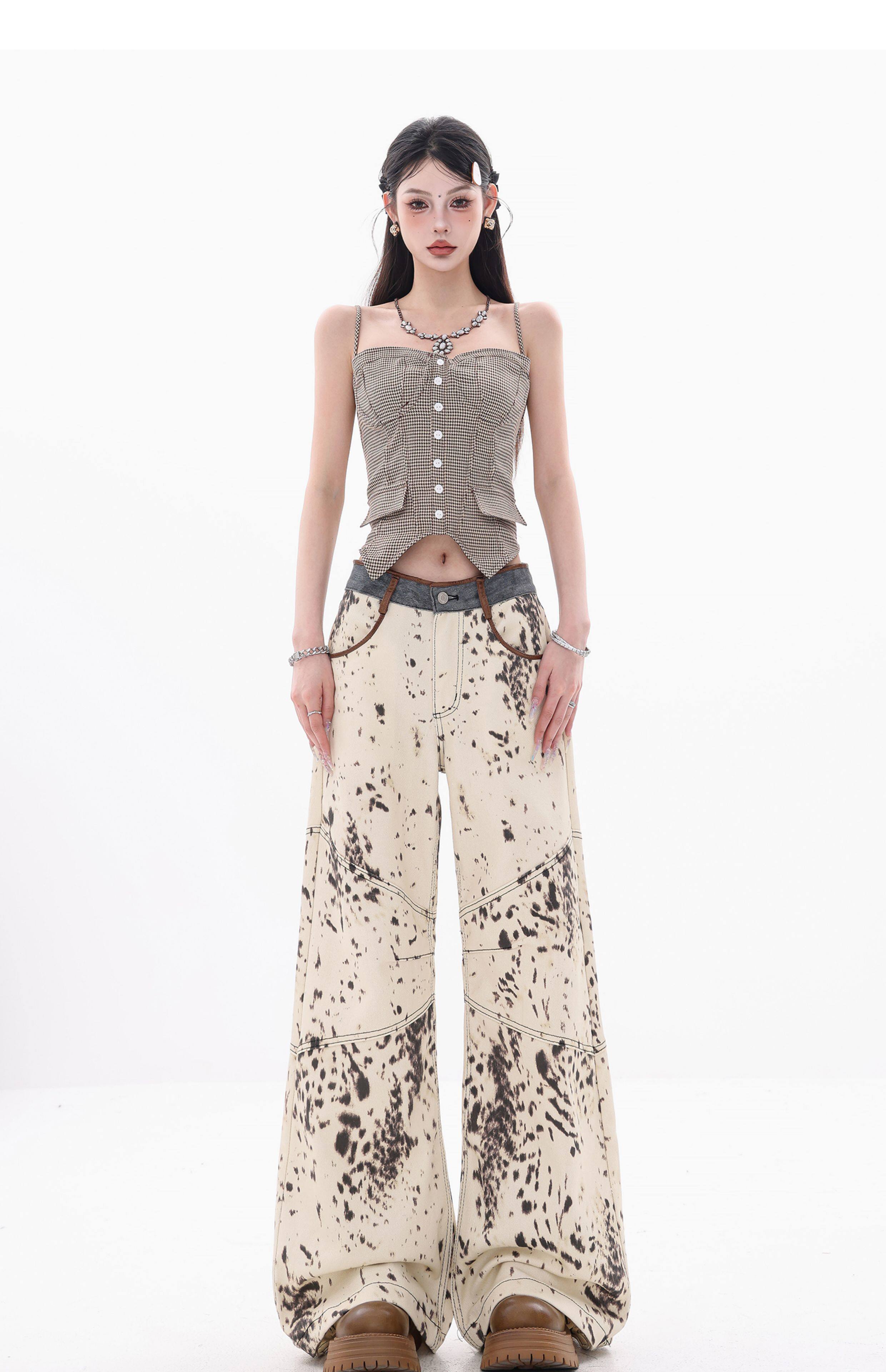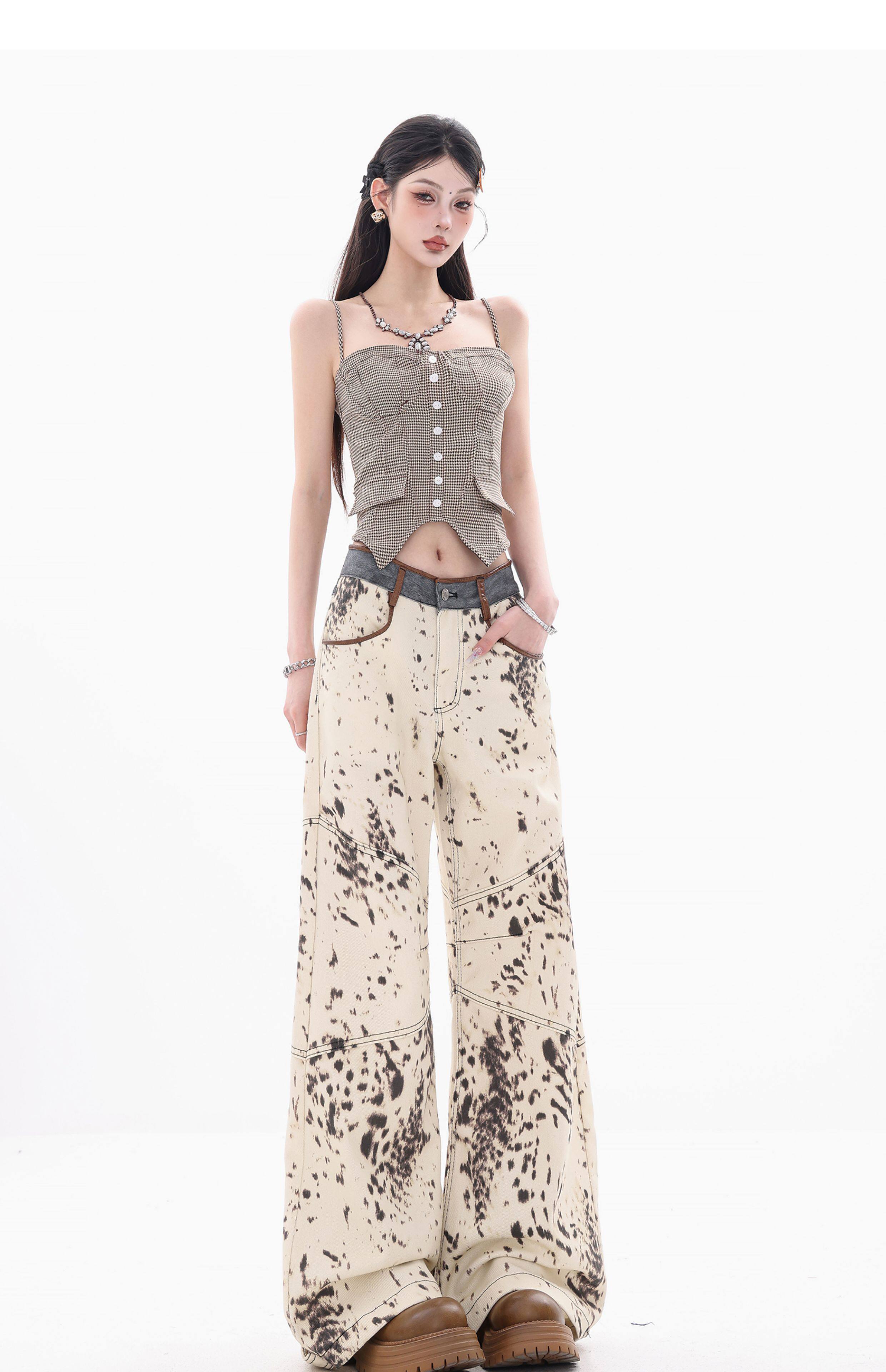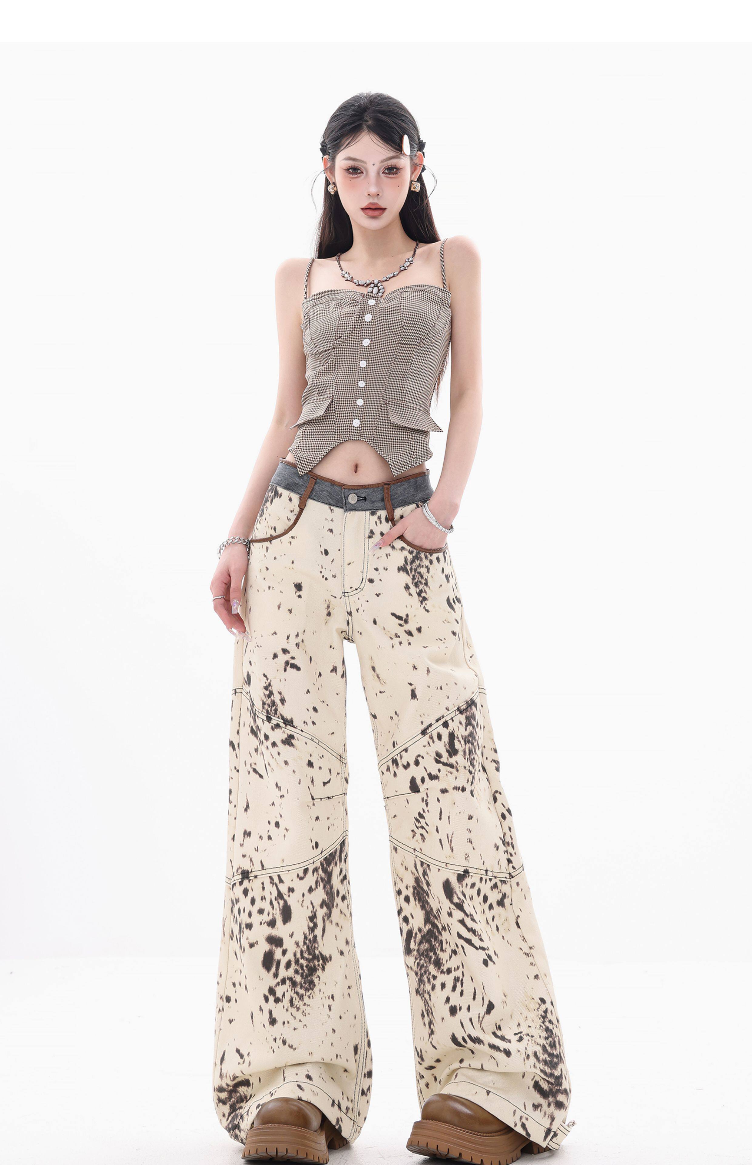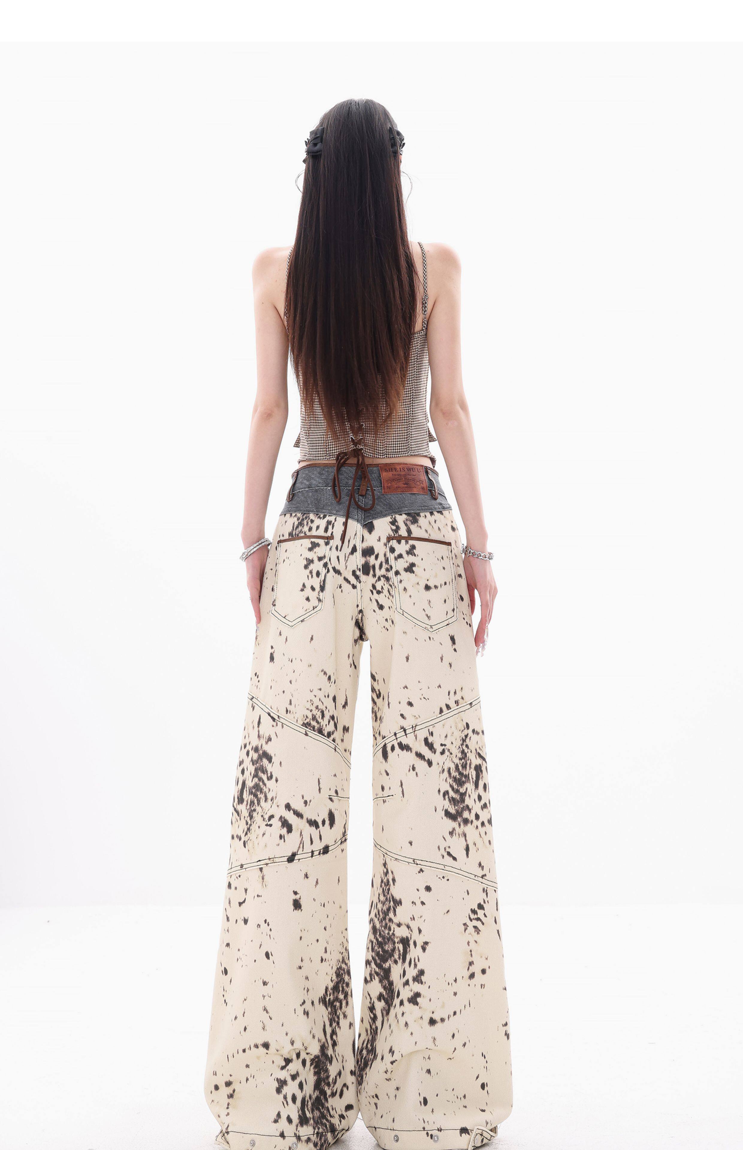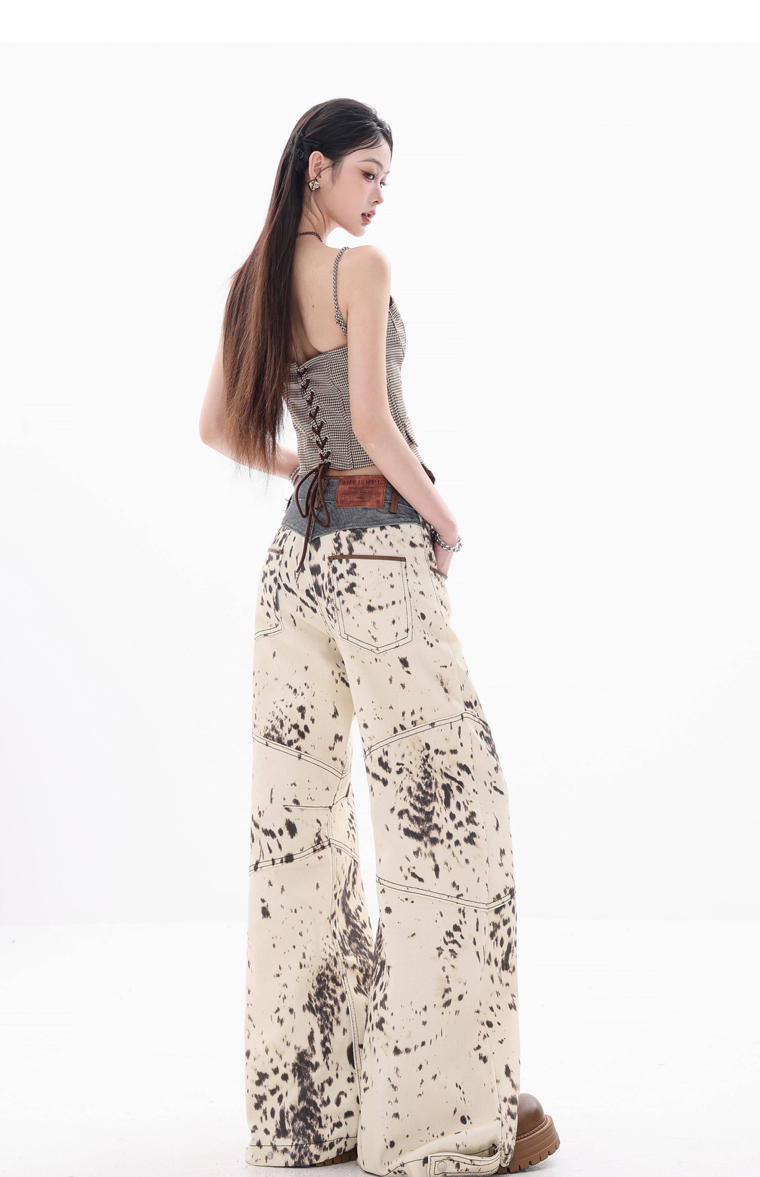 [Wish Clothing Festival]Abwear Original American-Style Patchwork Leopard Print High-Waisted Slimming Wide-Leg Printed Denim Pants