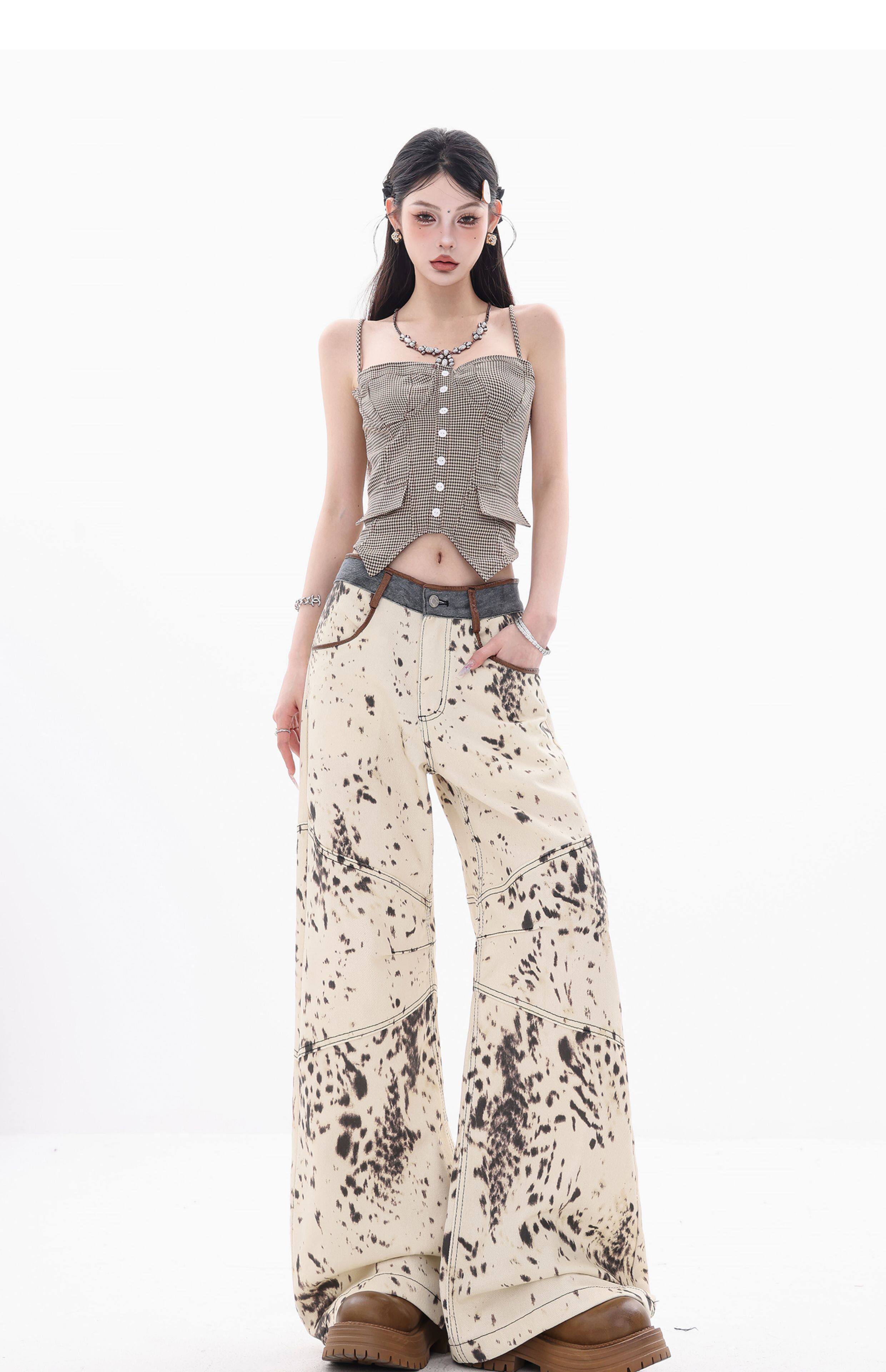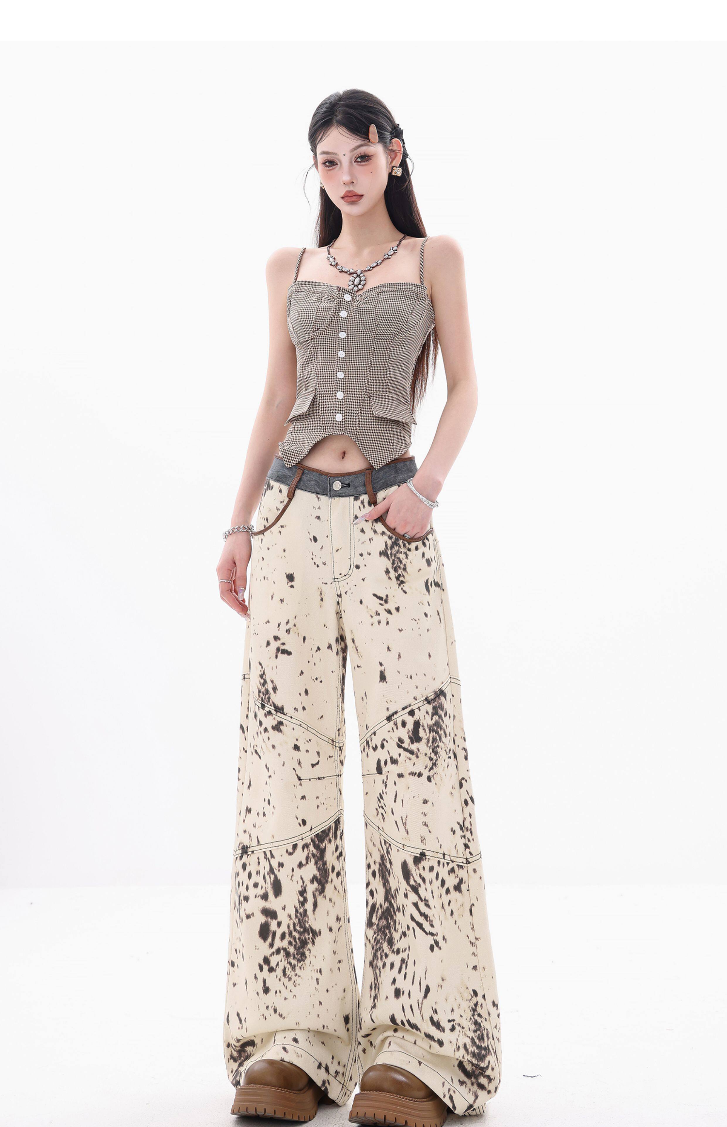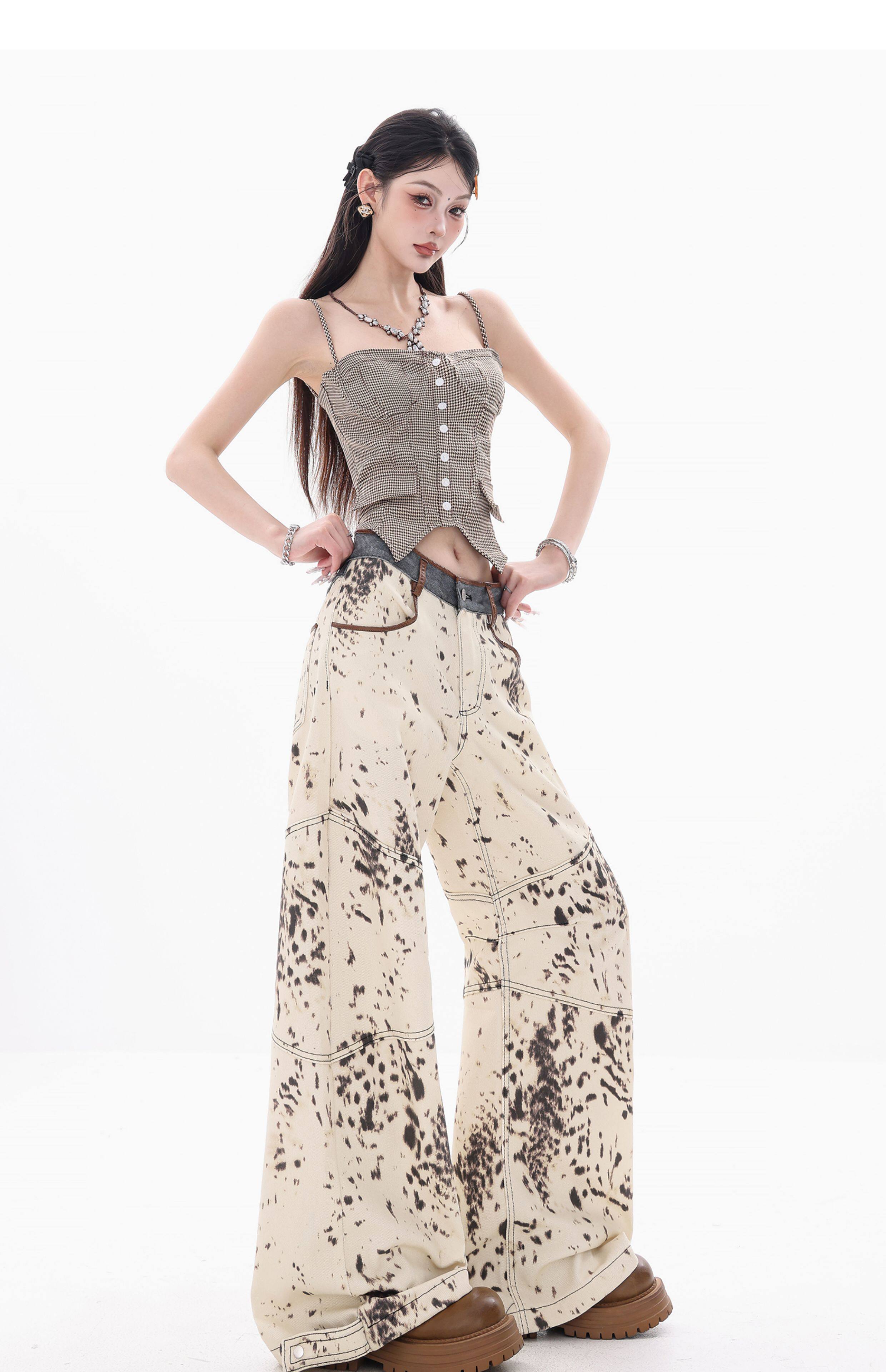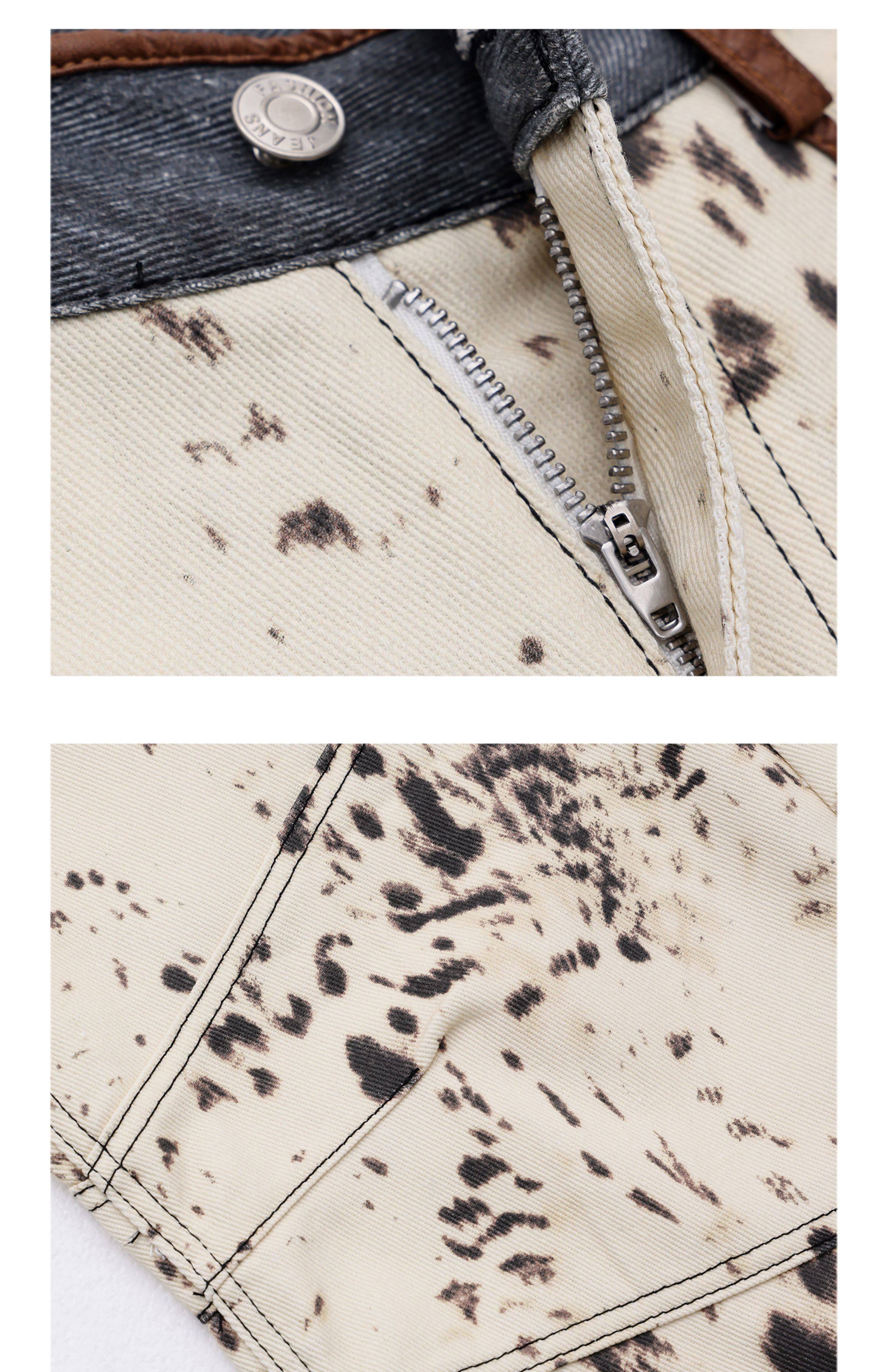 [Wish Clothing Festival]Abwear Original American-Style Patchwork Leopard Print High-Waisted Slimming Wide-Leg Printed Denim Pants