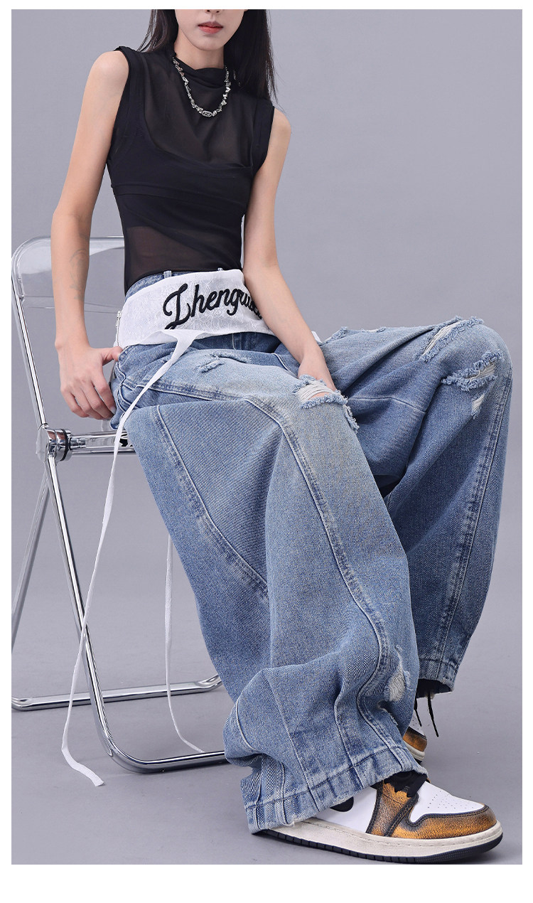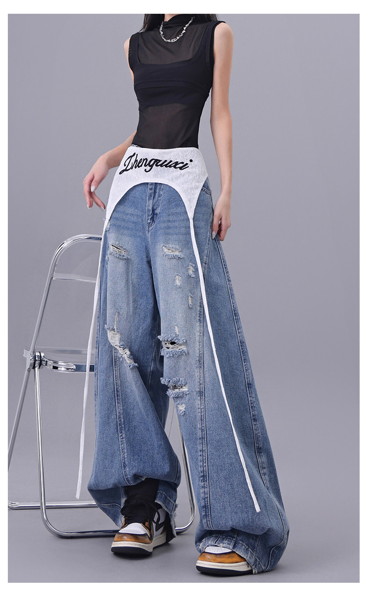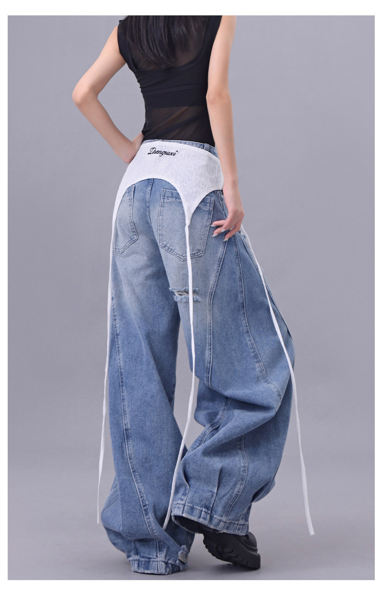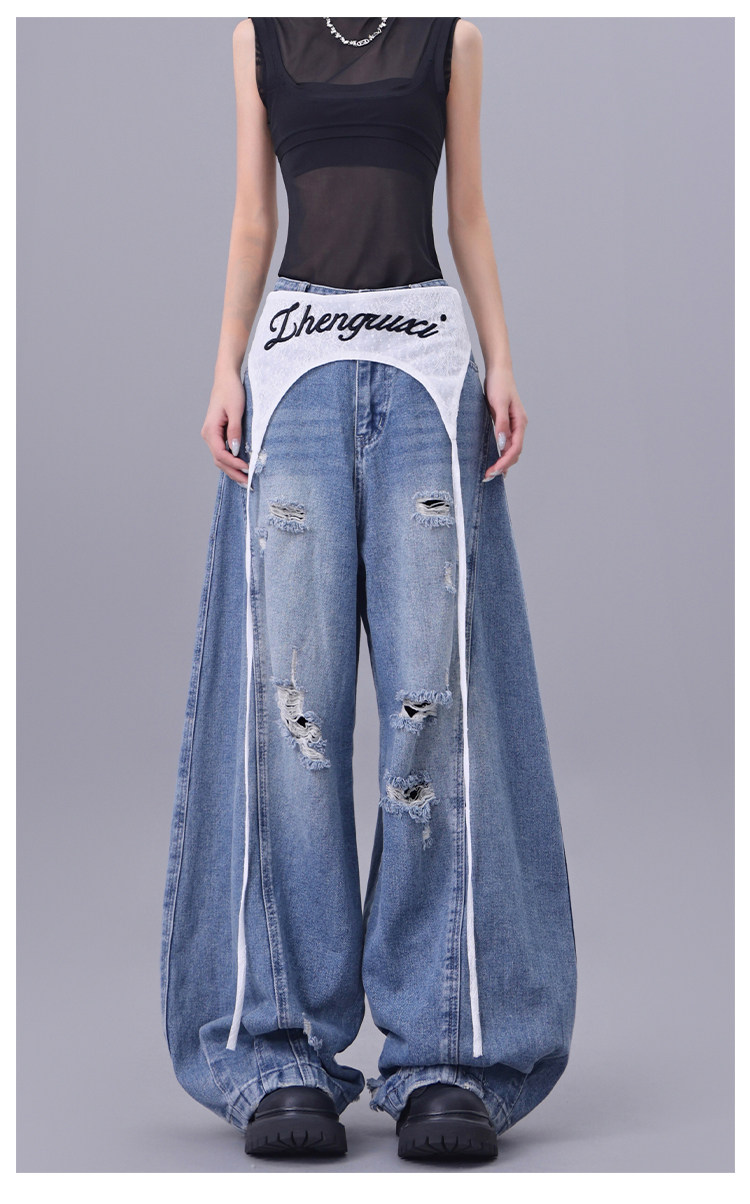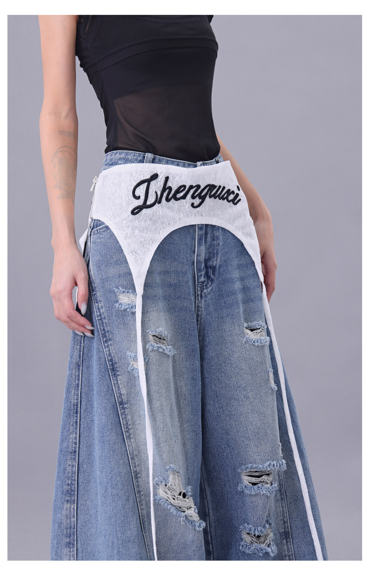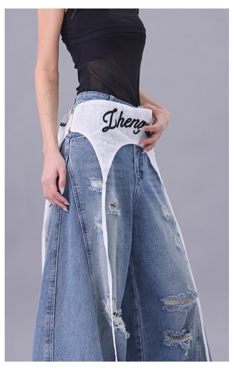 Ken Studio Tall Lace Trim Layered Ripped Scimitar Jeans Women's Wide-Leg Floor-Length Pants