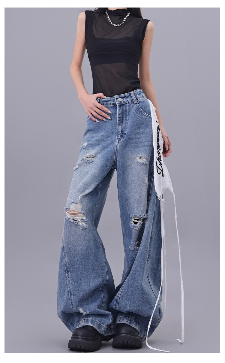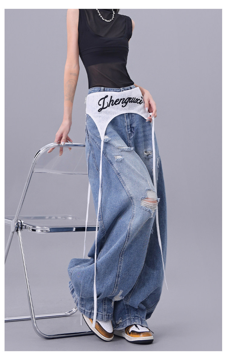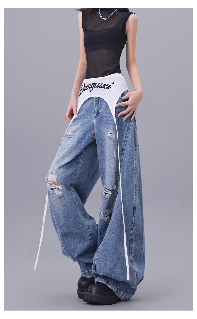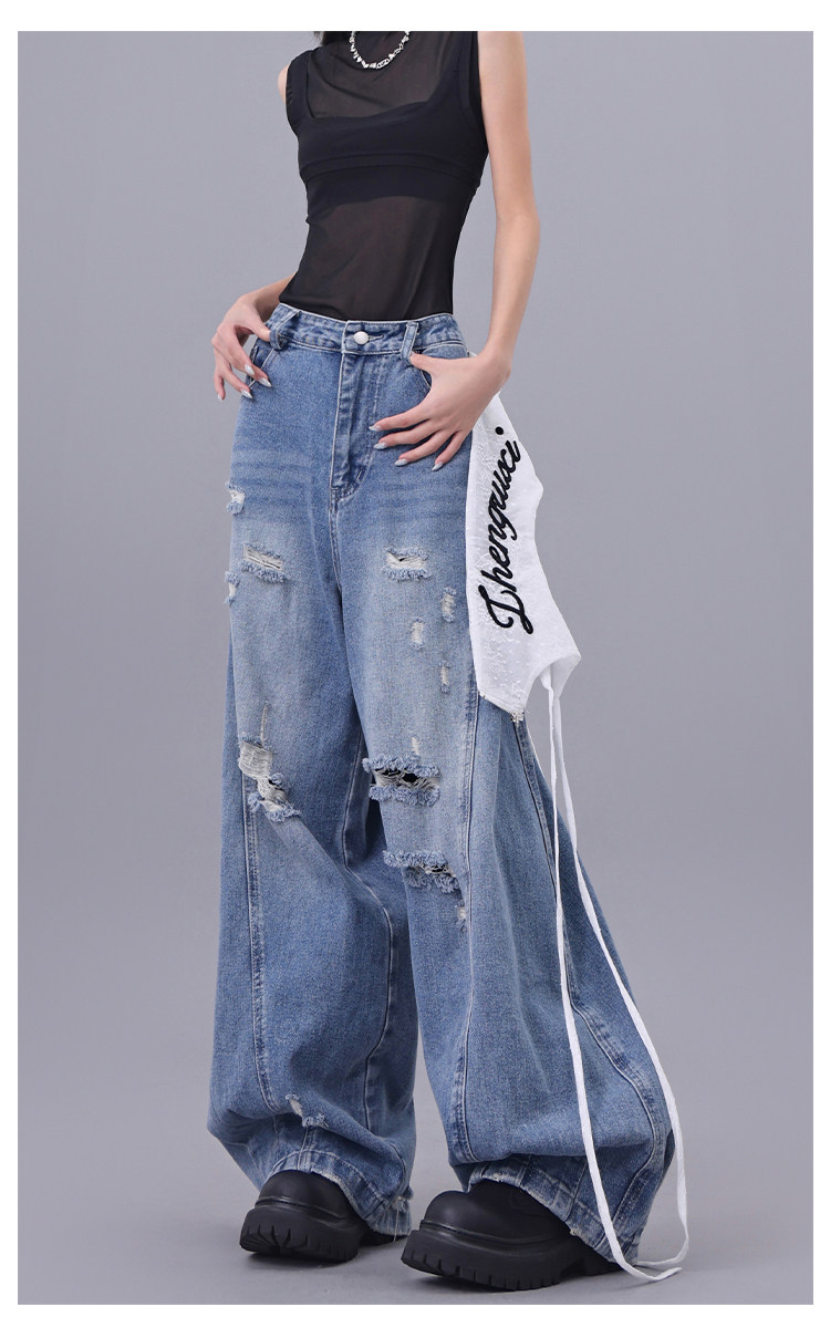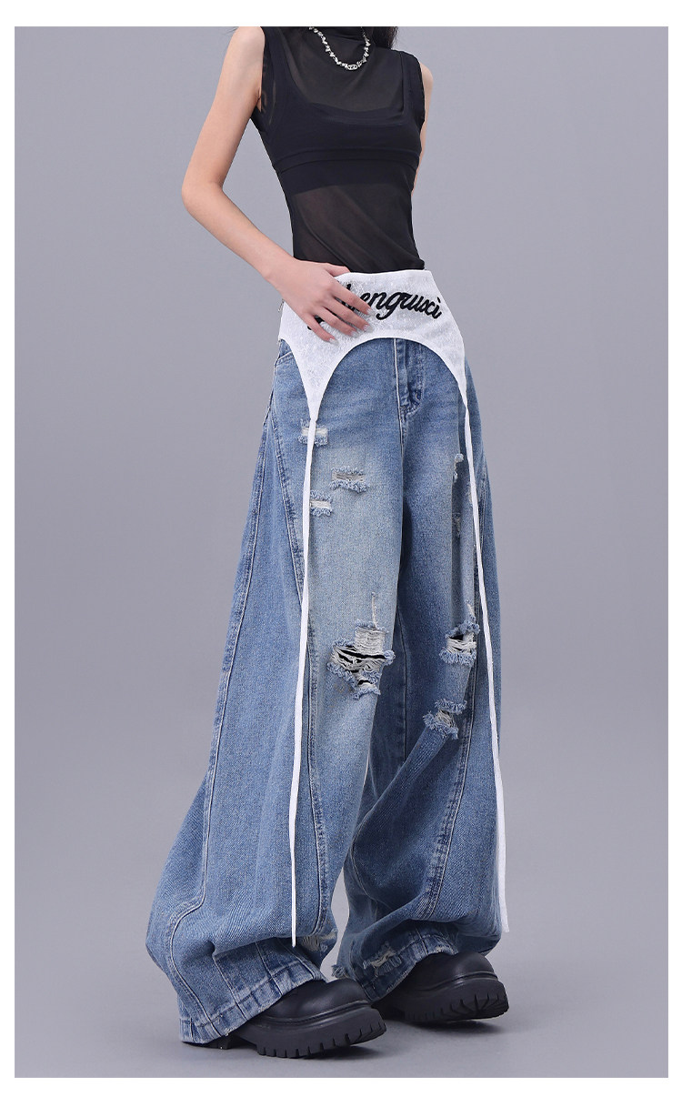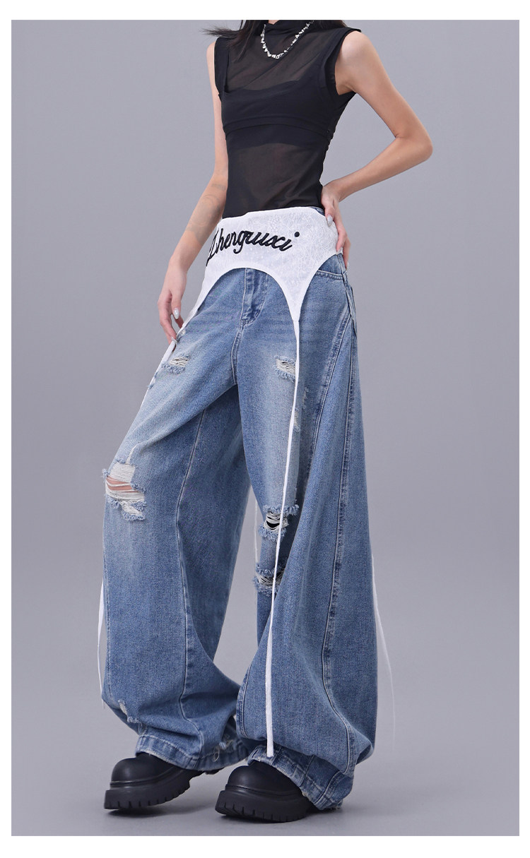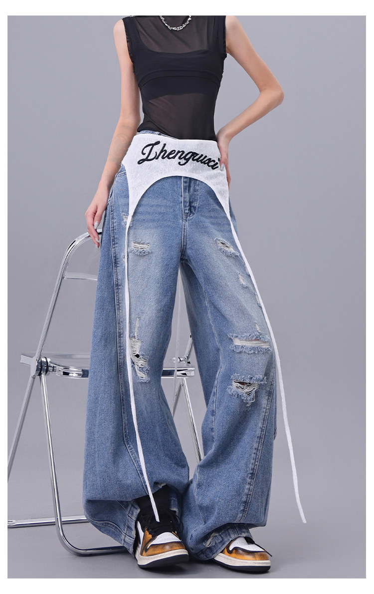 Ken Studio Tall Lace Trim Layered Ripped Scimitar Jeans Women's Wide-Leg Floor-Length Pants