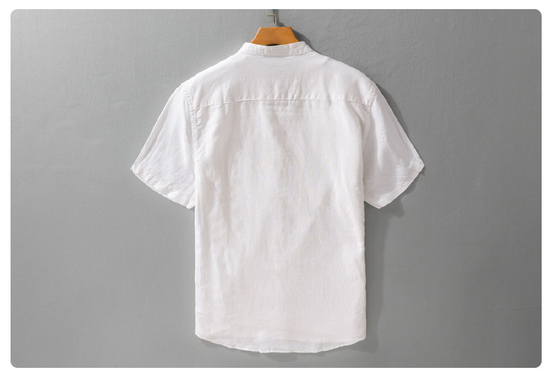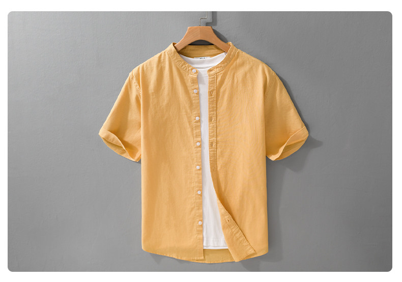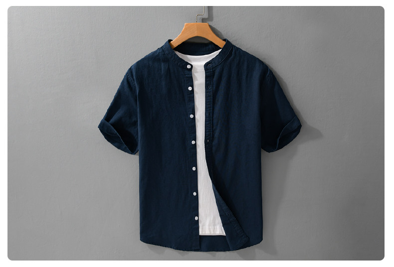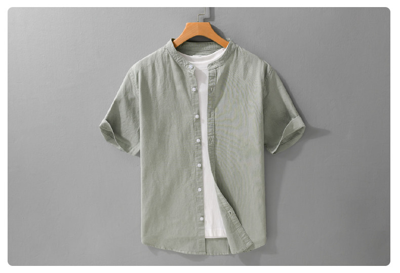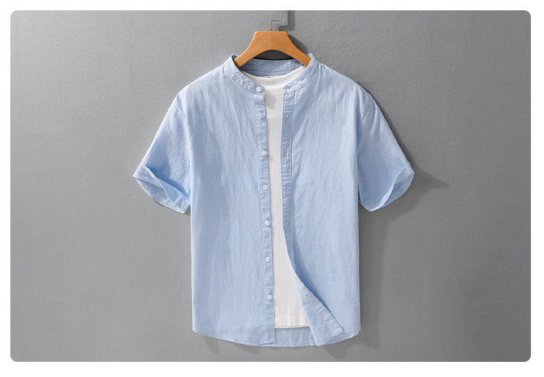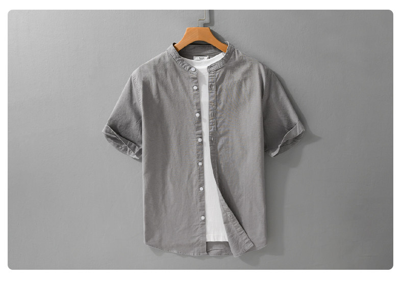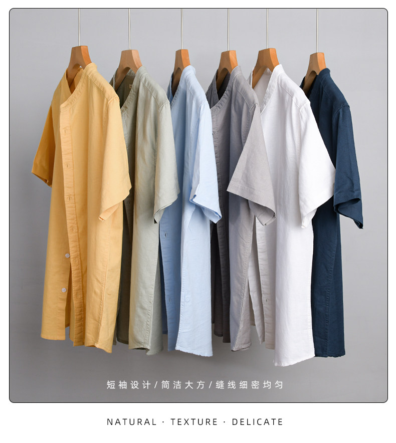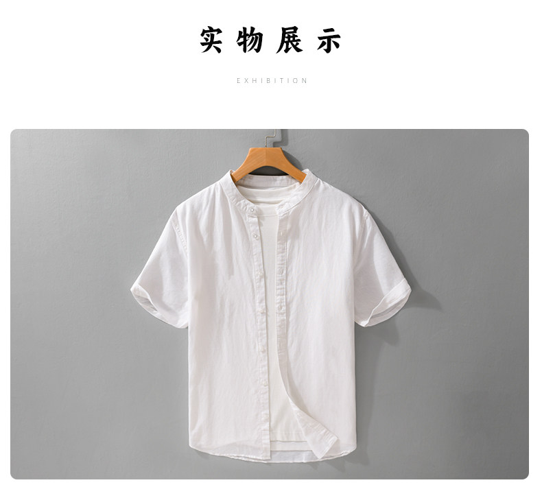 Casual Business Style Small Stand-Up Collar Linen Short-Sleeved White Shirt Men's Round-Neck Cotton and Linen Casual Shirt Collarless Top