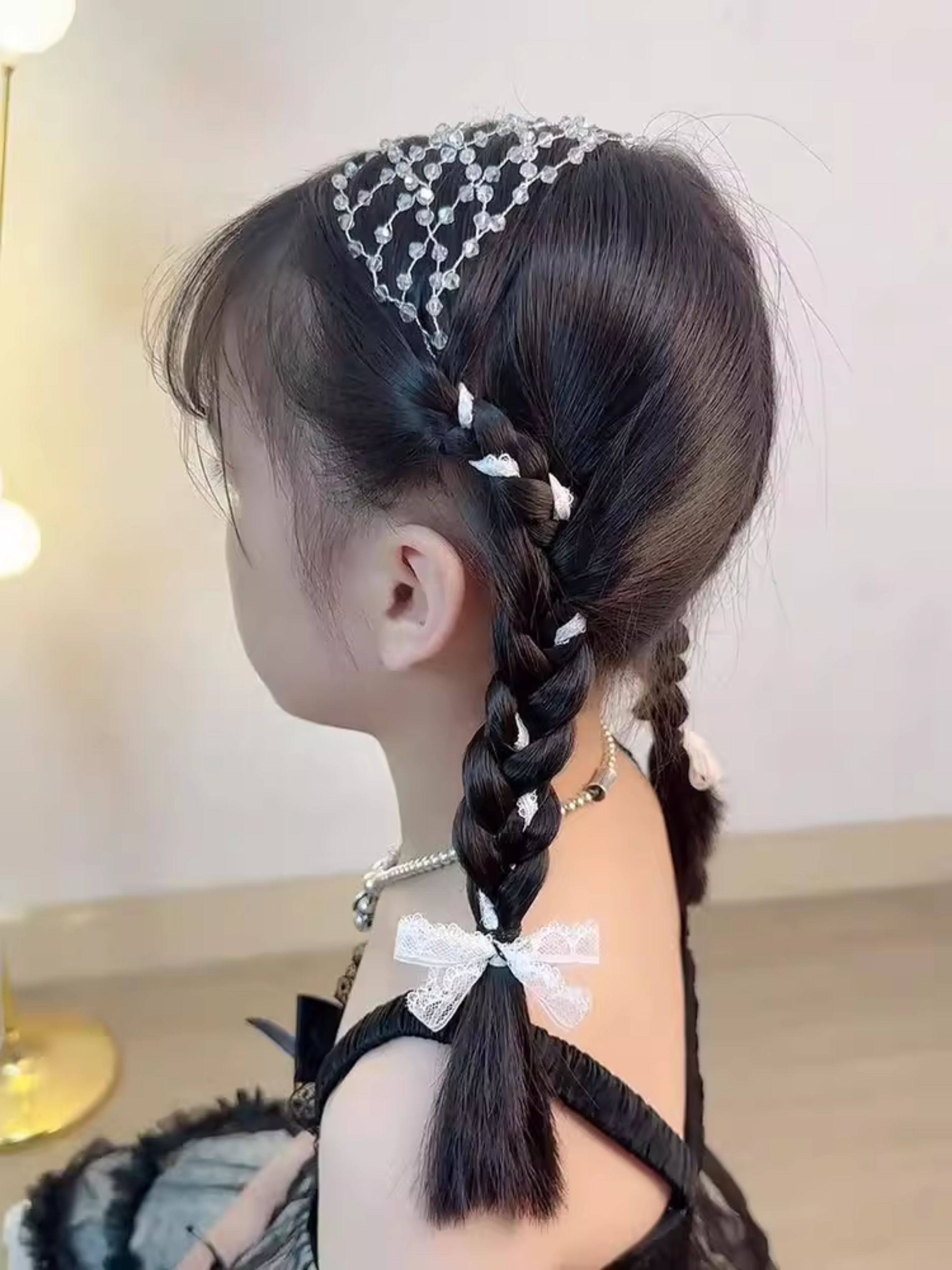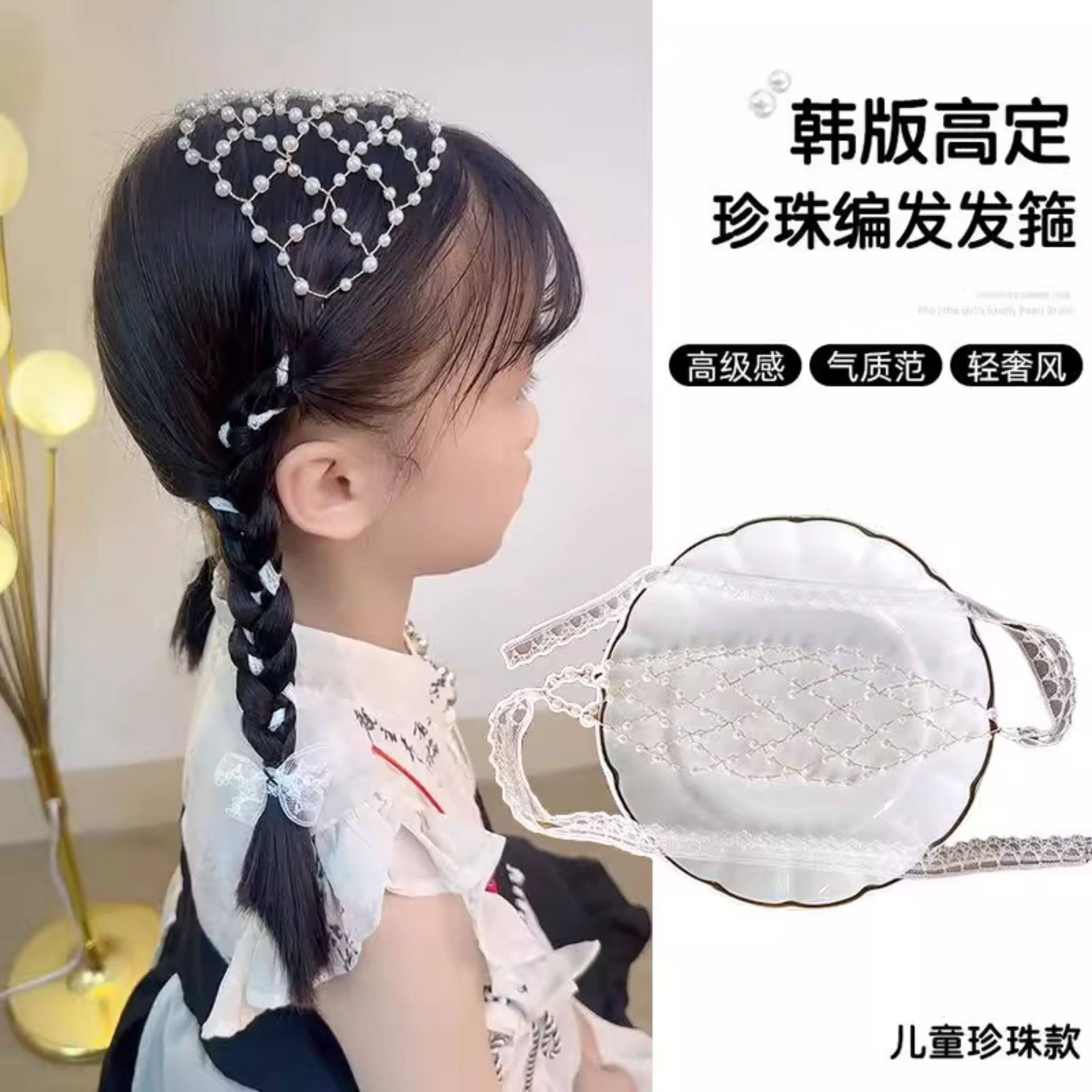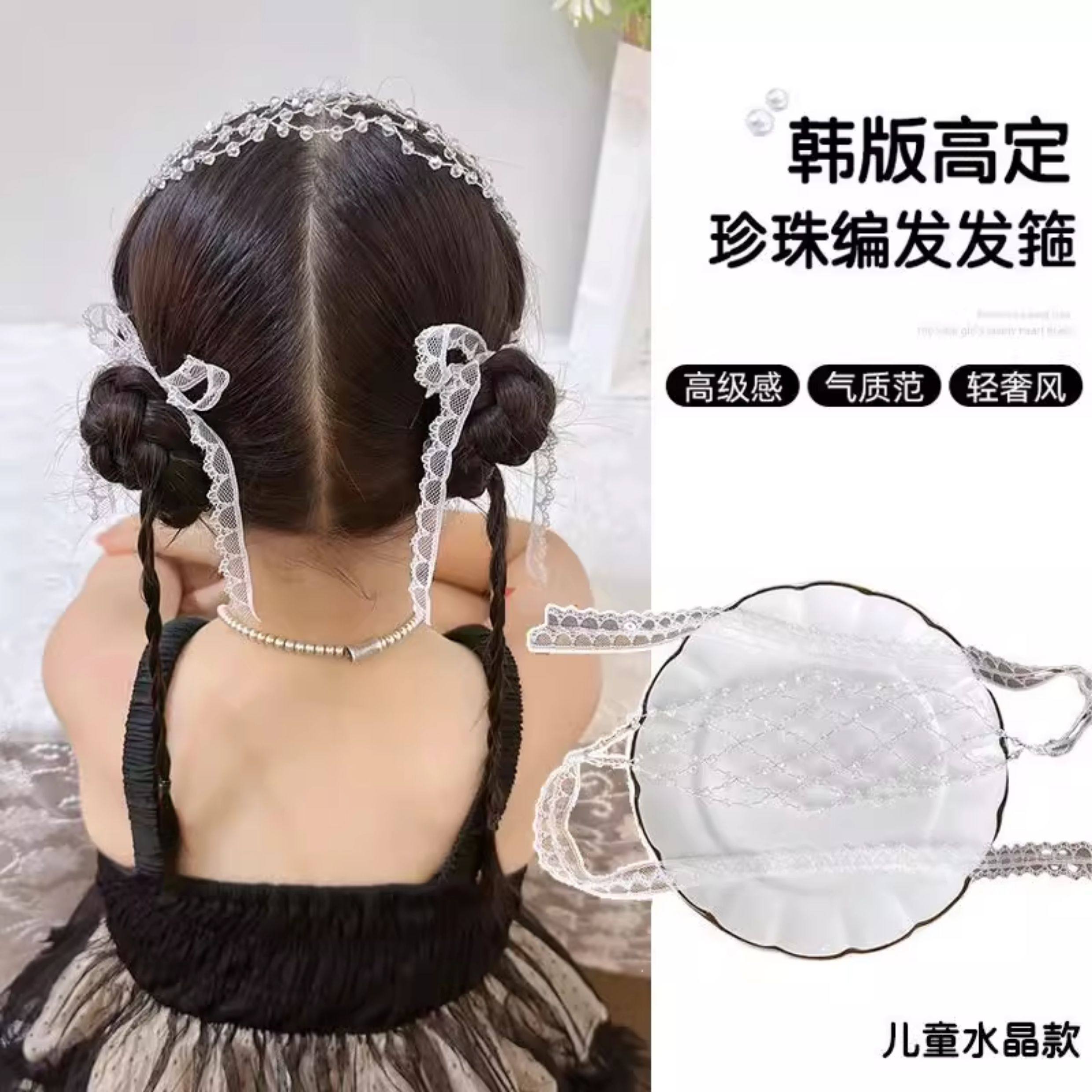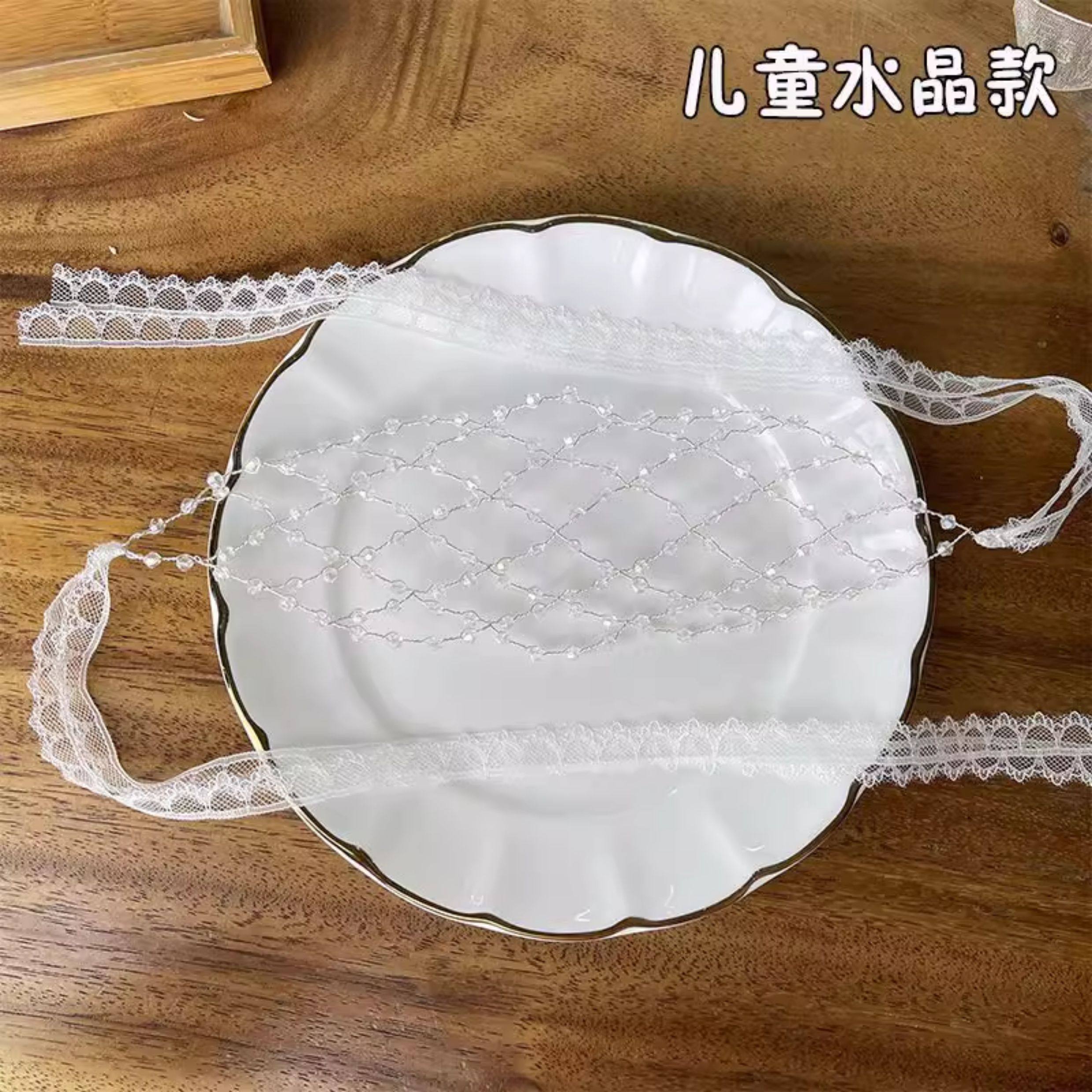 女童2025新高定精致手工编织串珠水晶网发饰网状珍珠蕾丝带编发箍