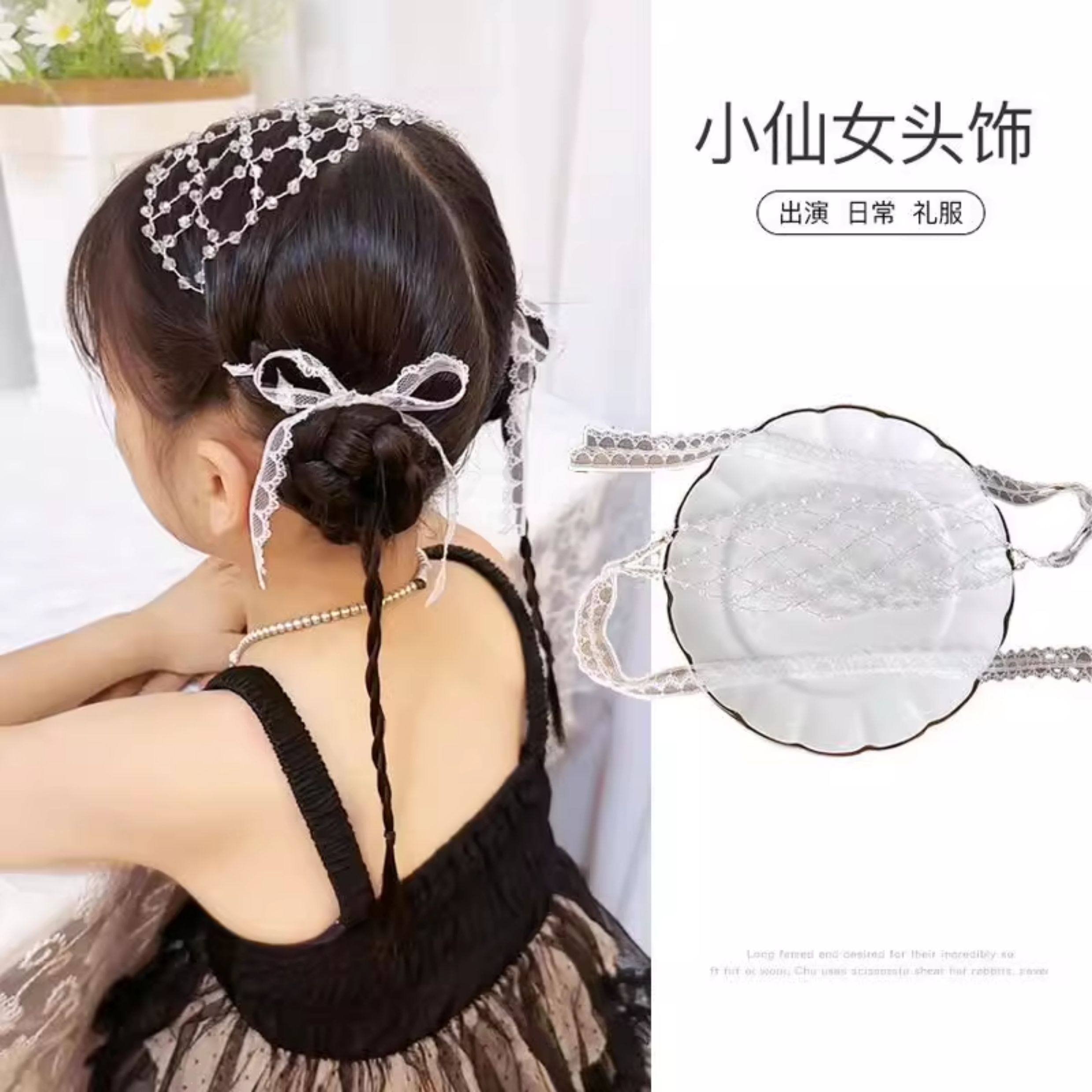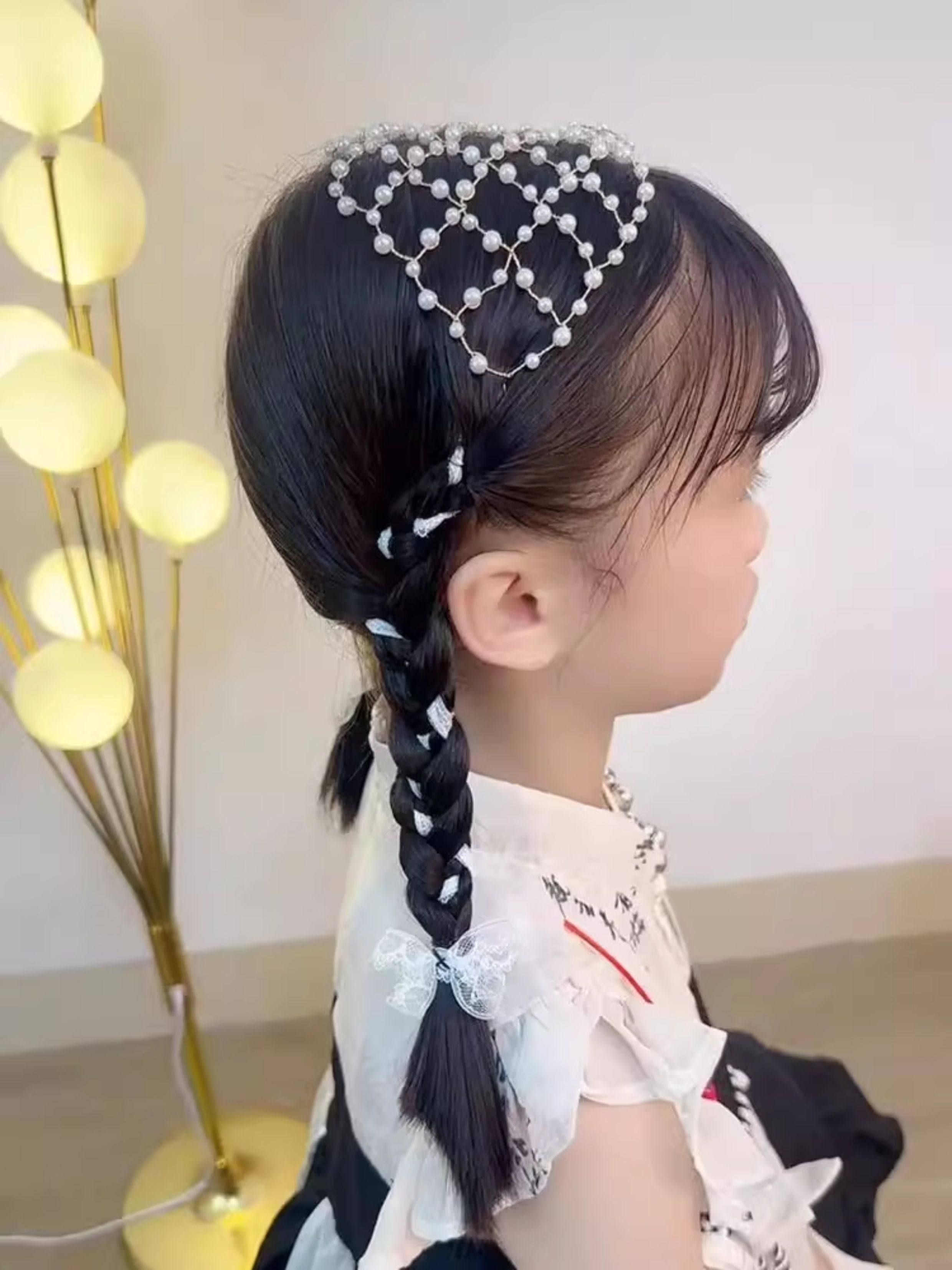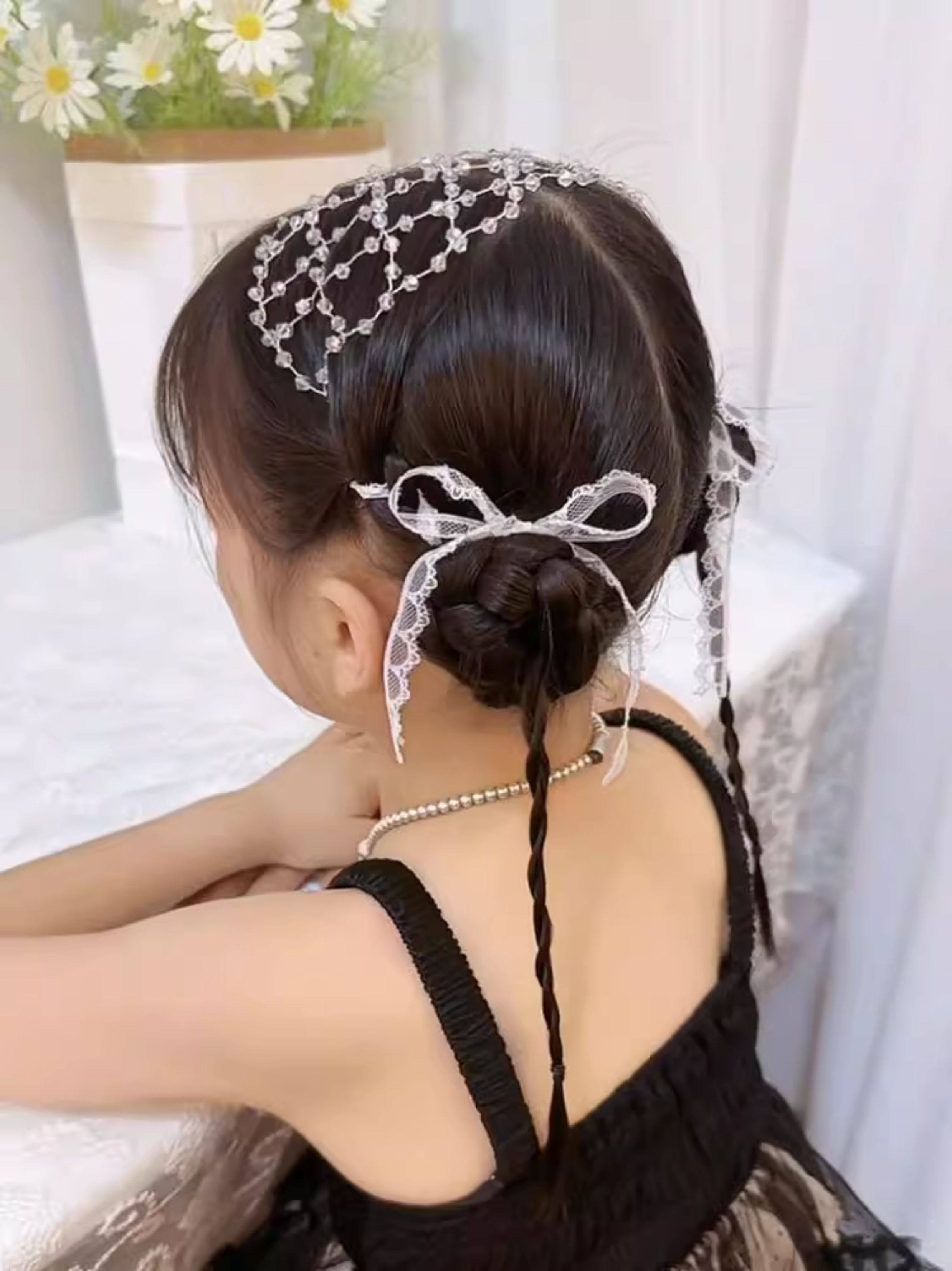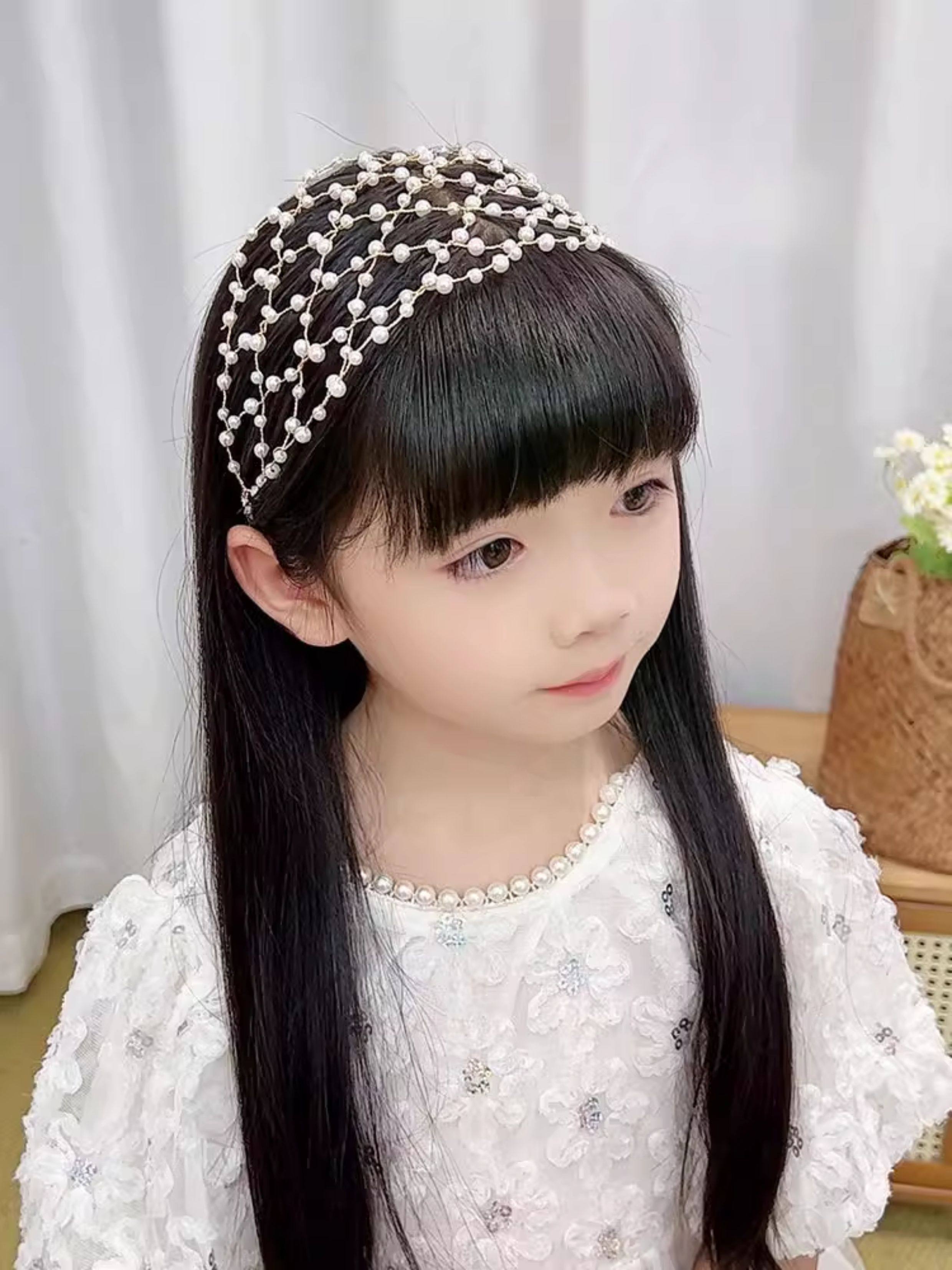 女童2025新高定精致手工编织串珠水晶网发饰网状珍珠蕾丝带编发箍