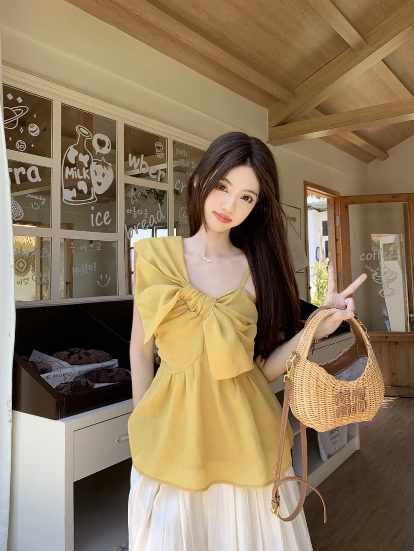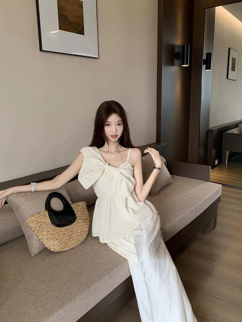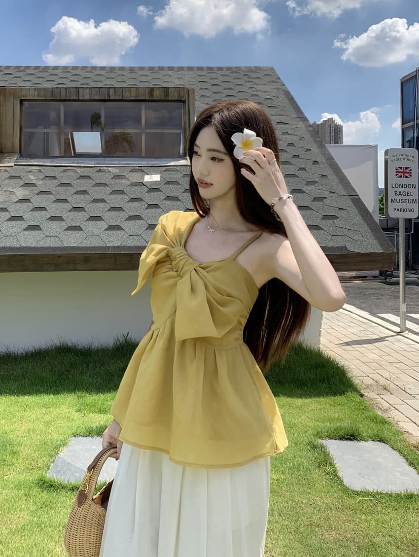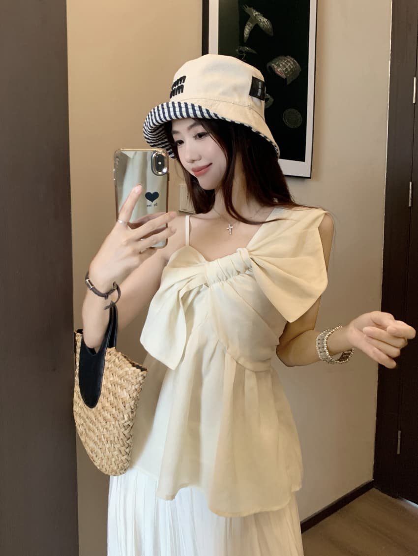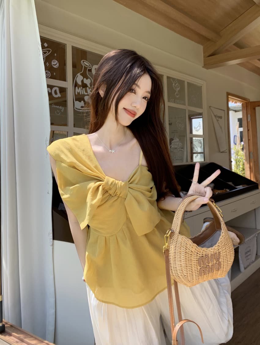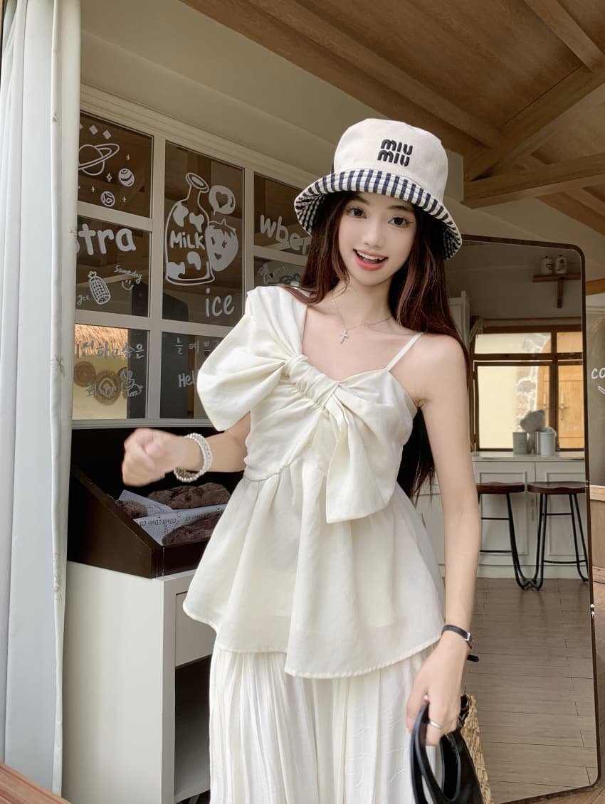 French-Style High-End Bowknot Off-Shoulder Shirt for Women, Summer Design, Stylish Sleeveless Babydoll Top