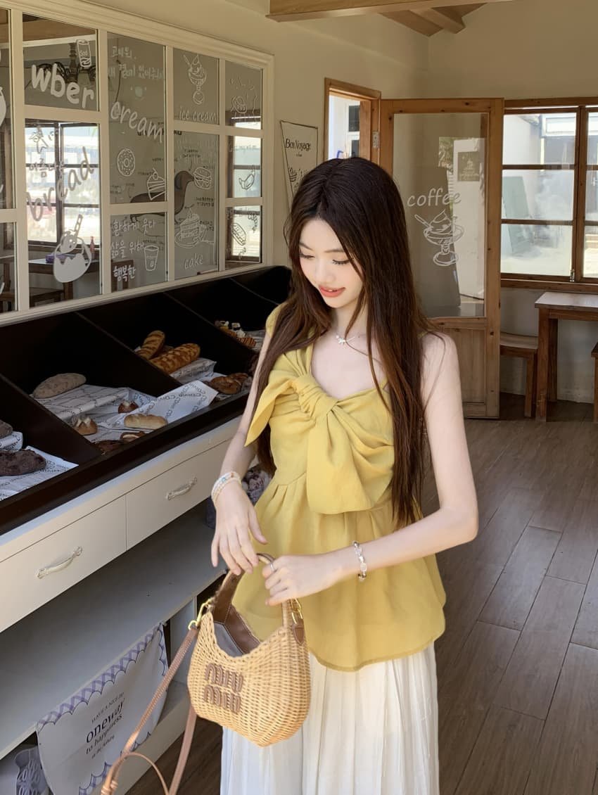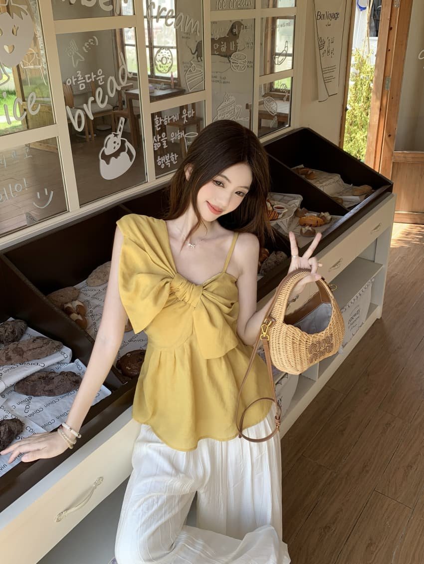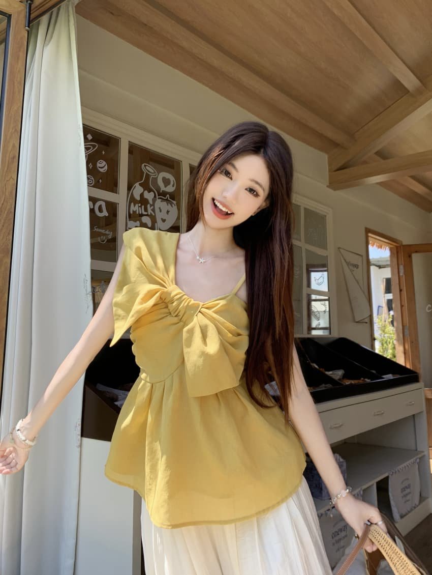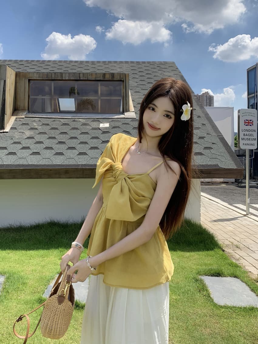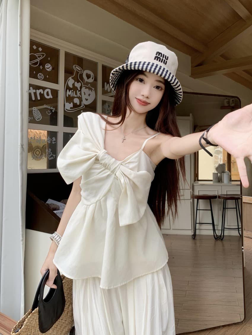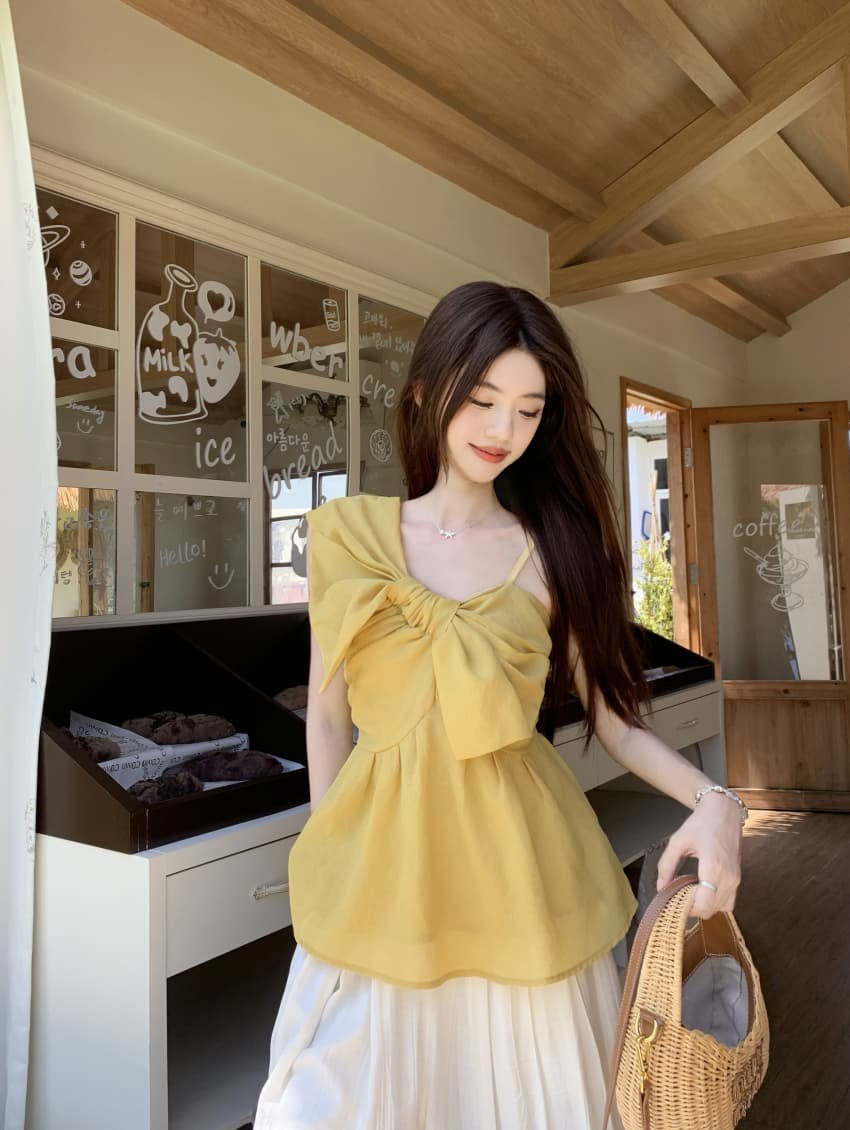 French-Style High-End Bowknot Off-Shoulder Shirt for Women, Summer Design, Stylish Sleeveless Babydoll Top