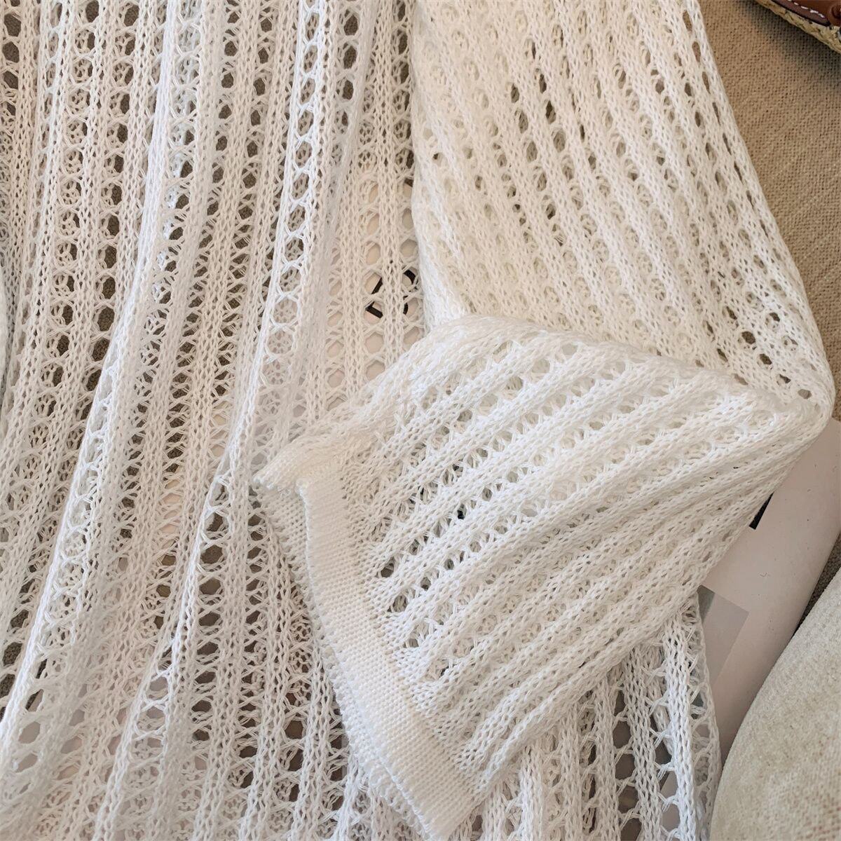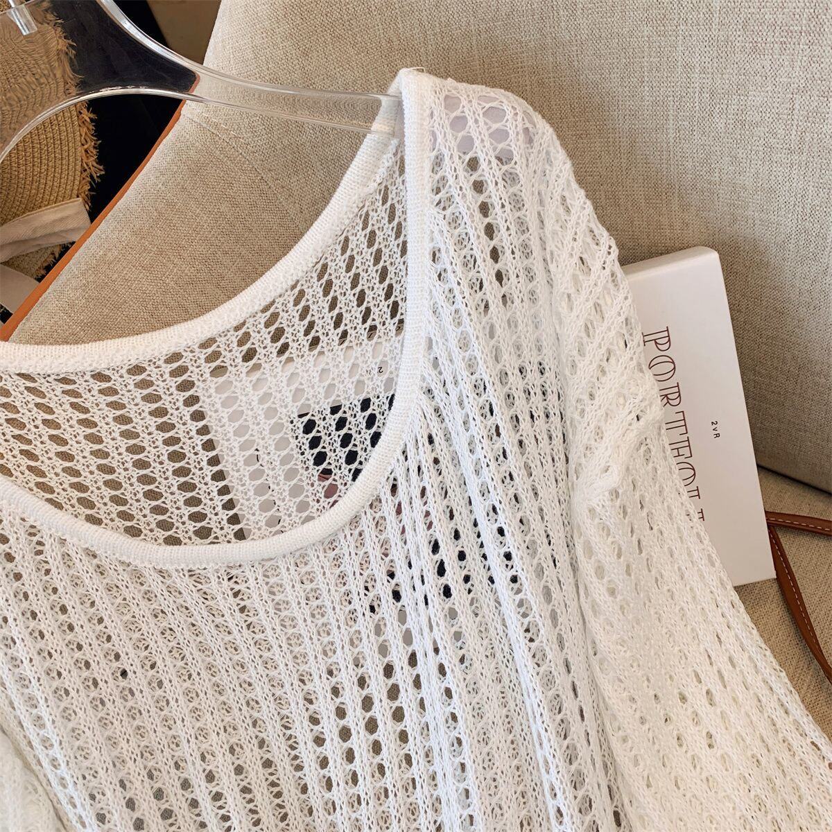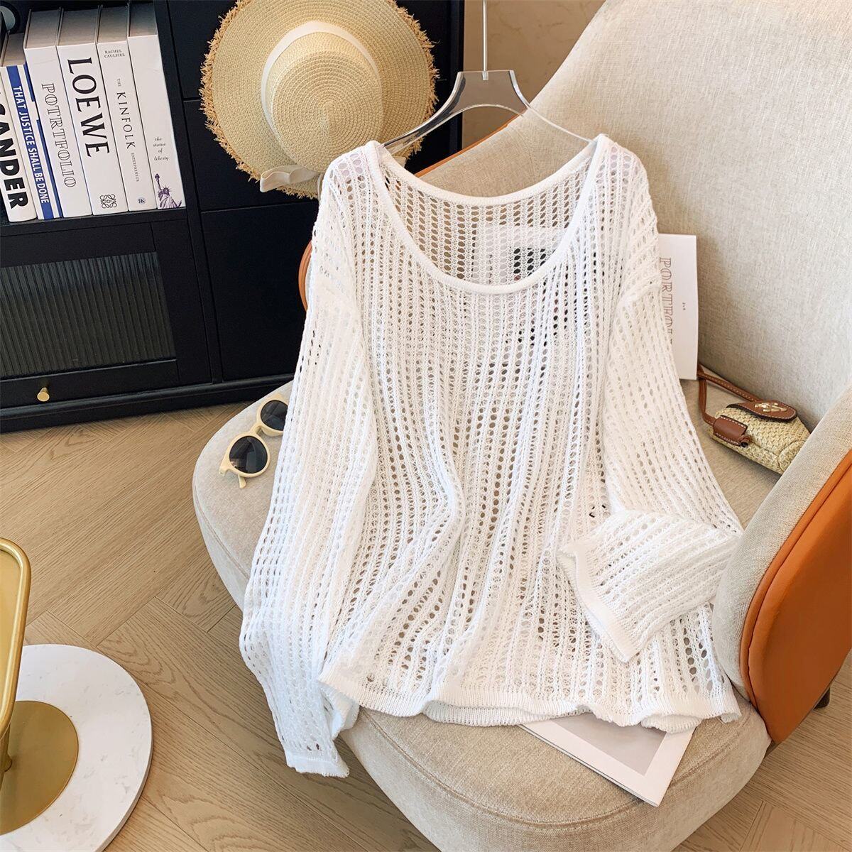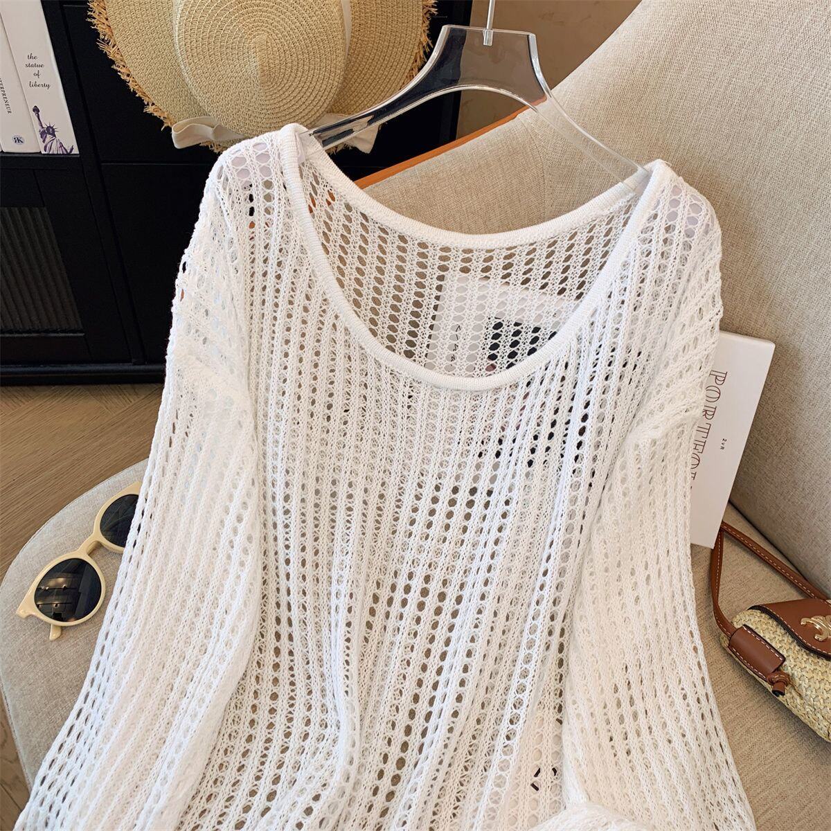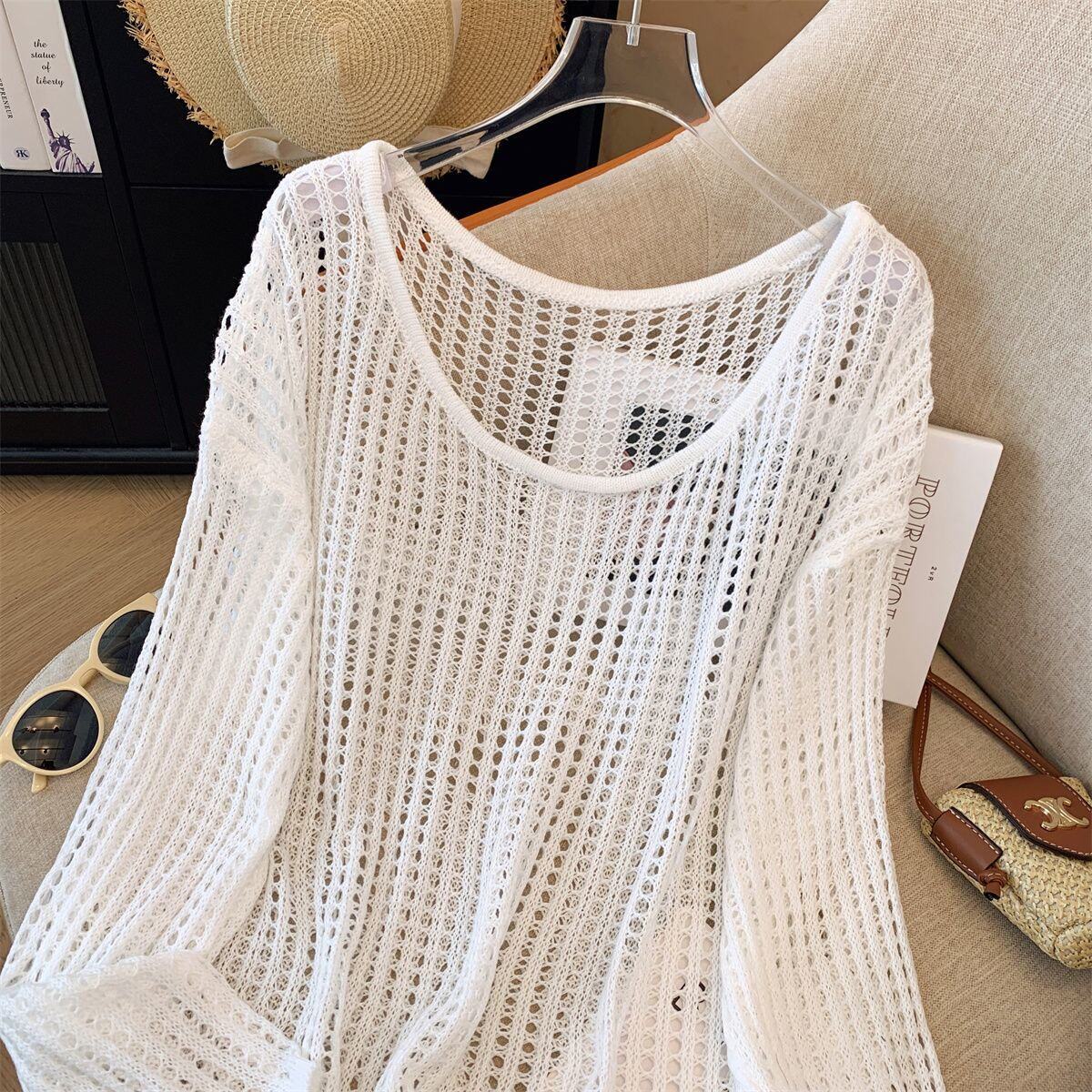 Hollow-Out Knit Sweater for Women, New Summer Style, Lazy and Loose Fit, Covers the Body, Sun Protection Cover-Up, Round Neck Design, Long Sleeves with Fake Collar