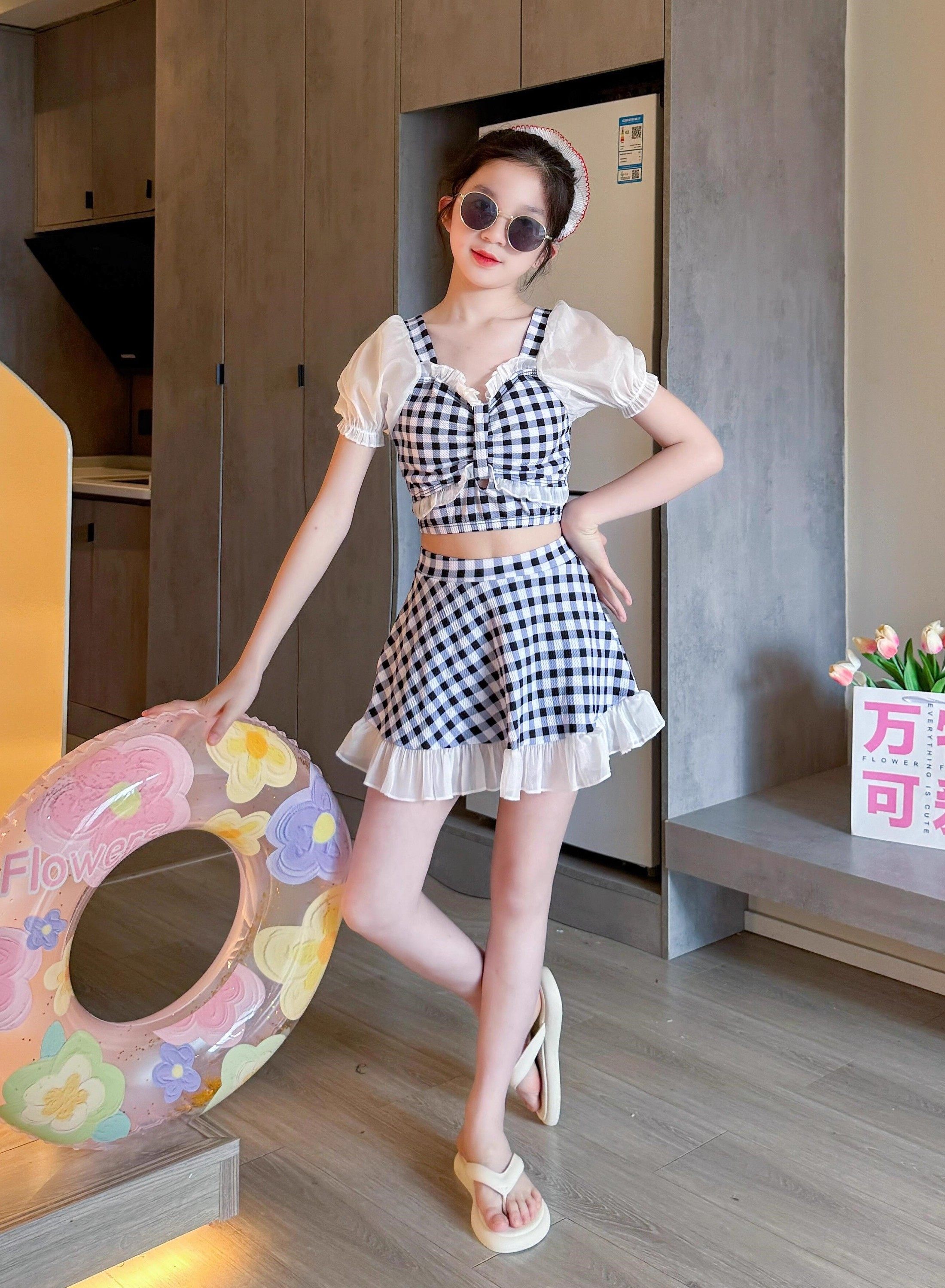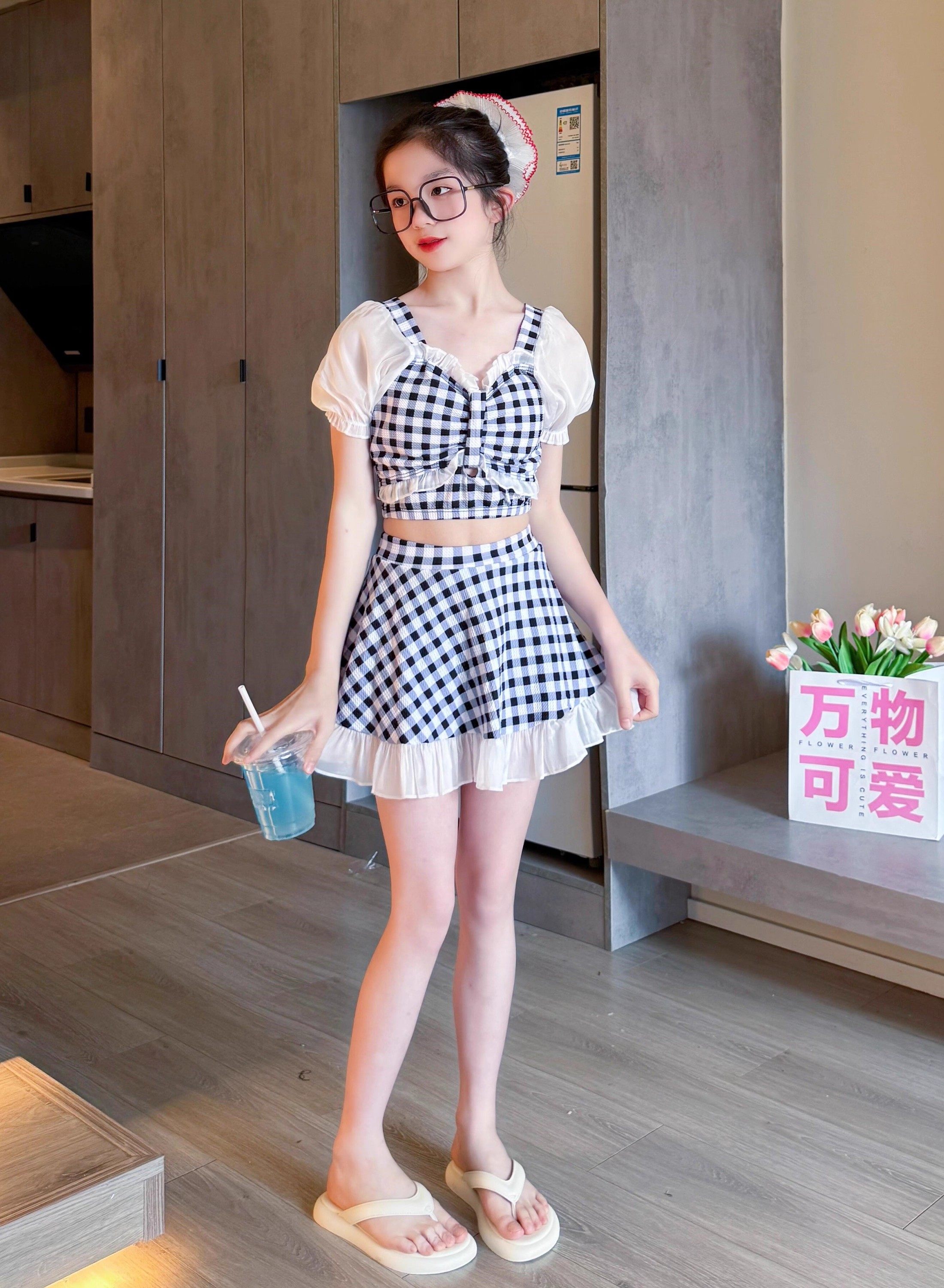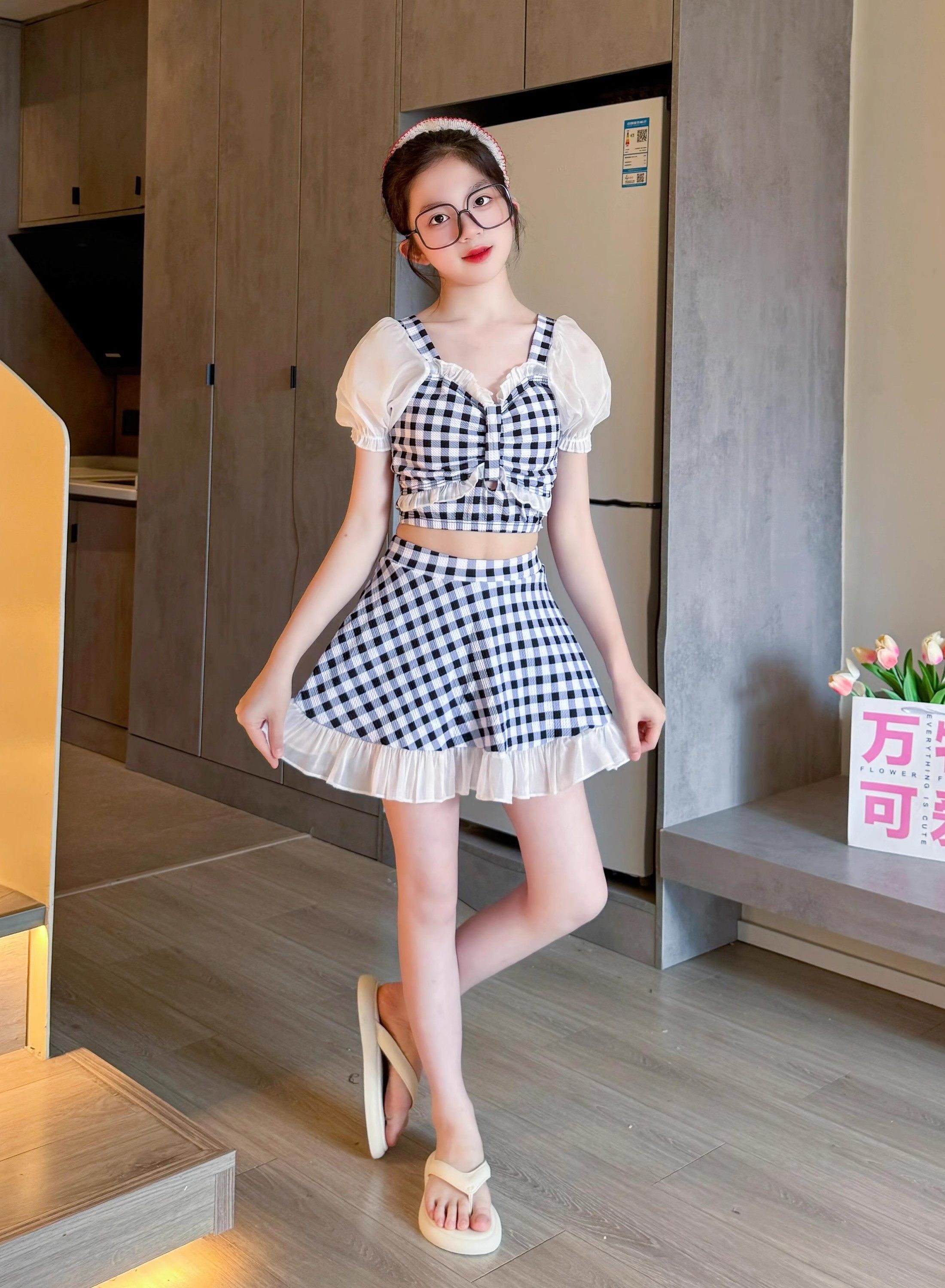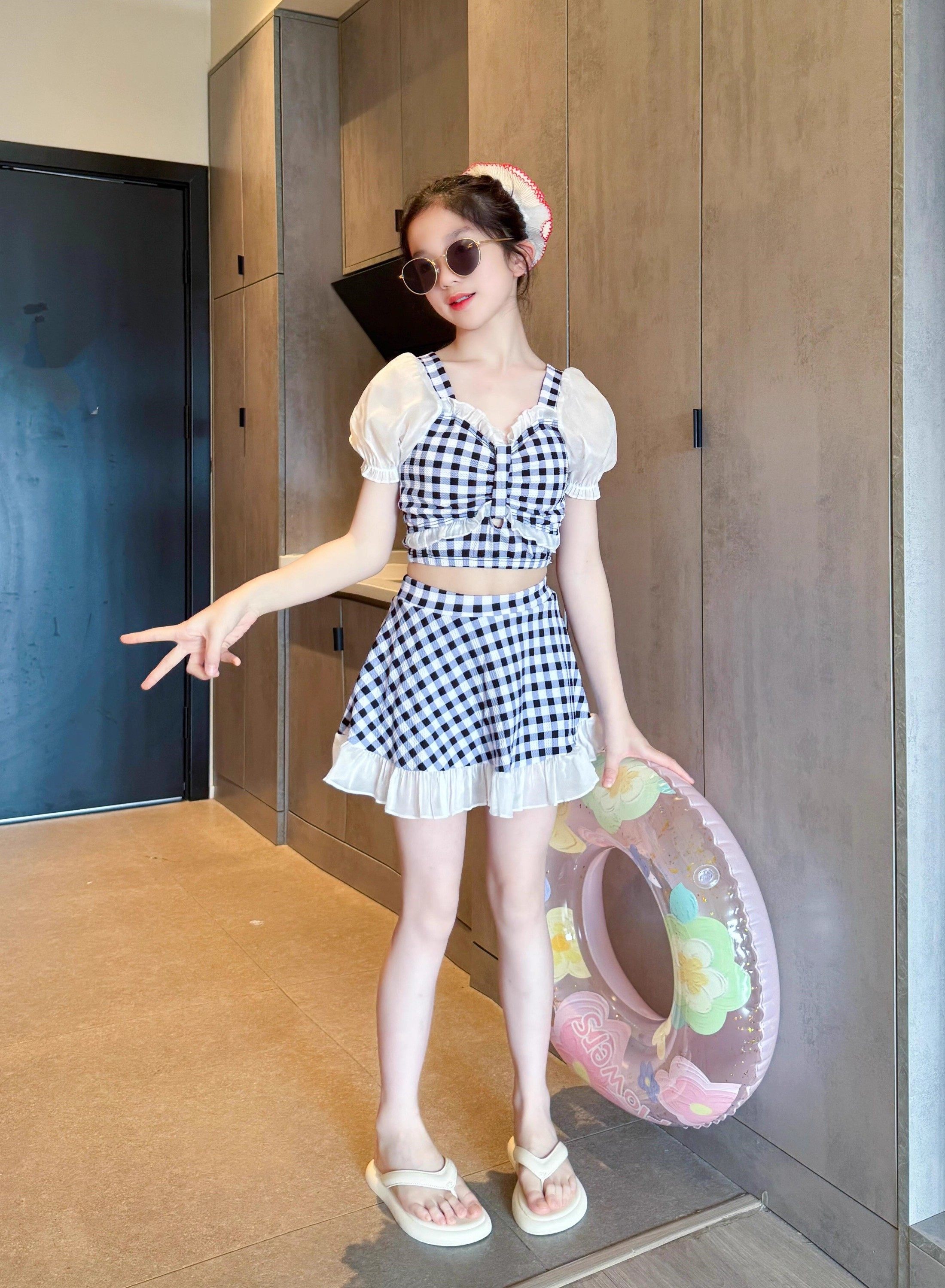 Girls' 2025 New Swimwear Summer Plaid Swimsuit Set for Older Children, Princess Style Girls' Swimwear, Fashionable