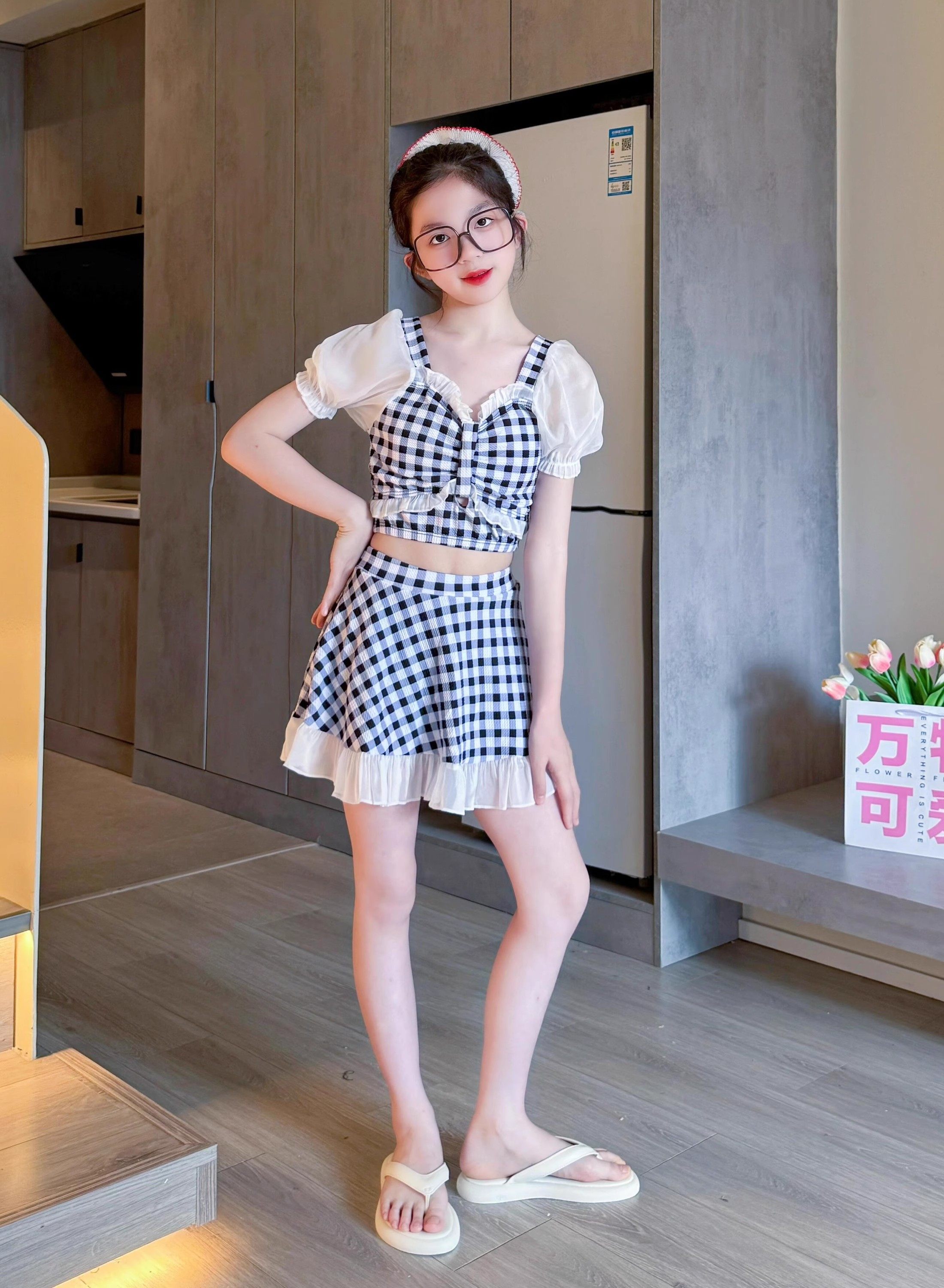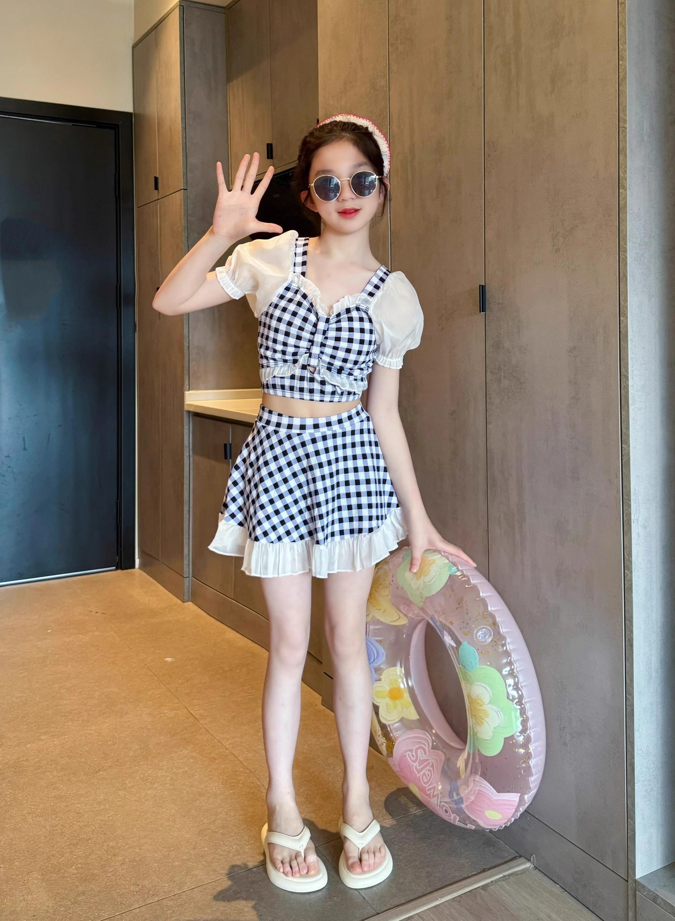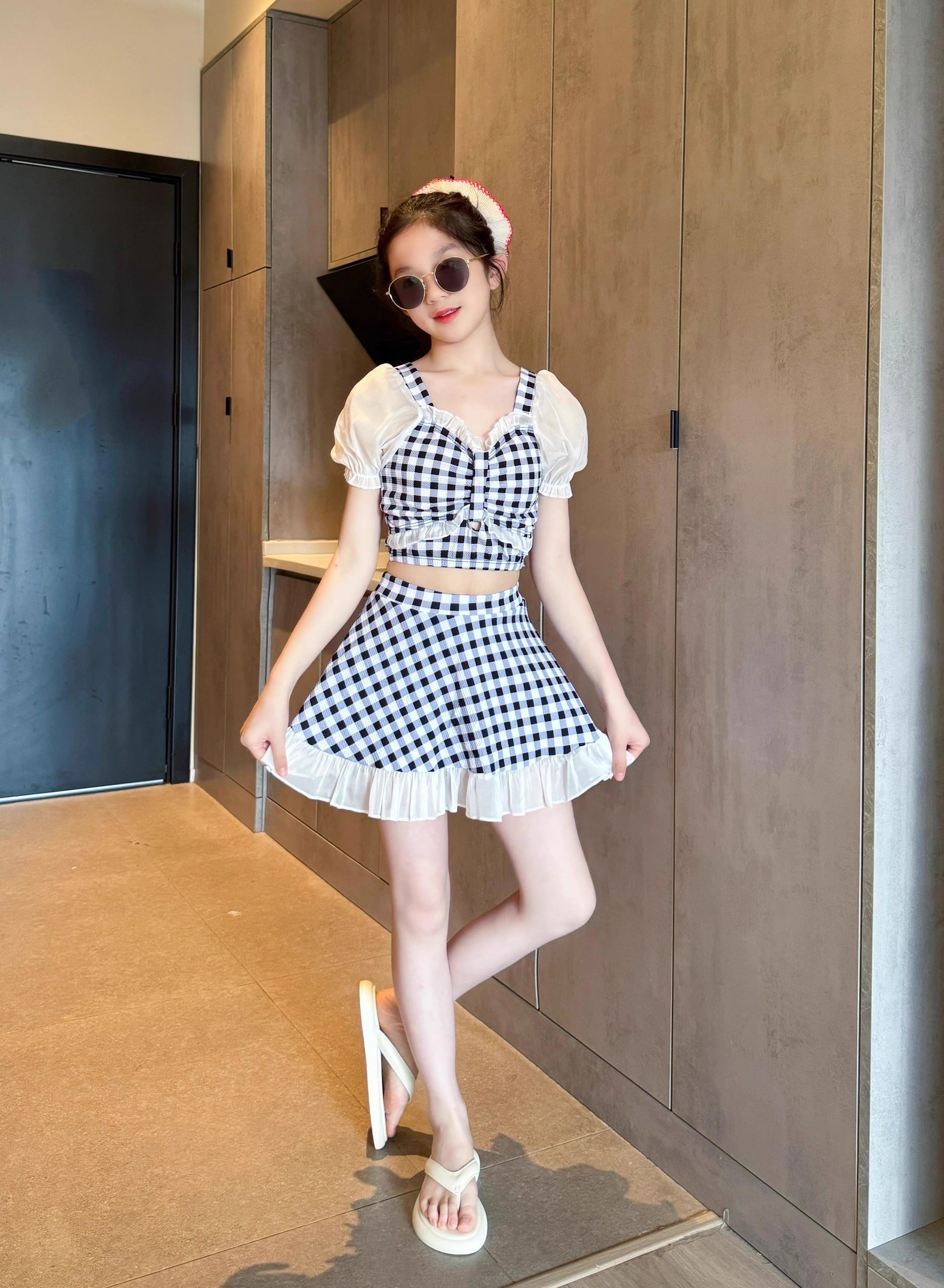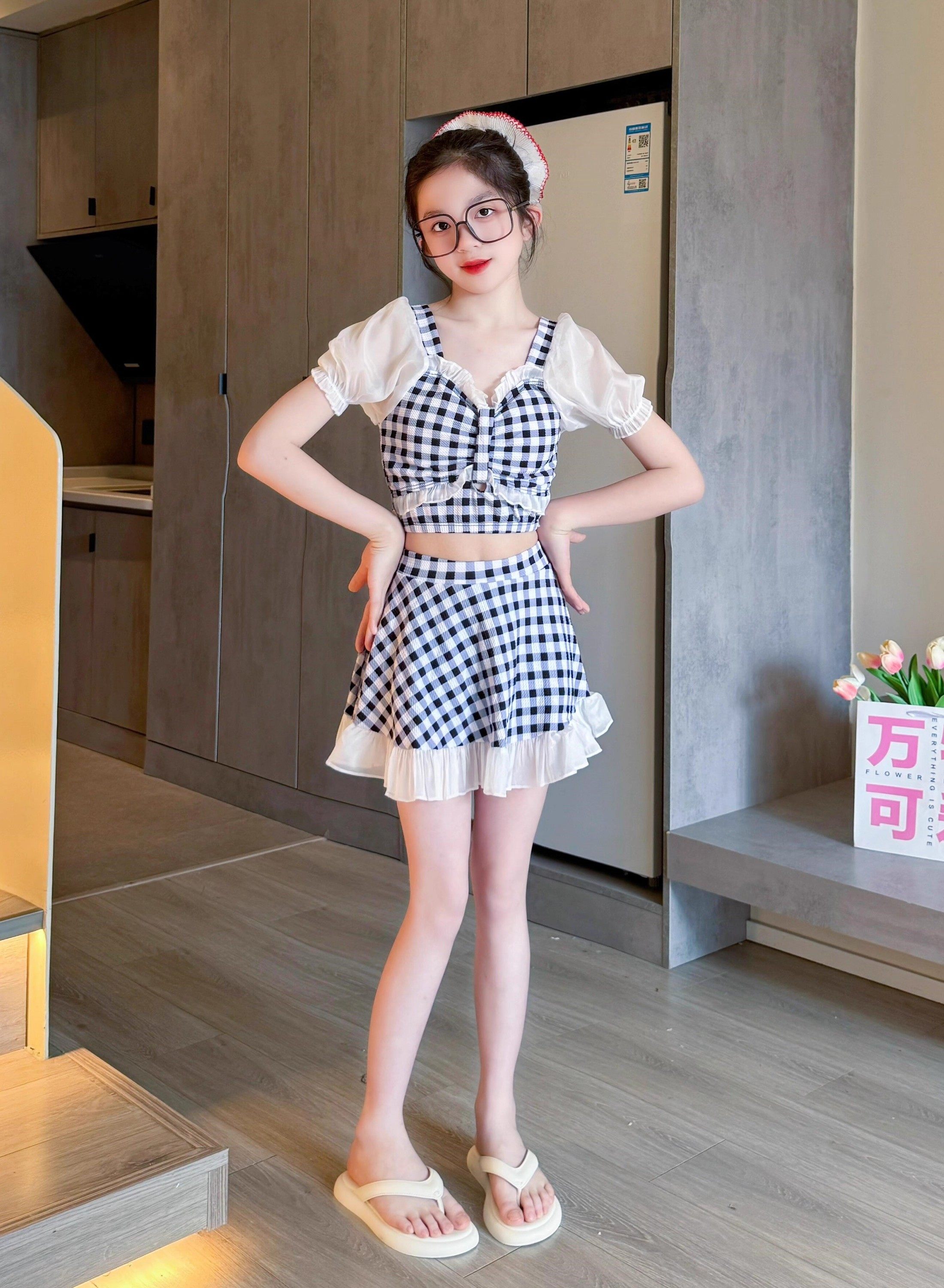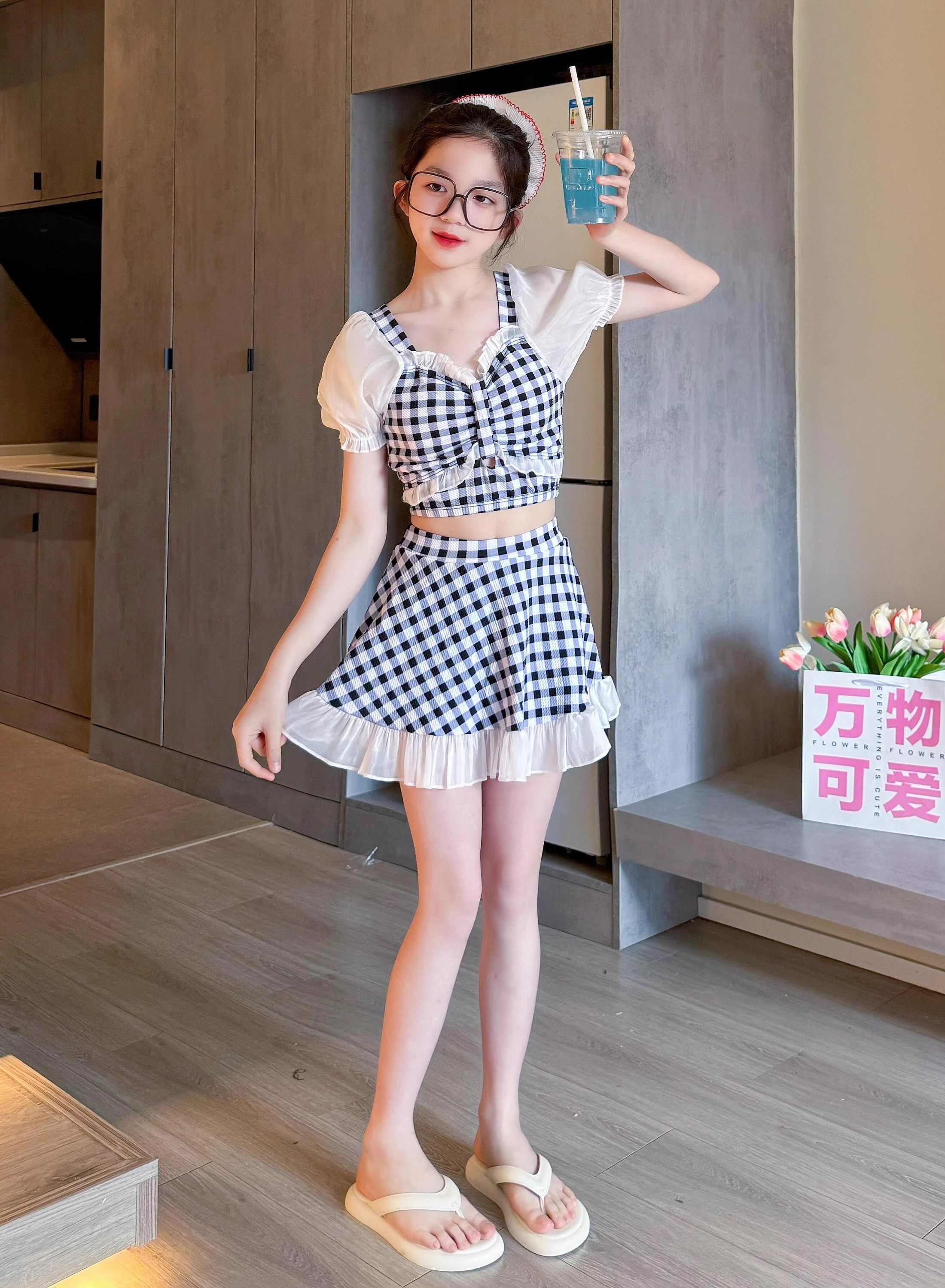 Girls' 2025 New Swimwear Summer Plaid Swimsuit Set for Older Children, Princess Style Girls' Swimwear, Fashionable
