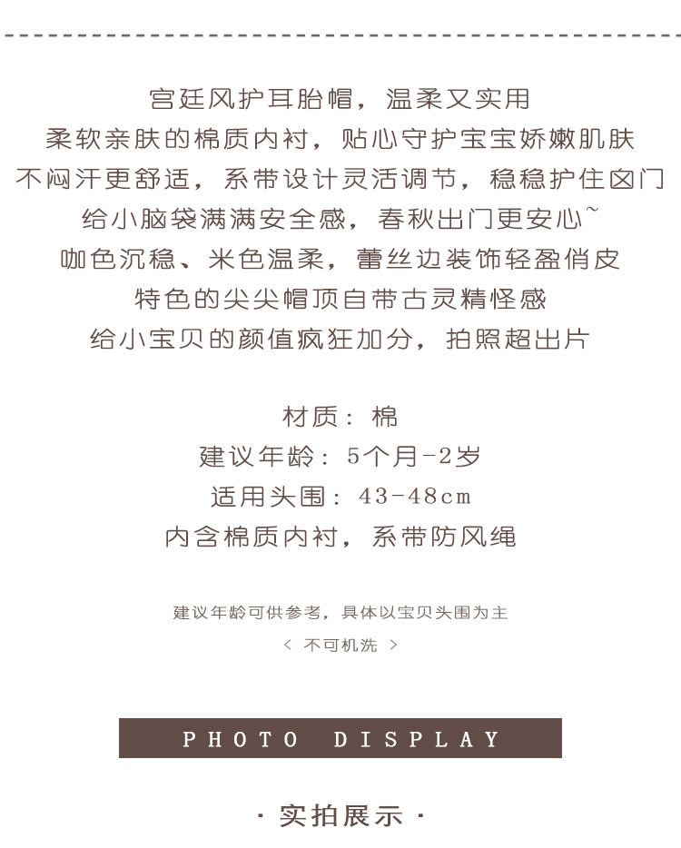 Baby hat, spring and autumn newborn baby hat, baby girl's pointy-cornered small-month-old palace ear protection hat