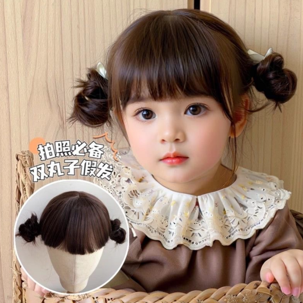 Children's Double Ball Head Wig for Women with Short Hair, Sweet and Cute Baby Hairstyle, Daily Breathable Air Bangs Full Headgear