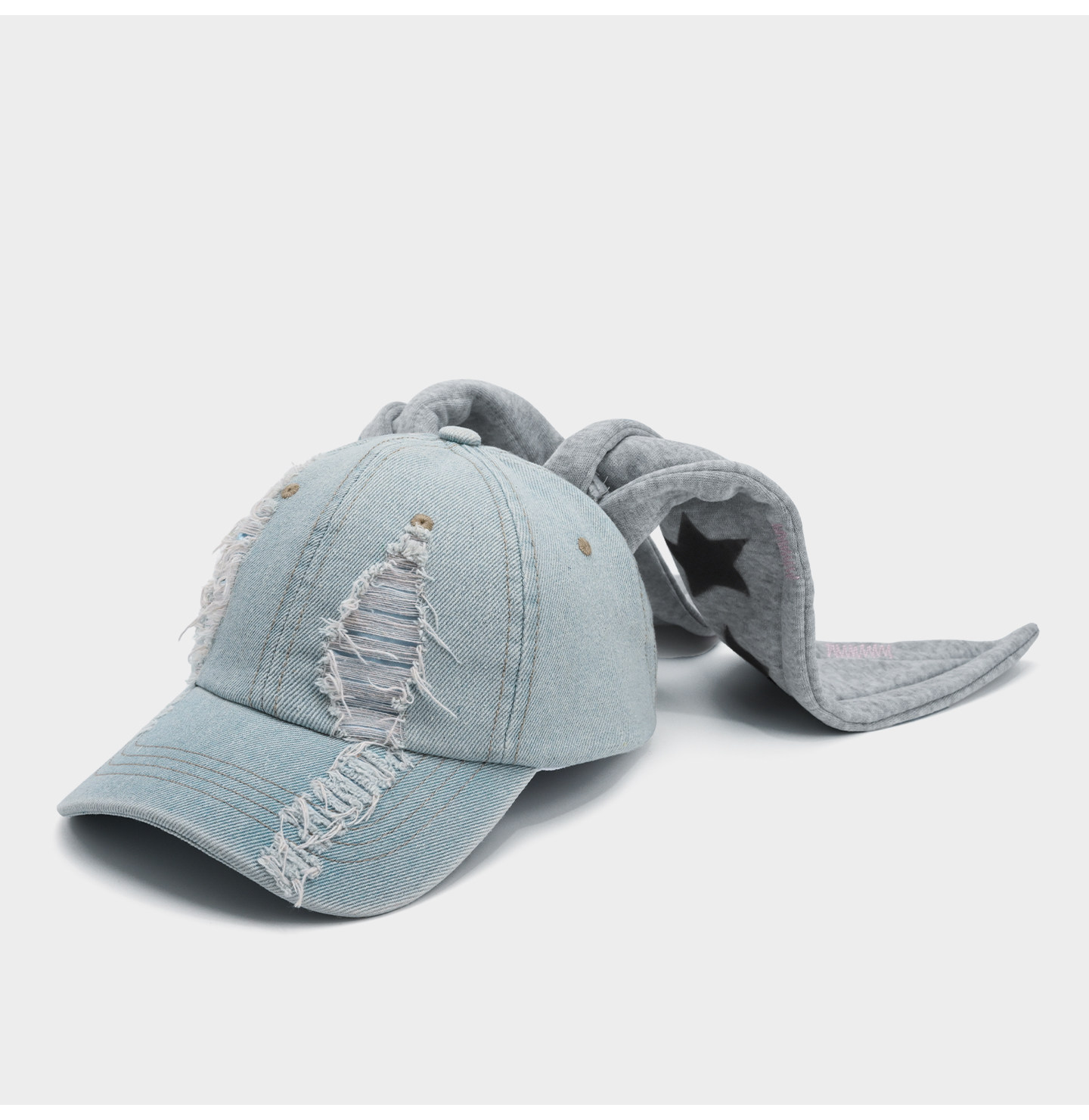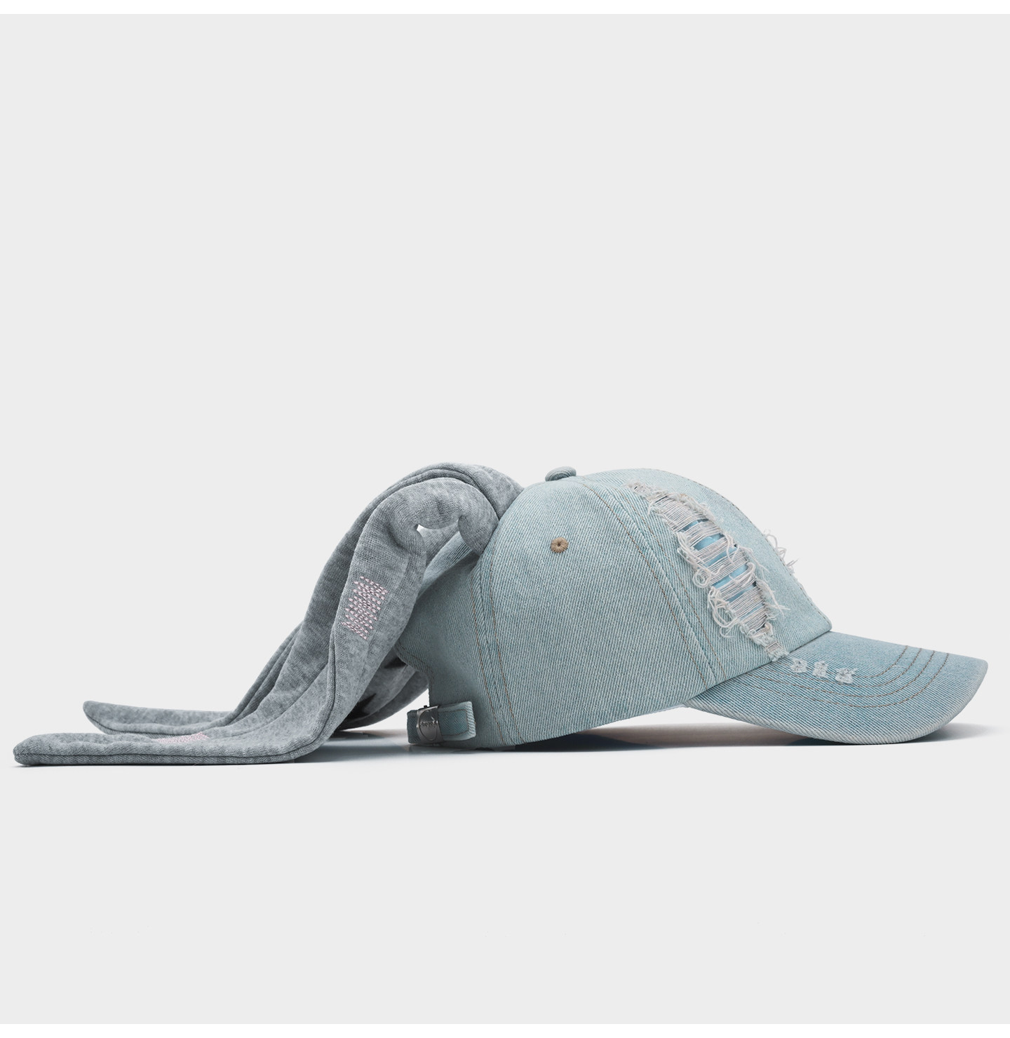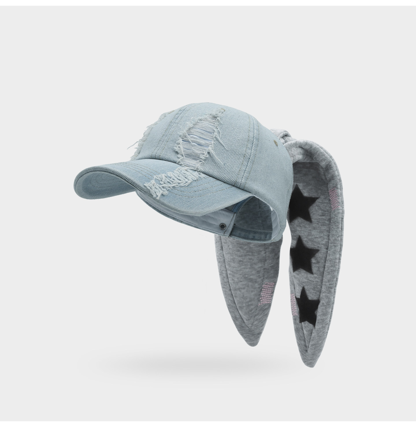 Korean Newjeans Style Rabbit Ear Baseball Cap for Women, Washed Denim, Ripped, Hip-Hop, Sweet and Cool, Trendy Baseball Hat