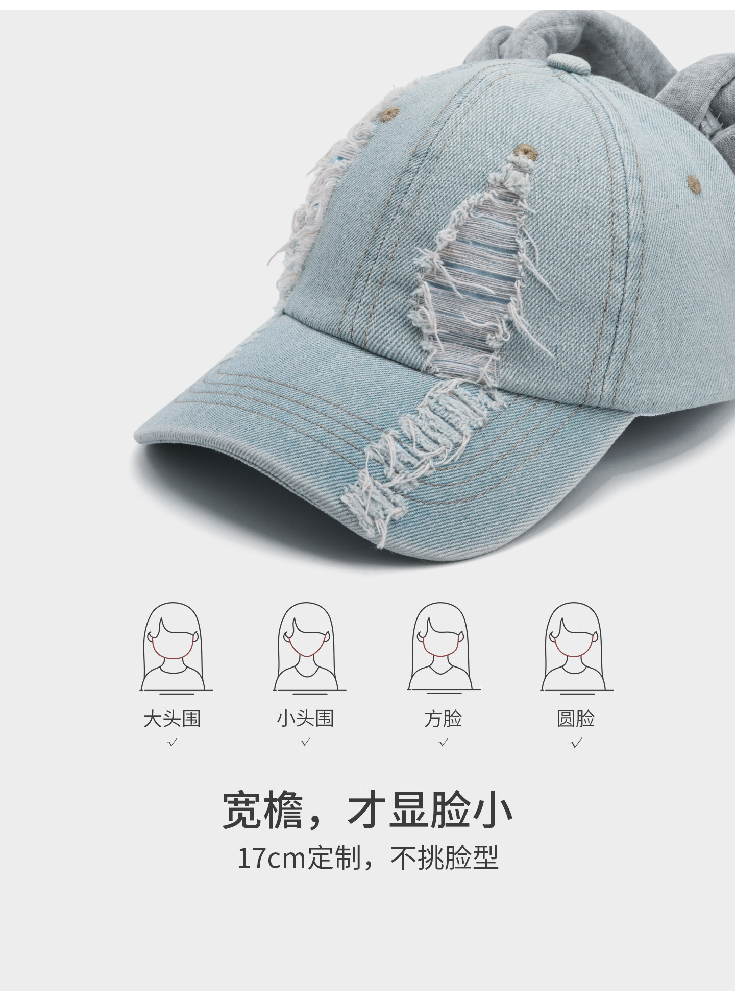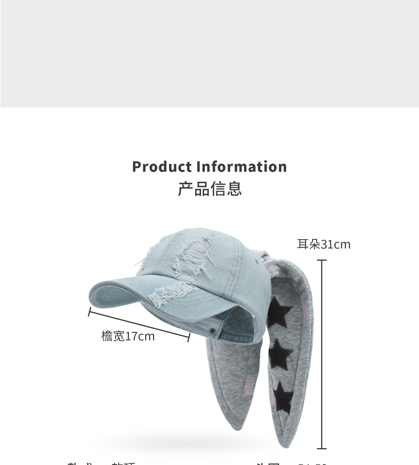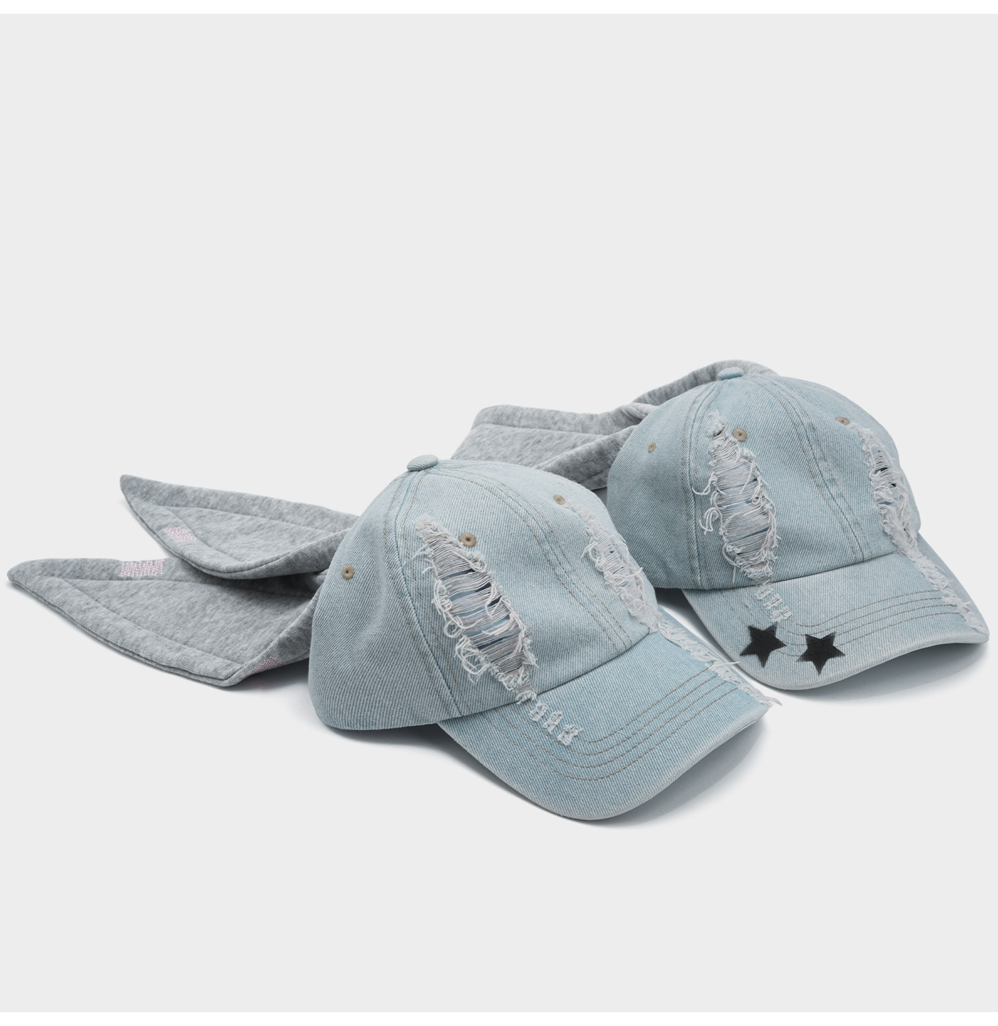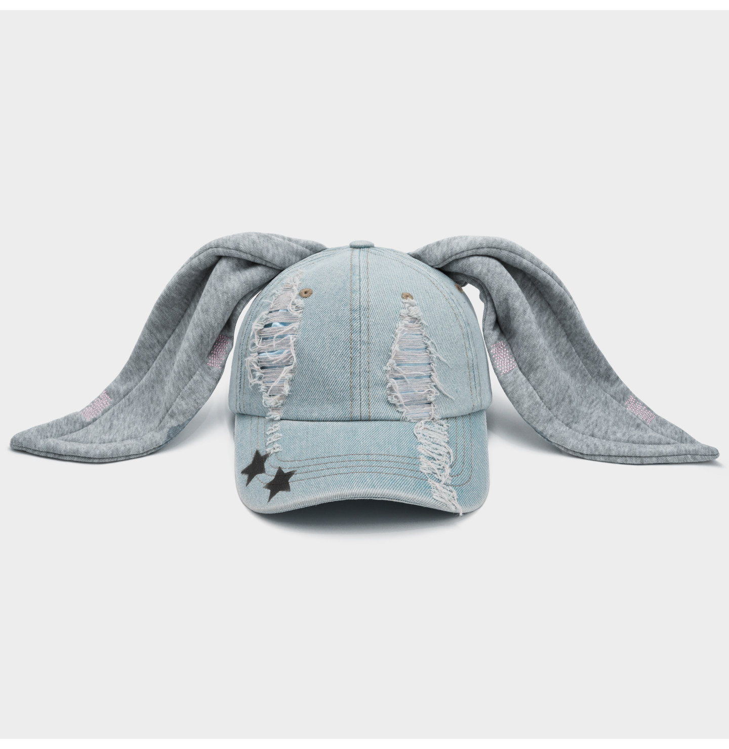 Korean Newjeans Style Rabbit Ear Baseball Cap for Women, Washed Denim, Ripped, Hip-Hop, Sweet and Cool, Trendy Baseball Hat