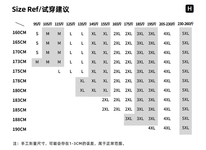 China (cm) 165 / 88-90 170 / 96-98 175 / 108-110 180 / 118-122 185 / 126-130