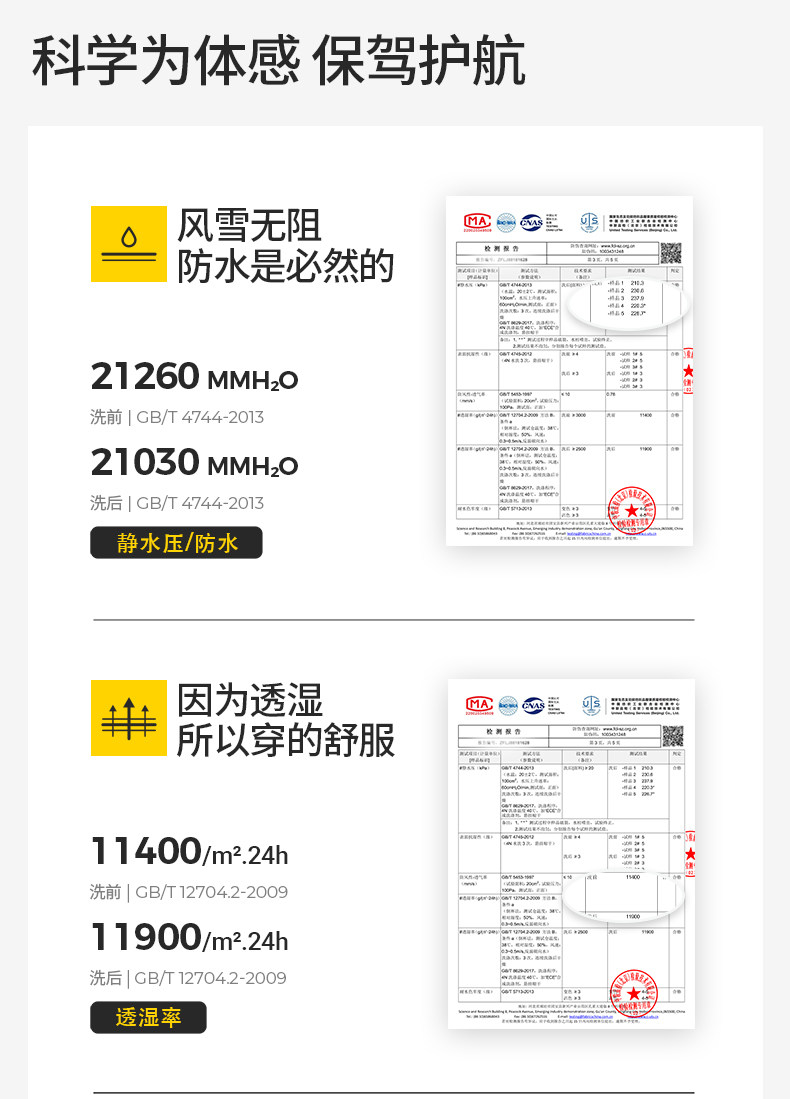 Waterproof Hydrostatic Pressure> 20000Mmh₂O,Surface Moisture Resistance: ≥4-5 Levels before Washing, ≥3-4 Levels after Washing