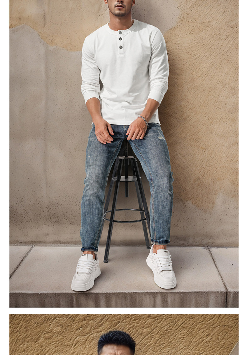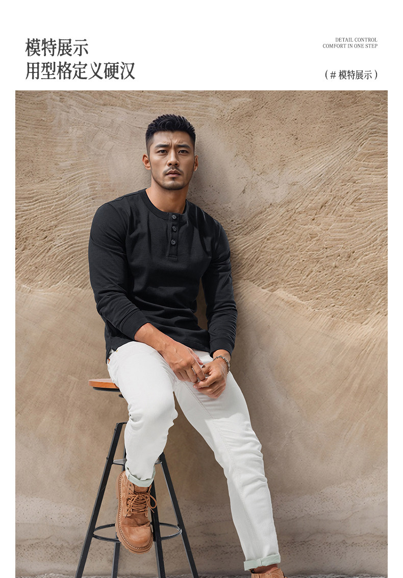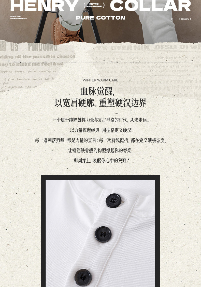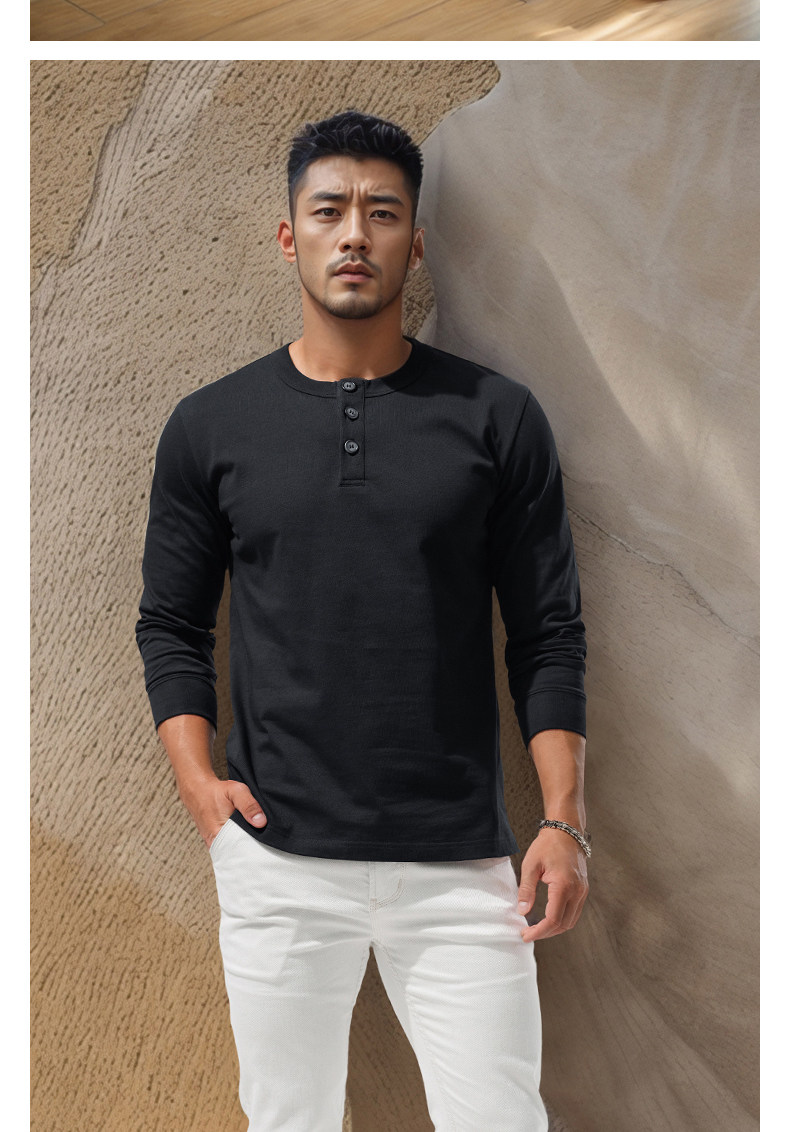 American Retro Henry Shirt for Men, Long-Sleeved, Loose-Fitting, 280g Heavyweight Thick Pure Cotton Casual T-Shirt, Autumn Base Layer Shirt
