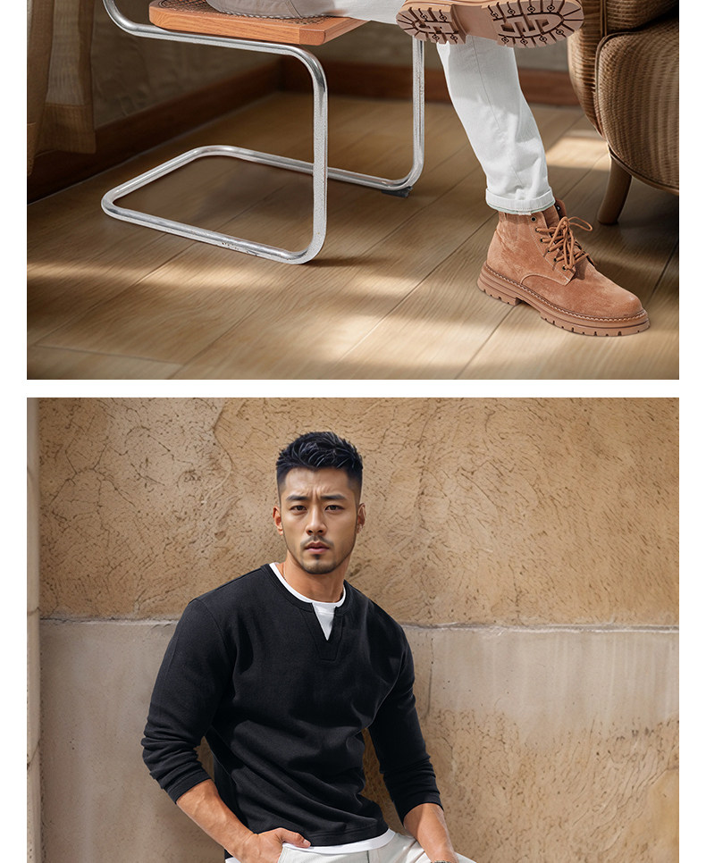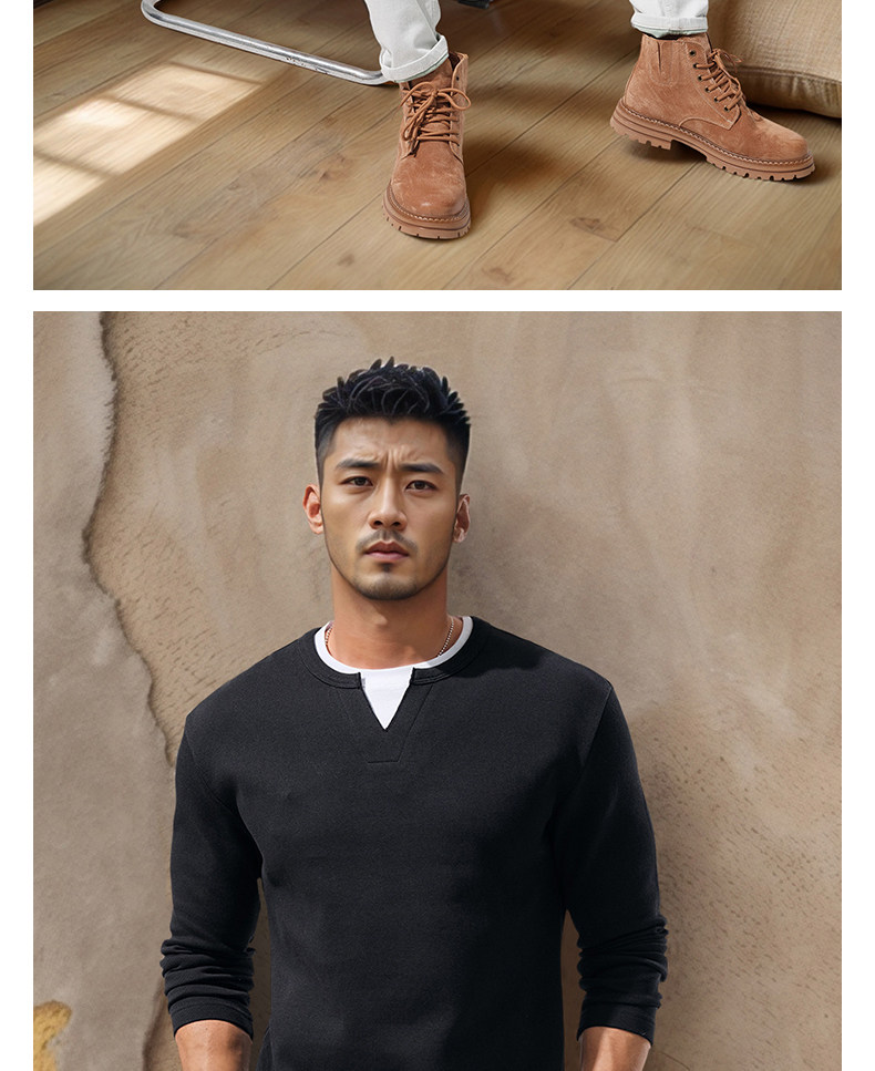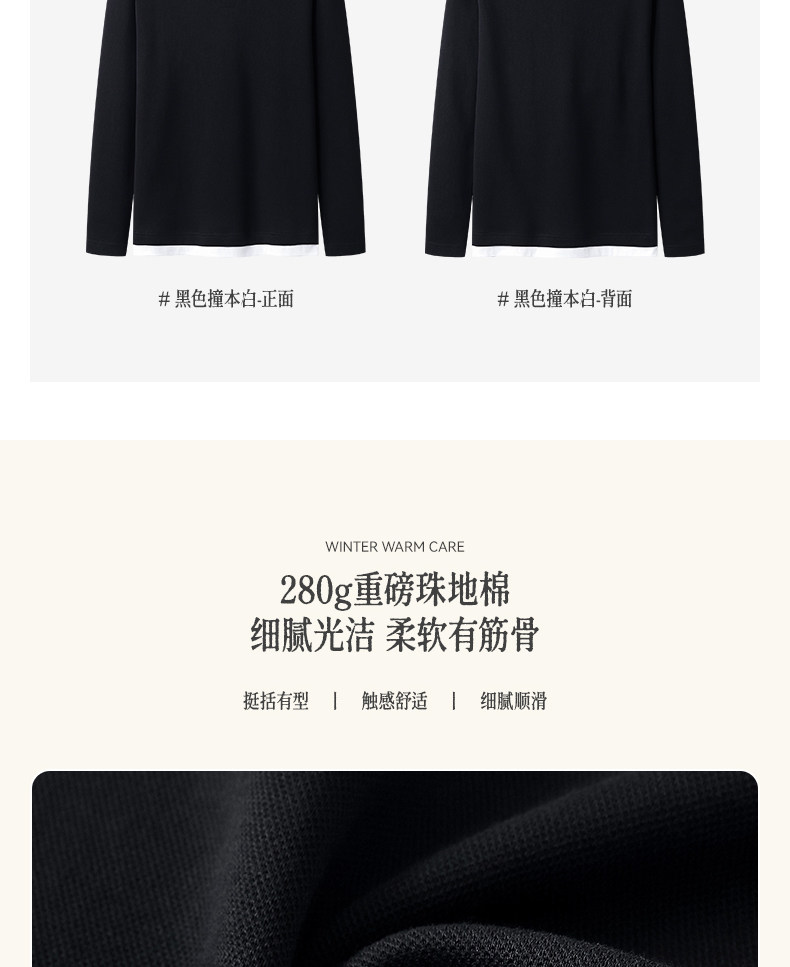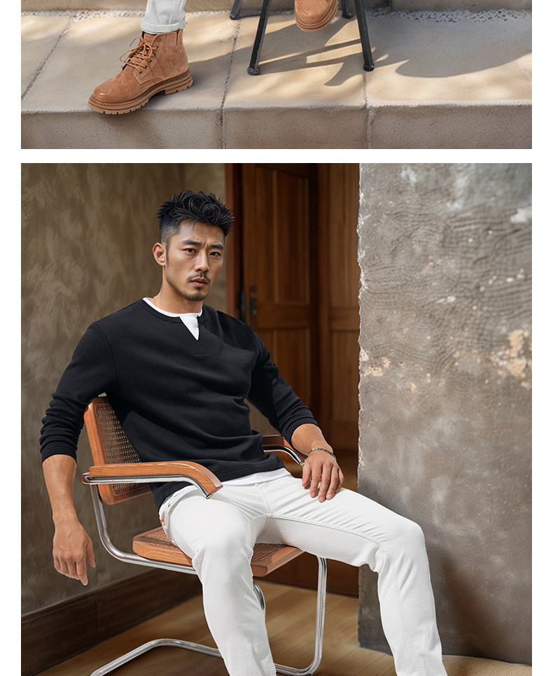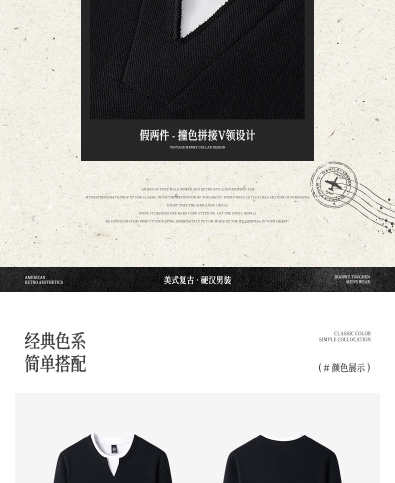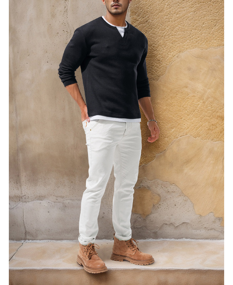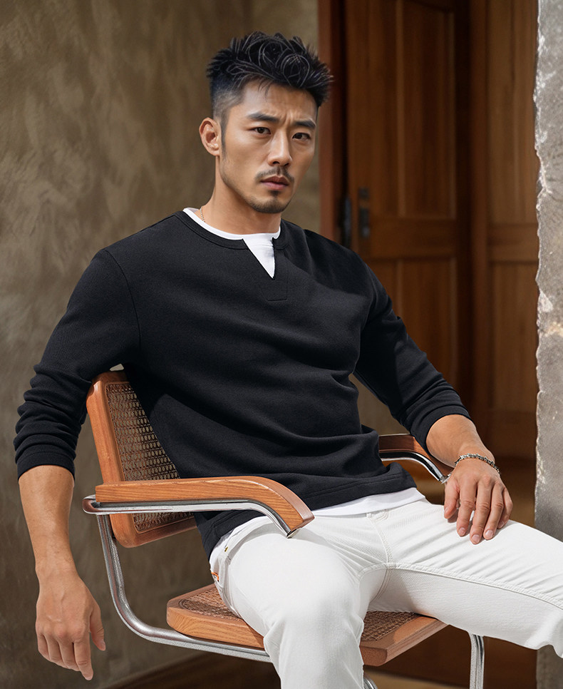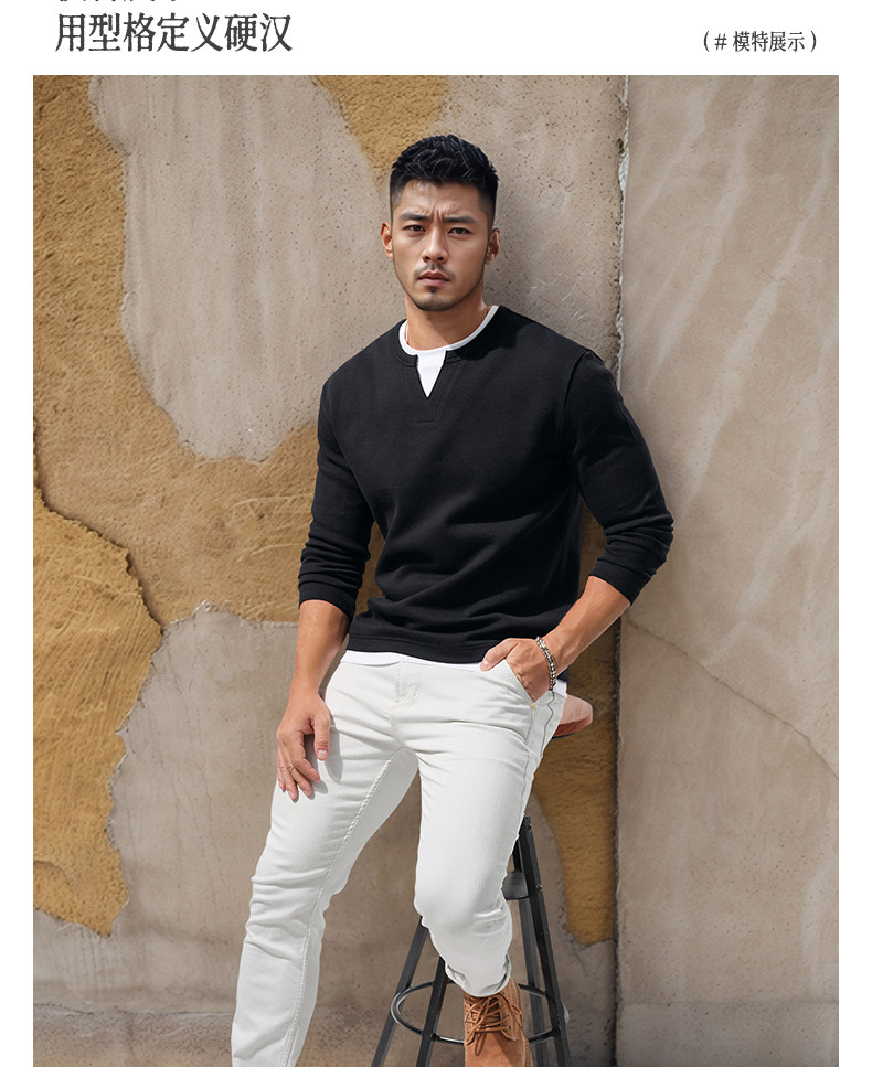 280g Heavyweight Fake Two-Piece Long-Sleeve T-Shirt for Men, Loose Solid Color Cotton Small V-Neck Color-Block Casual Top for Autumn Wear