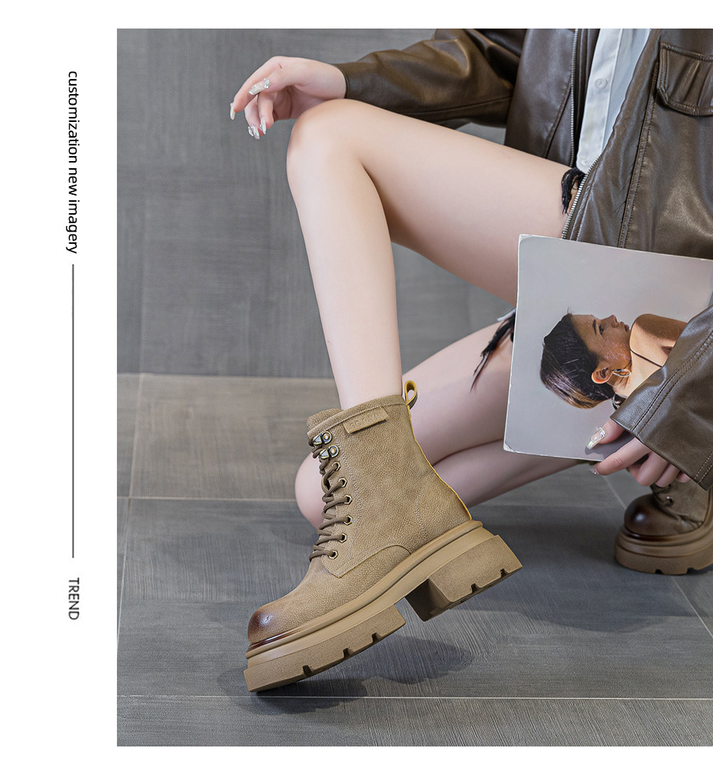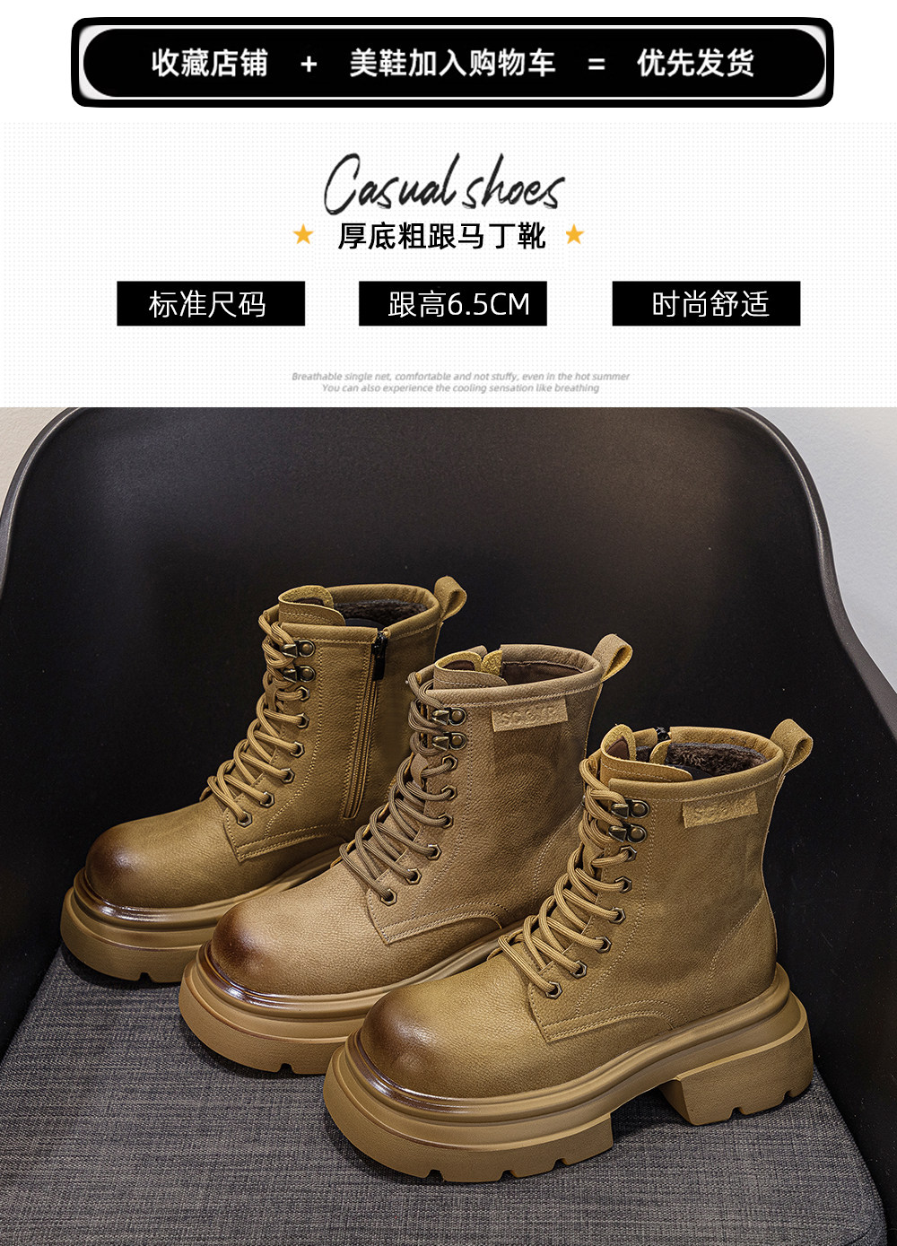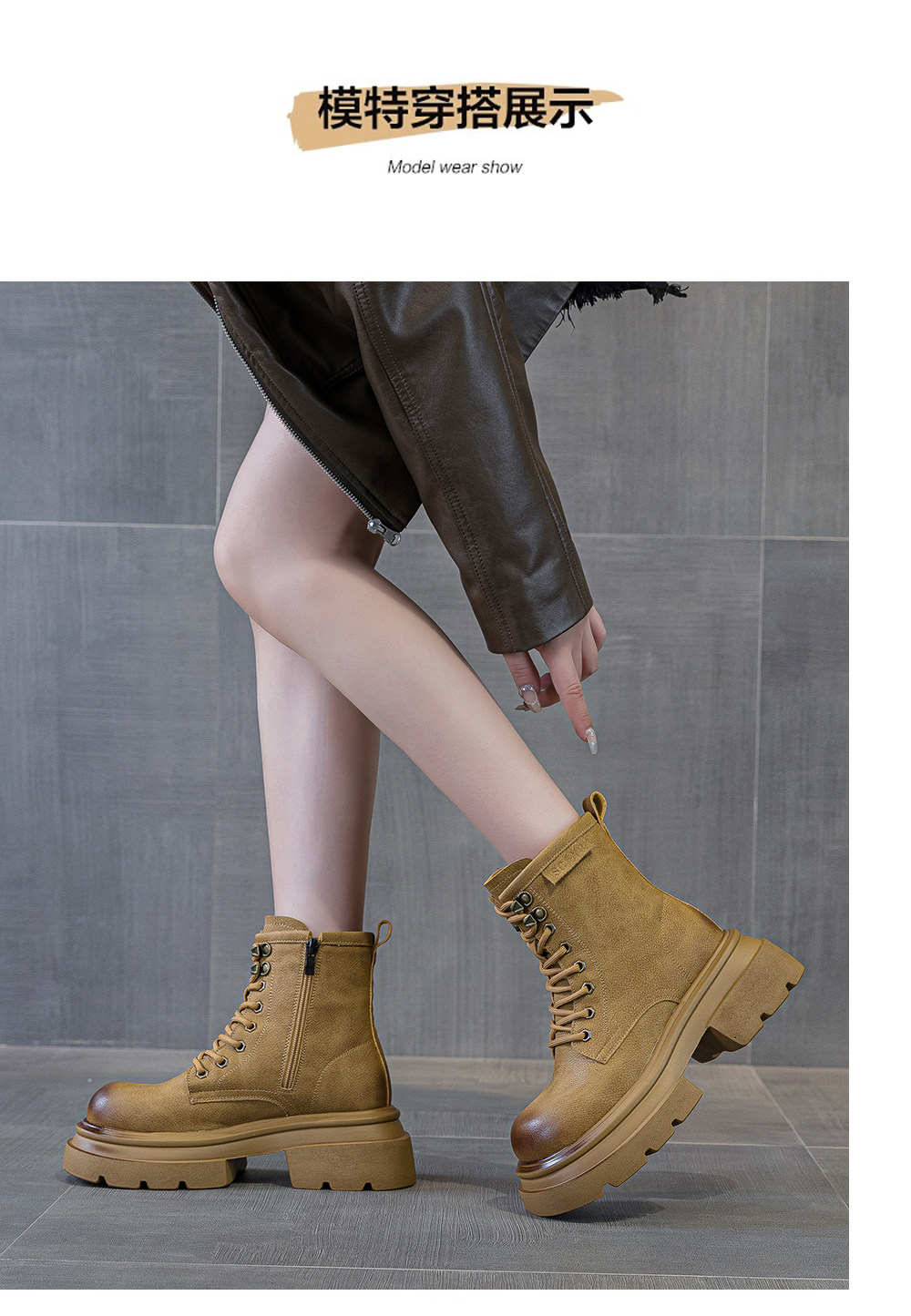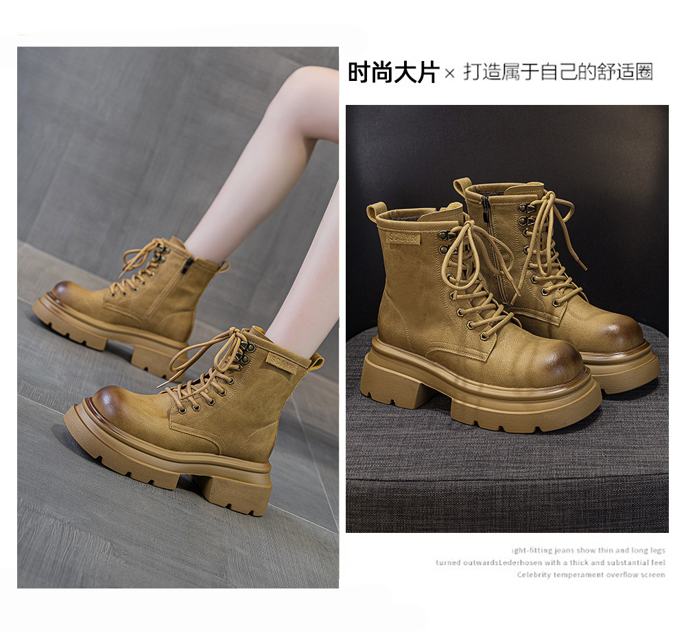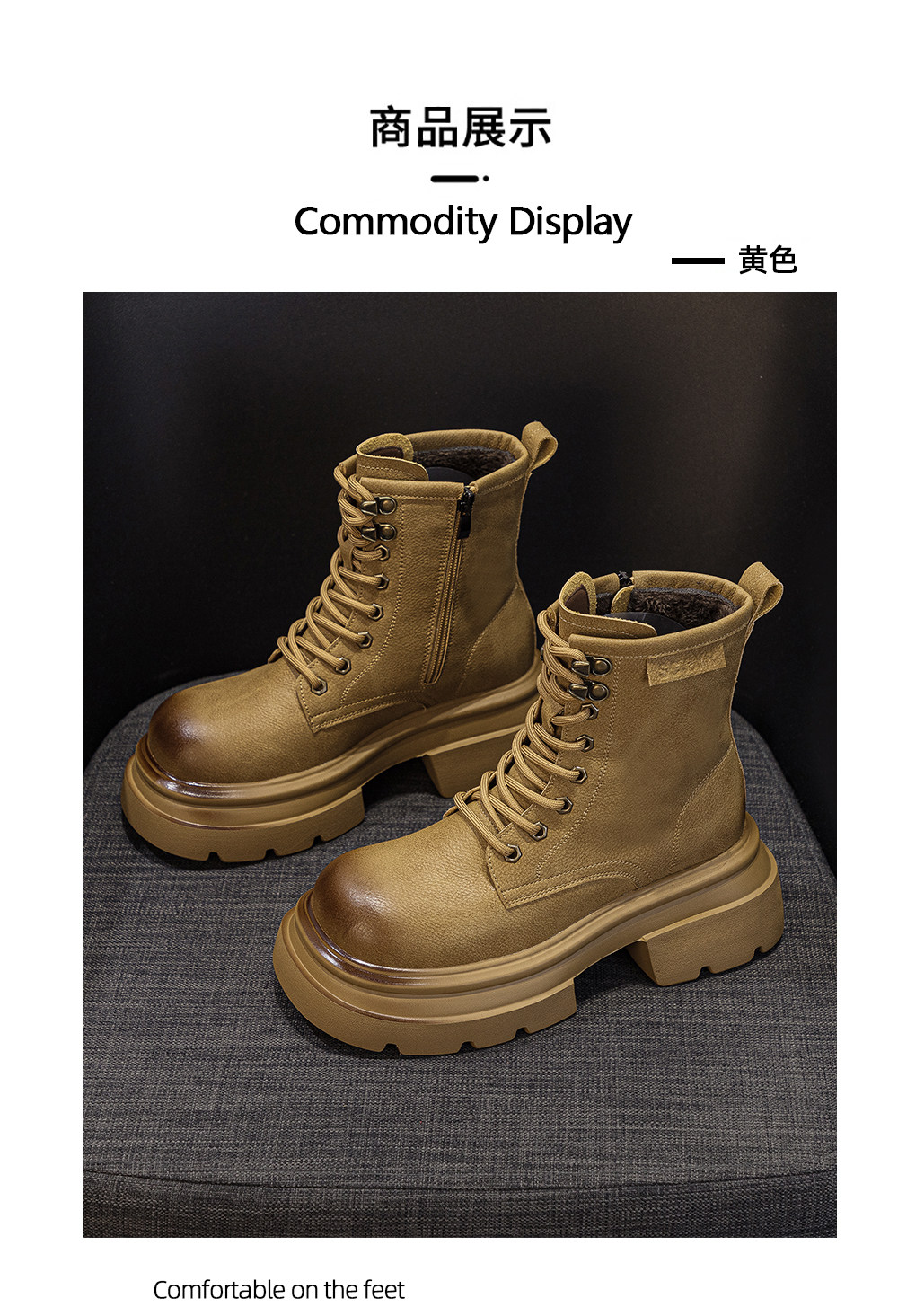 Thick-Soled Martin Boots for Women 2025 New Winter British Style Chunky Heel Short Boots Retro Round Toe Mid-Calf Fleece-Lined Yellow Boots