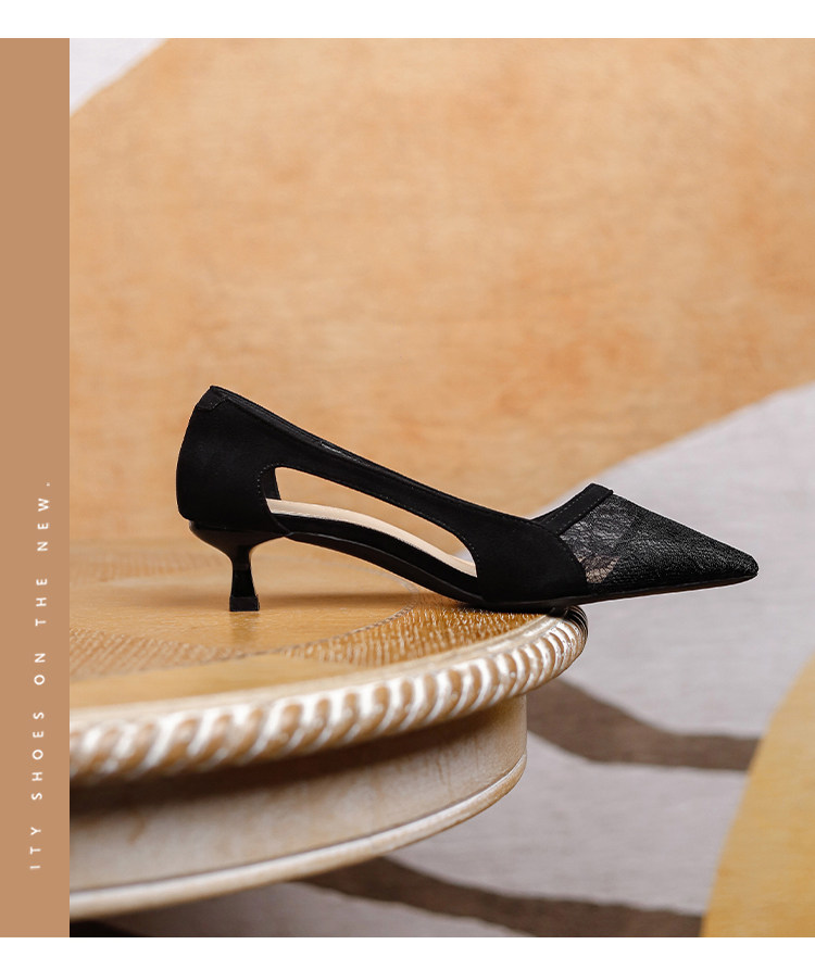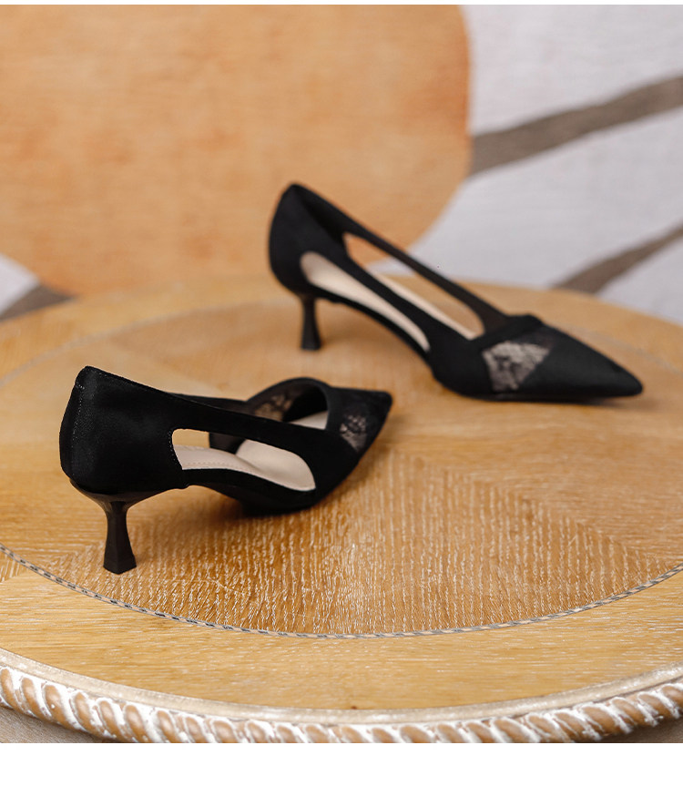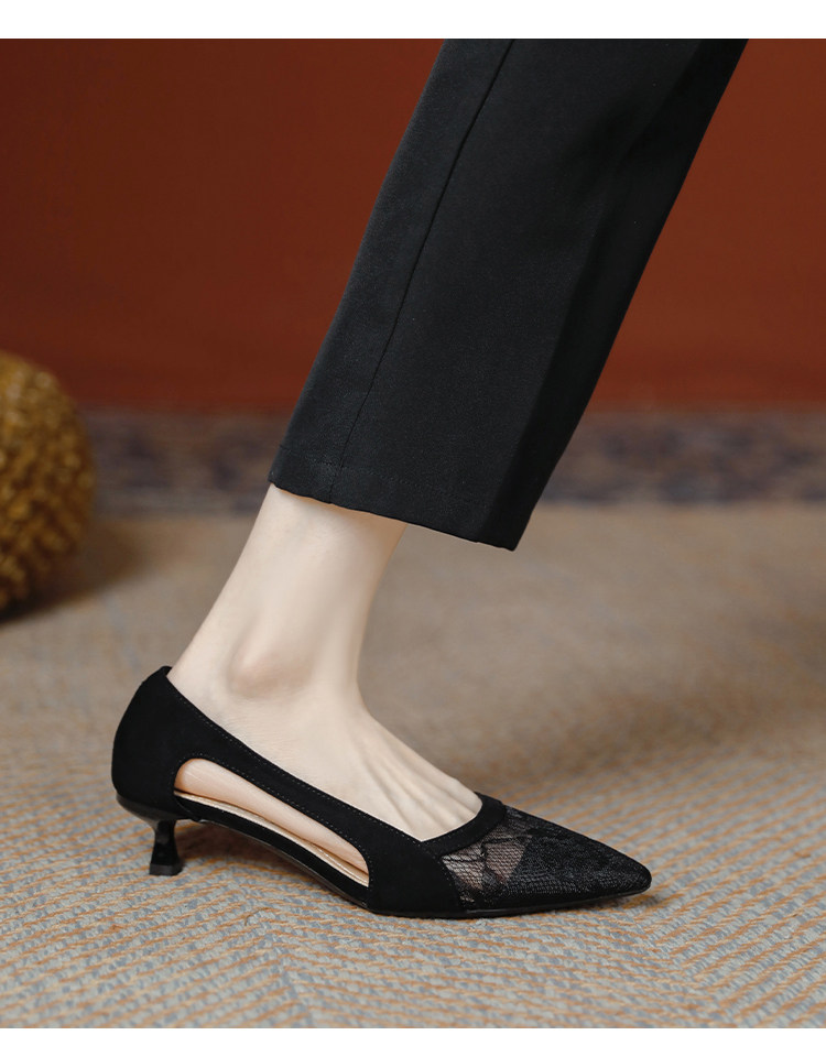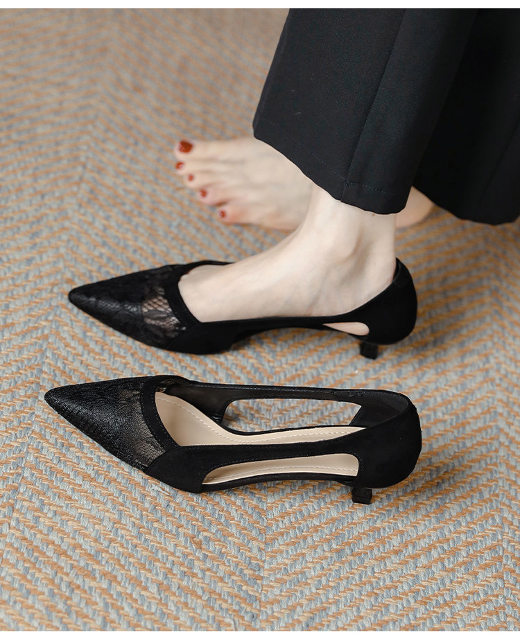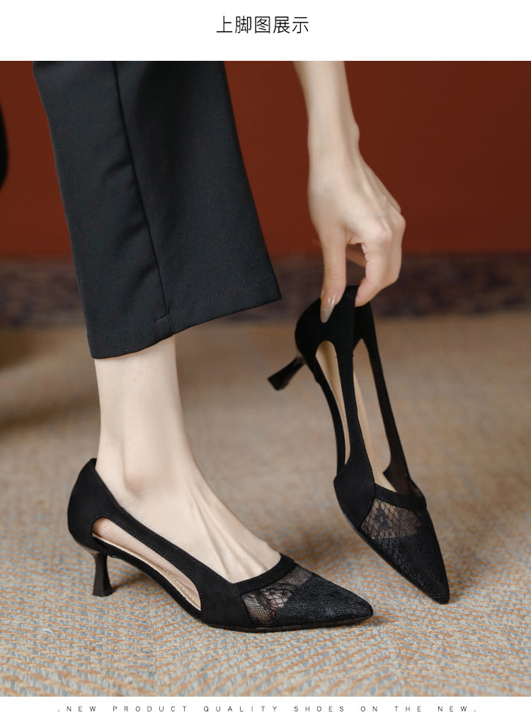 Summer Professional Work Shoes for Women 2025 New Breathable Hollow Mesh Black Stiletto Low Heel Work High Heels