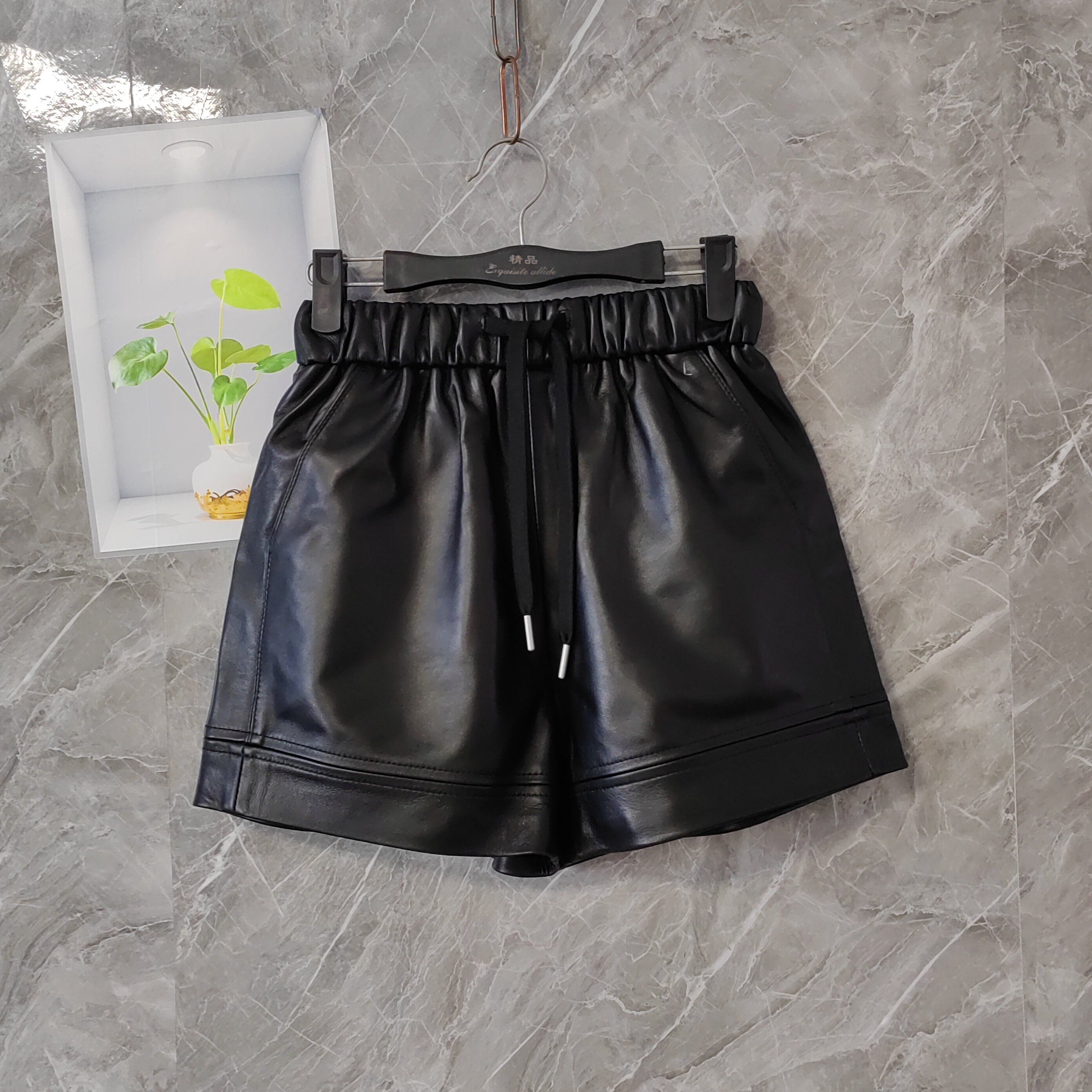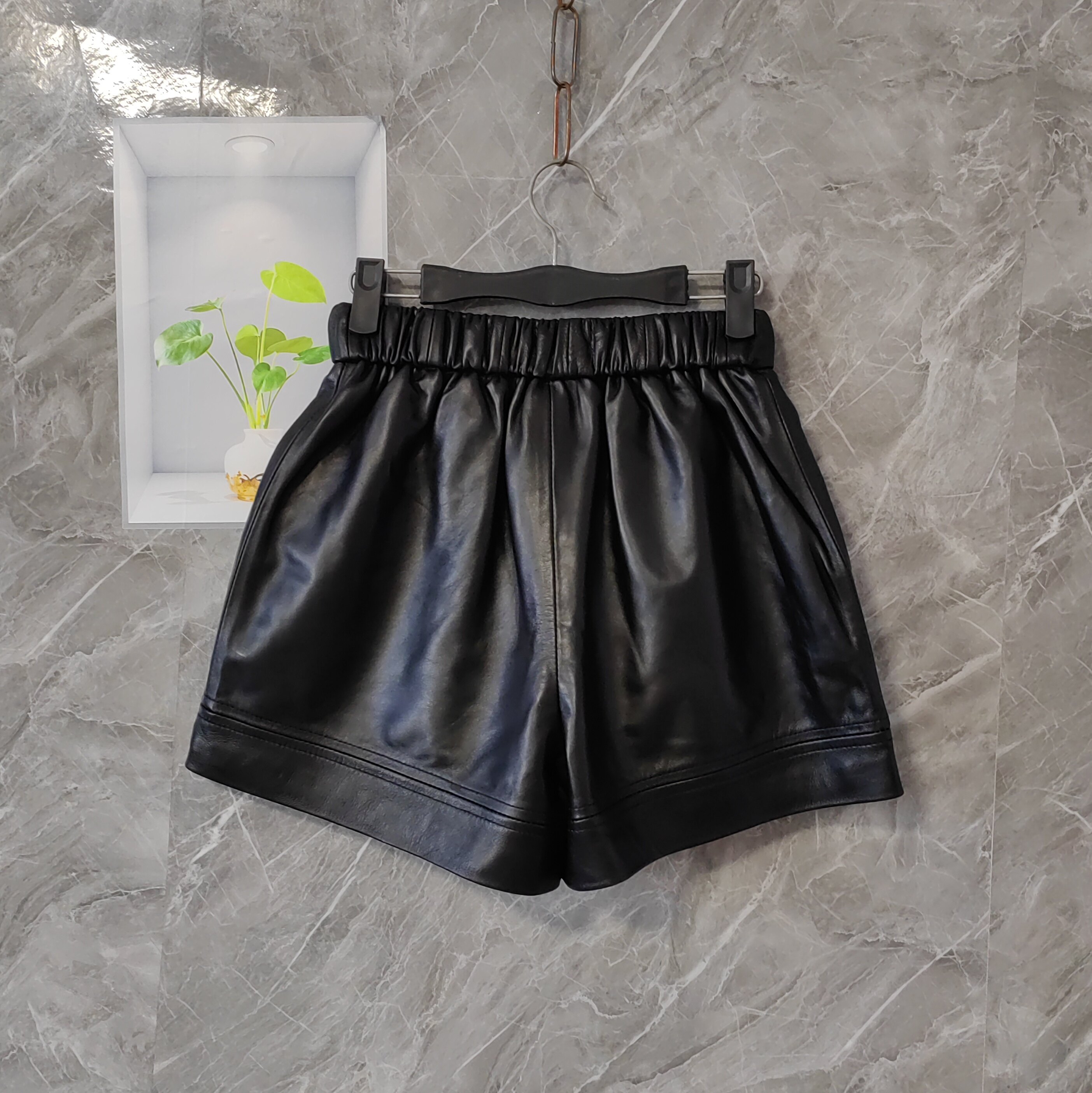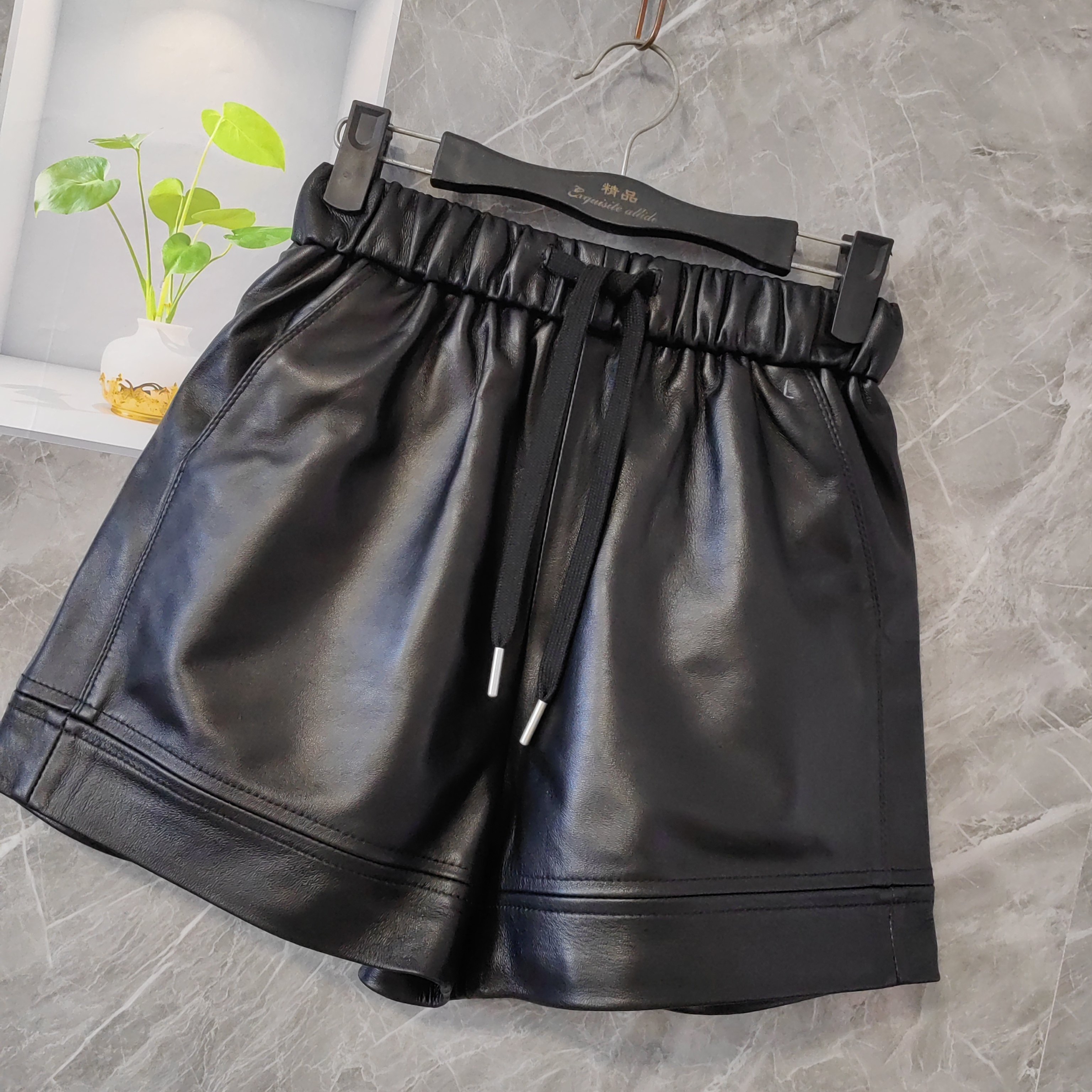New Genuine Leather Pants Women's Elastic Waist Casual Versatile Wide Leg Pants A-Line Pants Boot Pants Shorts Fashionable Versatile Slimming