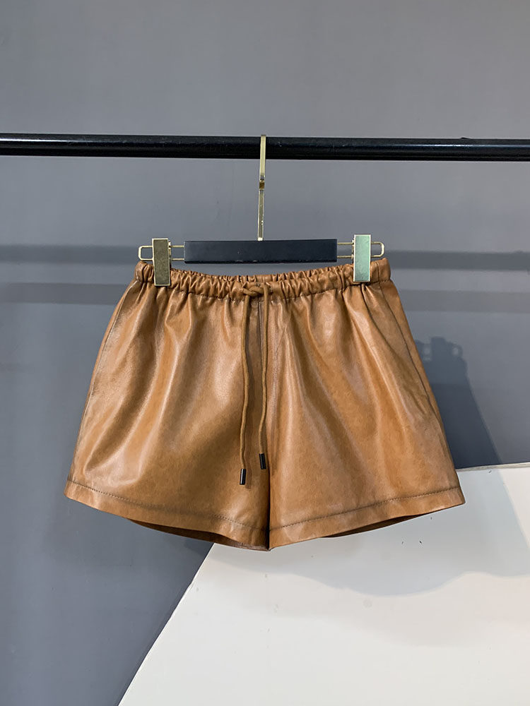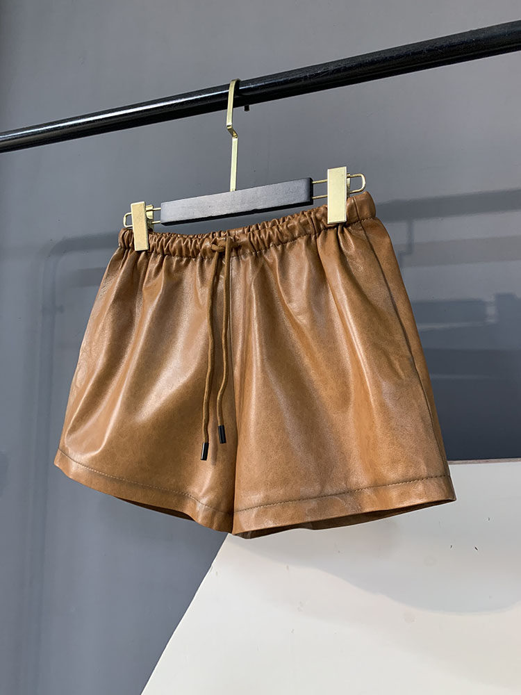 2025 Autumn New Genuine Leather Shorts Women's Fashion Simple Elastic Waist Drawstring Slimming Sheepskin Wide Leg Leather Pants