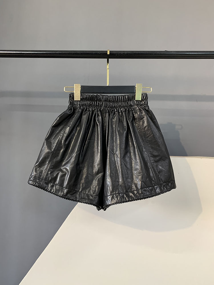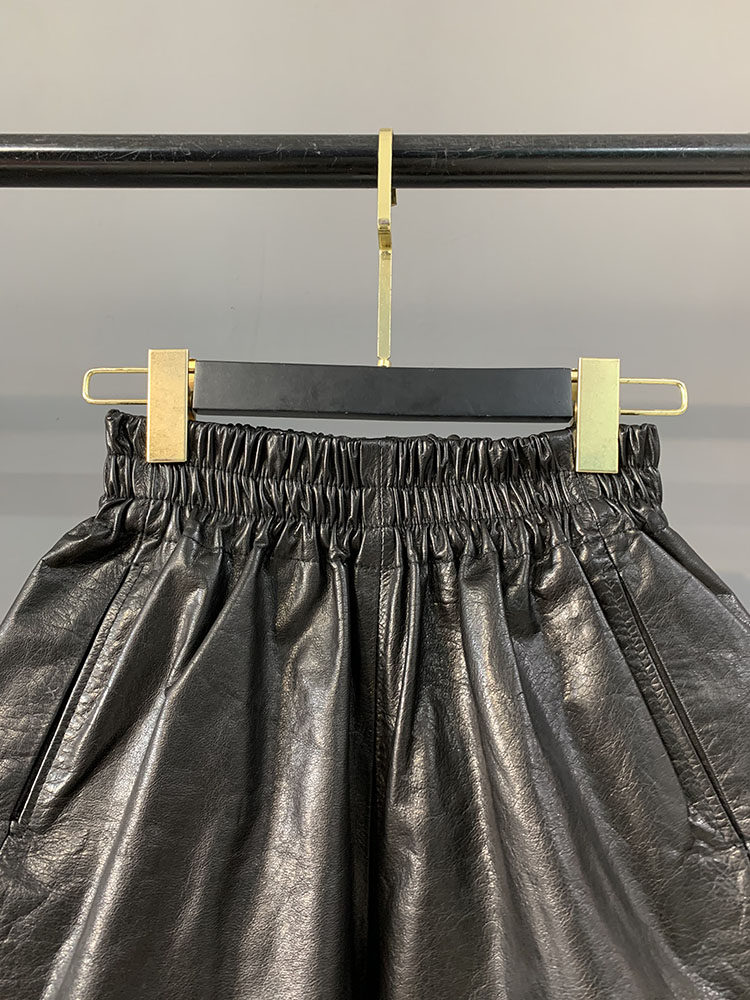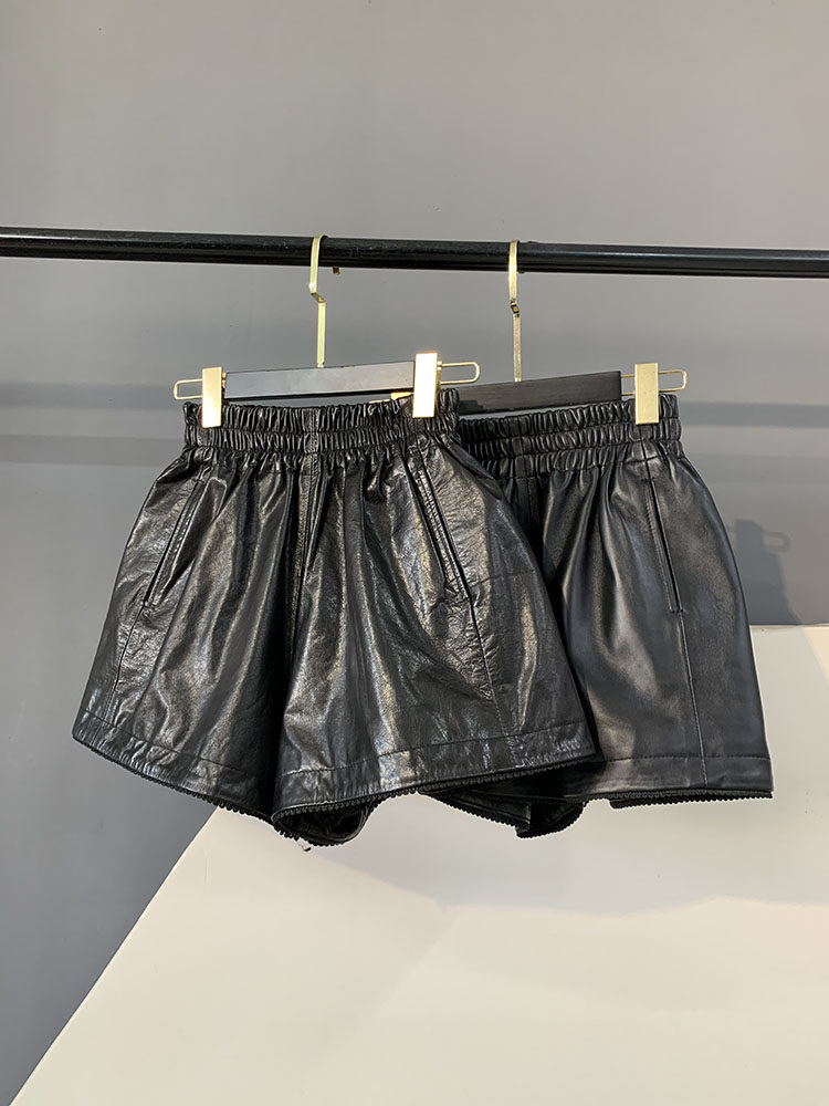 2025 Autumn New Retro Oil Wax Genuine Leather Pants Women's High Waist Slim Sheepskin Straight Boot Pants Wide Leg Shorts
