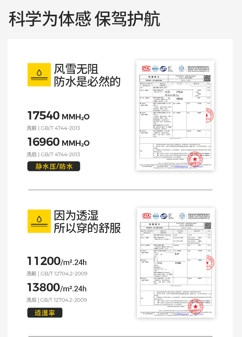 Waterproof Surface Moisture Resistance: ≥4-5 Levels before Washing, ≥3-4 Levels after Washing,Hydrostatic Pressure> 15000Mmh₂O