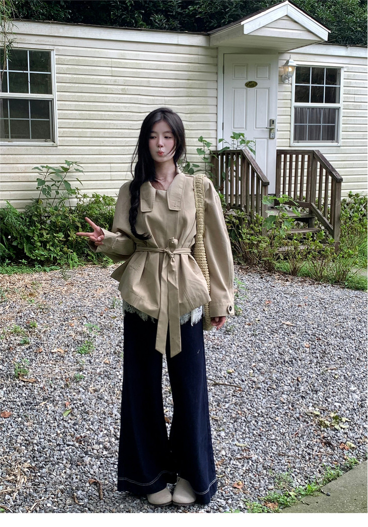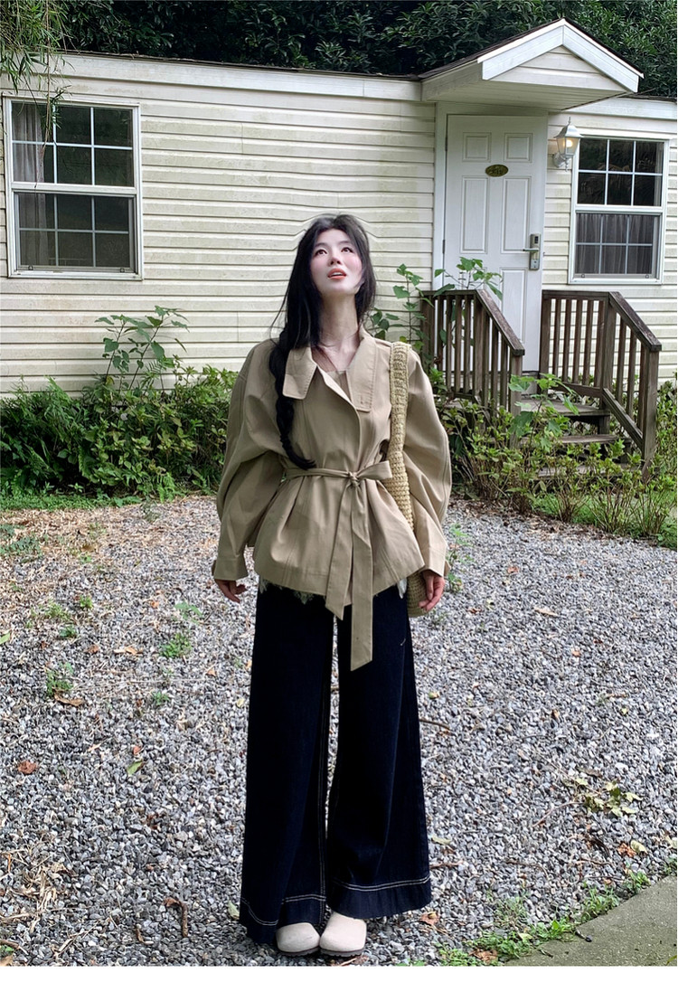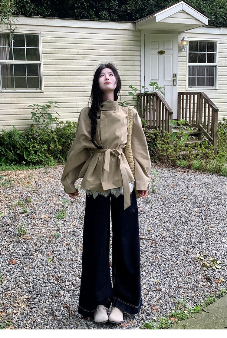 British style retro stand-collar short windbreaker jacket, feminine Korean style winter wear, strappy waist jacket top