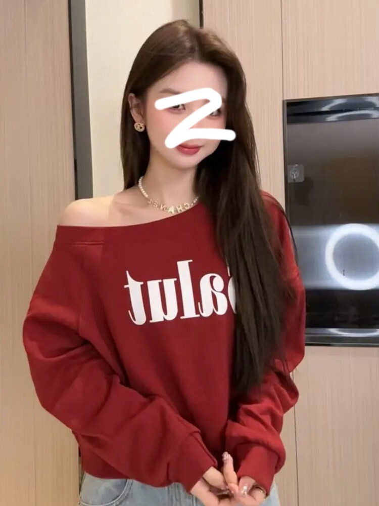 2025 Early Autumn Korean Style Loose Slimming Versatile Casual Fashionable Long Sleeve Off-Shoulder Asymmetrical Neck Printed Sweatshirt for Women