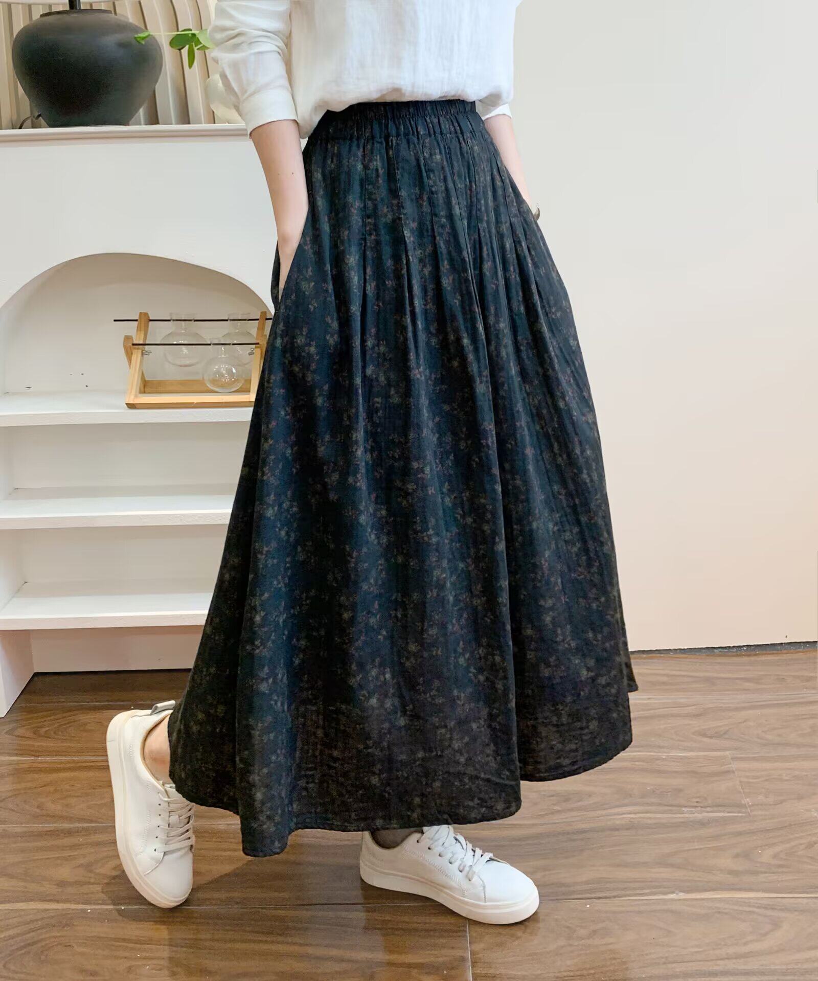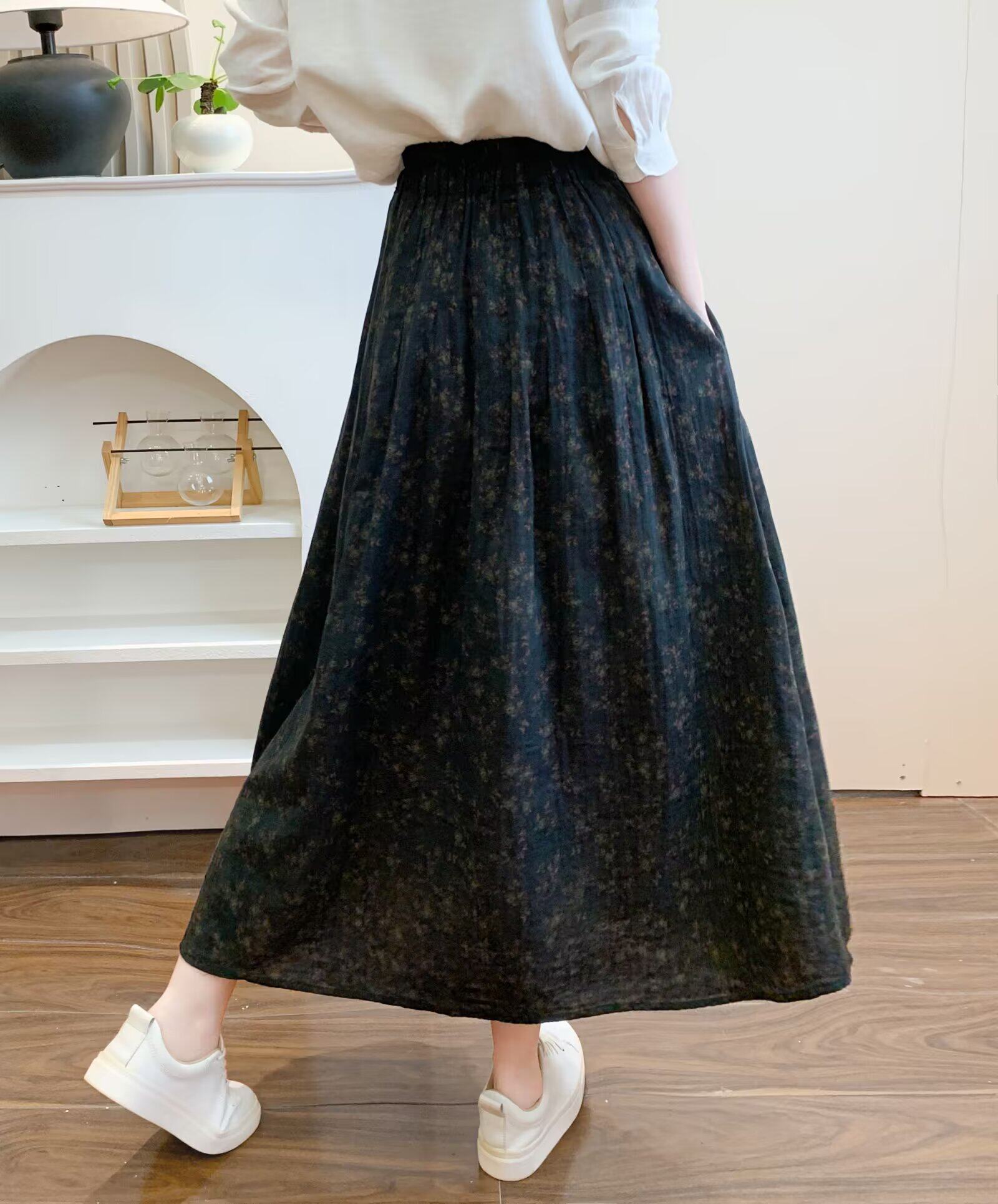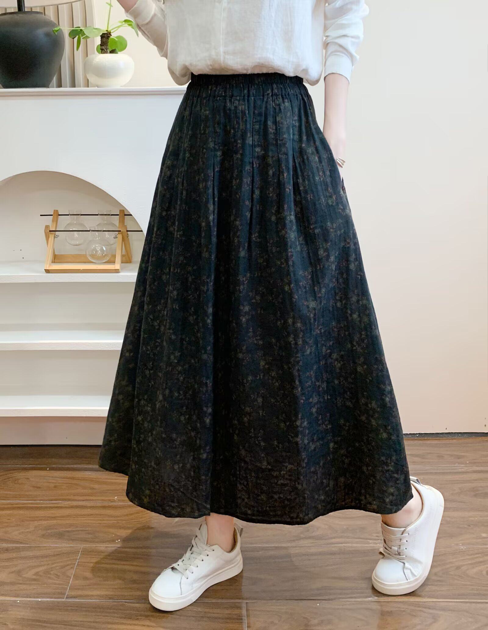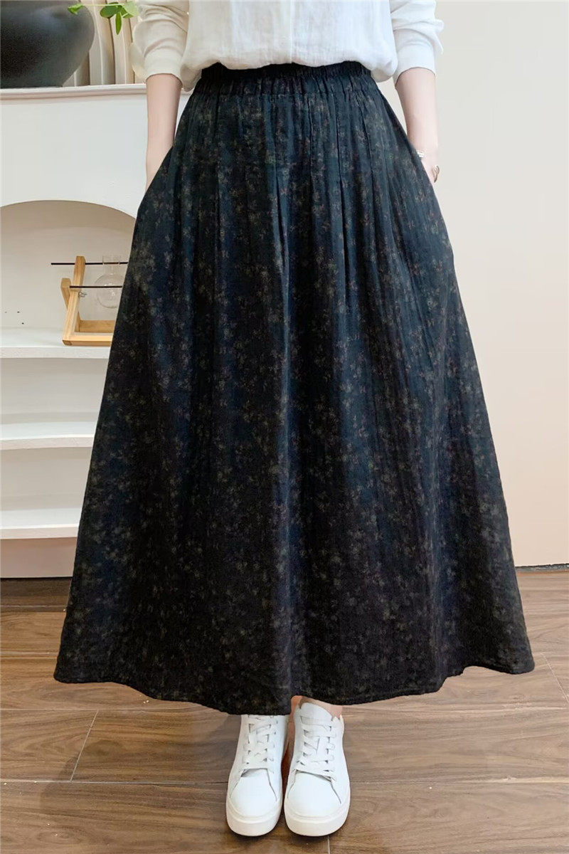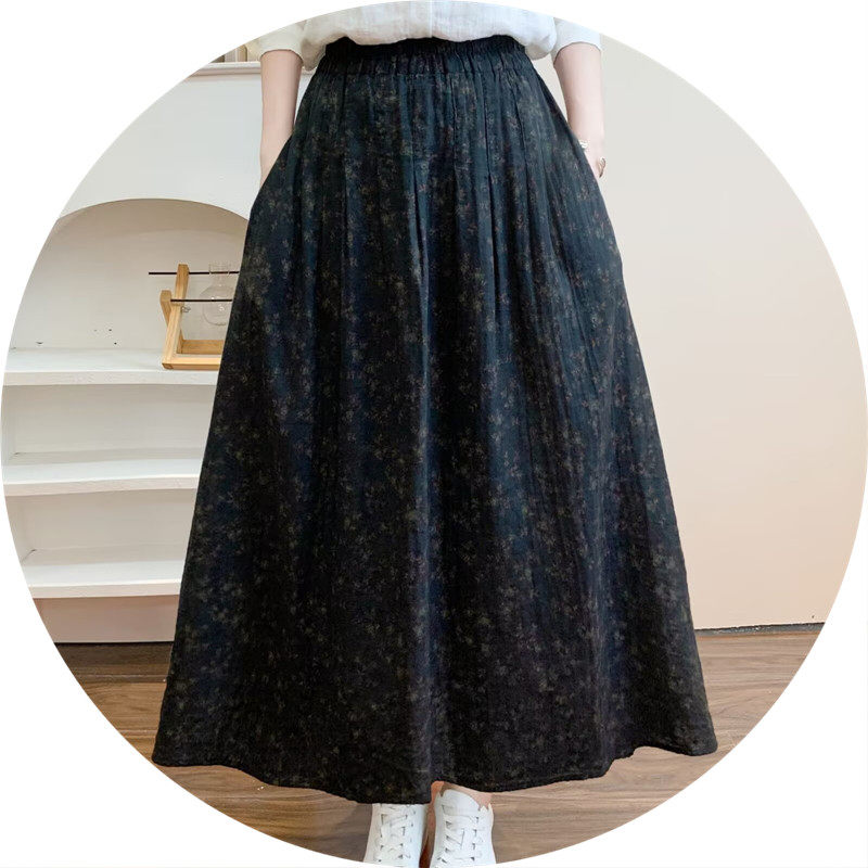 Retro Pure Cotton Floral Skirt for Women, Long, Drapey, Loose, Versatile, Slimming, Artistic Mid-Length A-Line Skirt