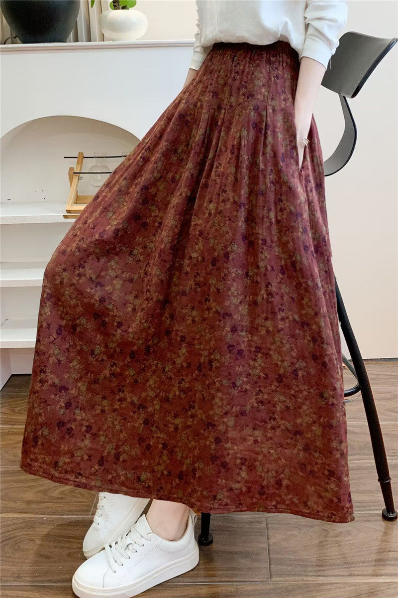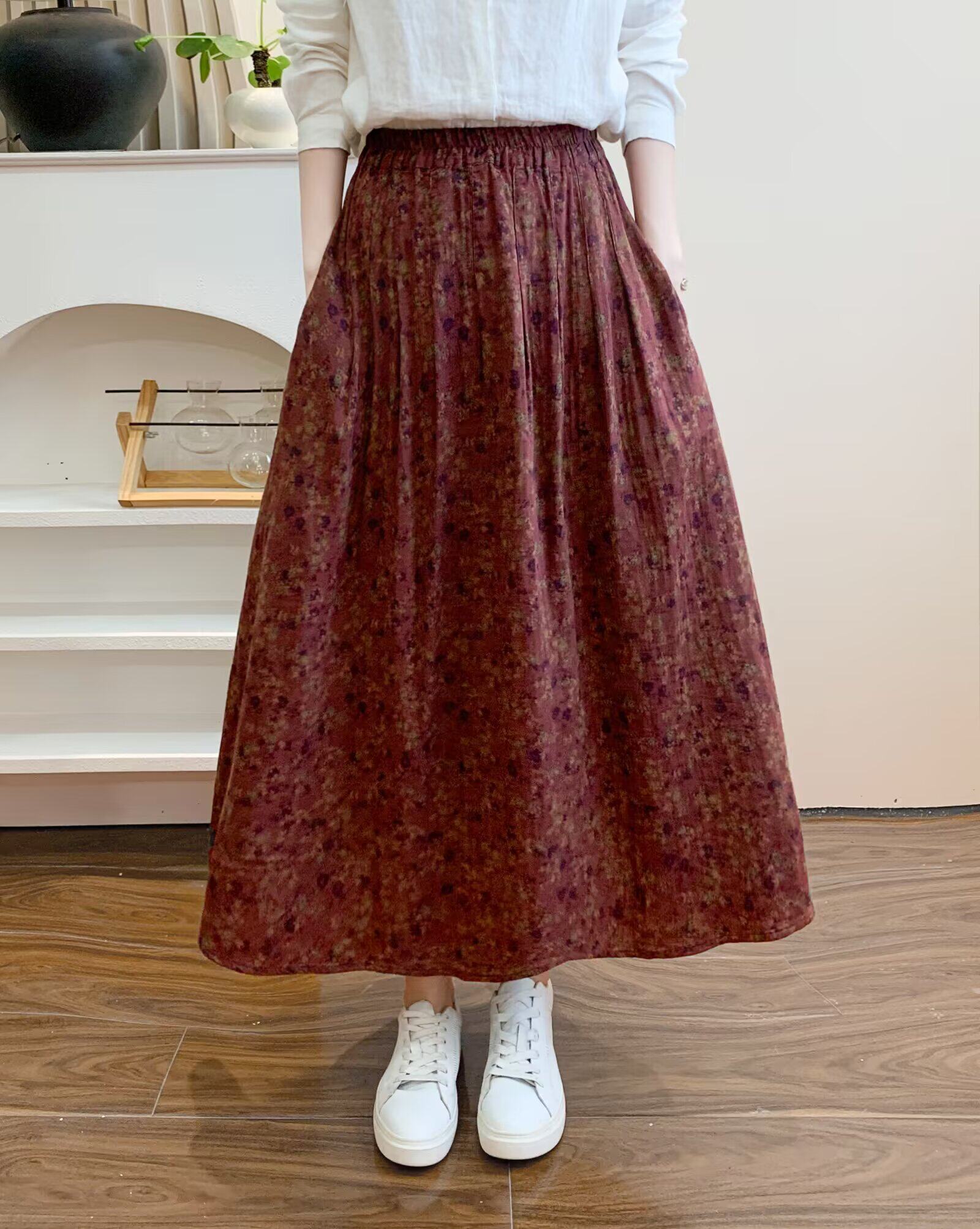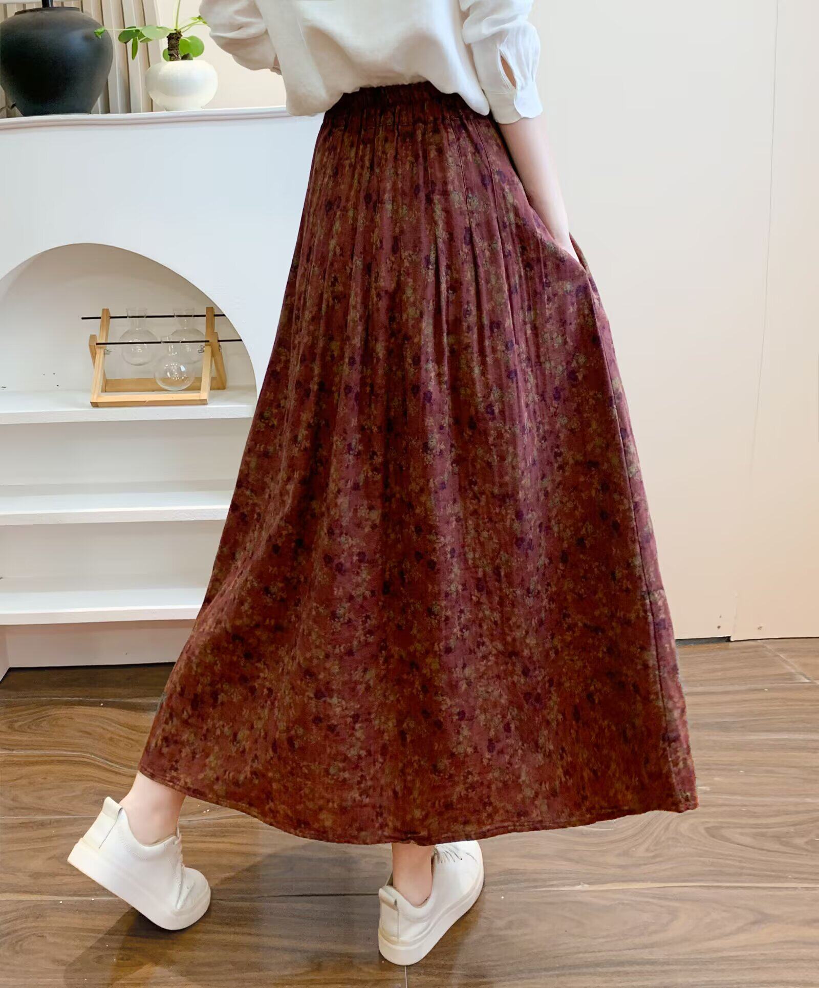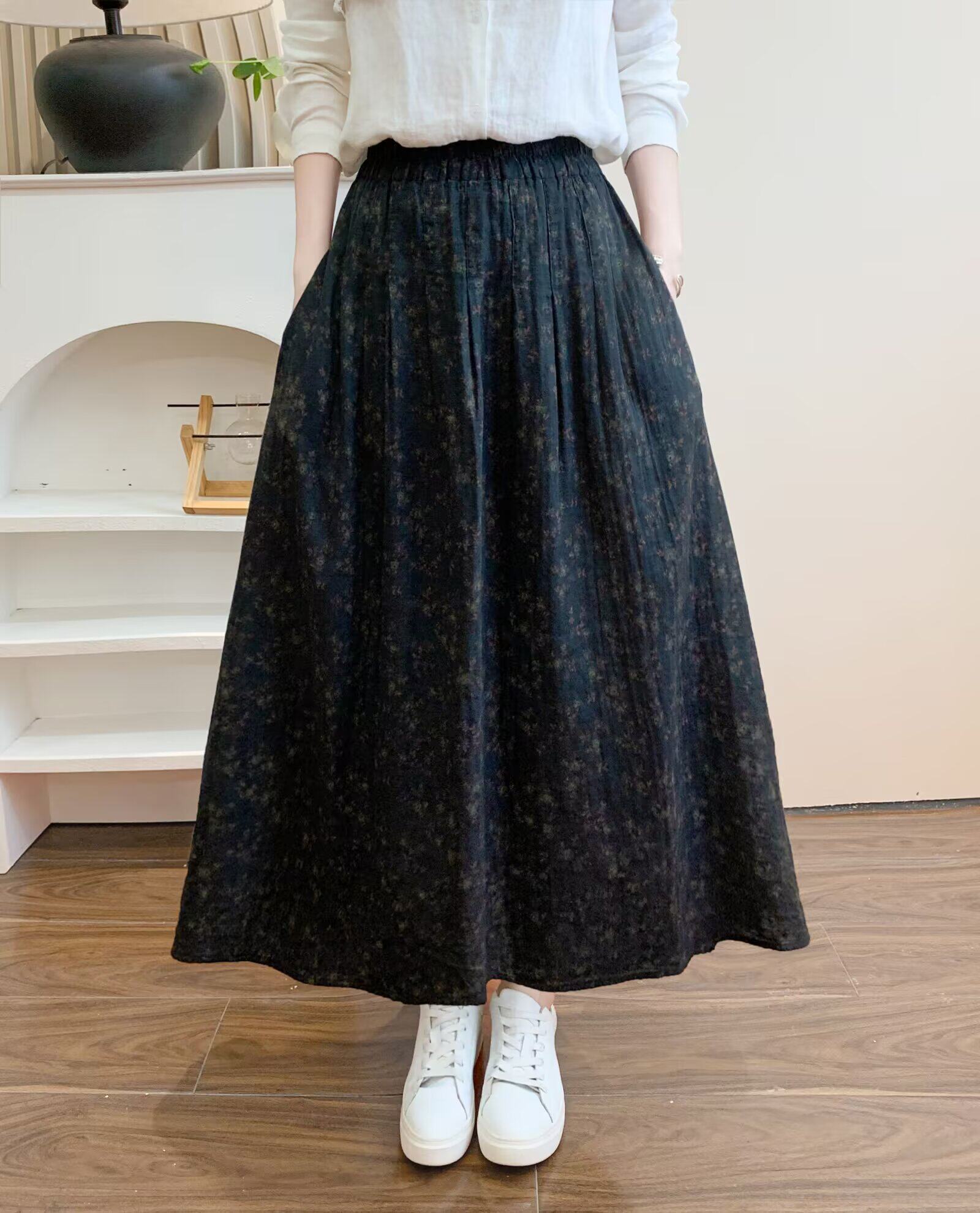 Retro Pure Cotton Floral Skirt for Women, Long, Drapey, Loose, Versatile, Slimming, Artistic Mid-Length A-Line Skirt