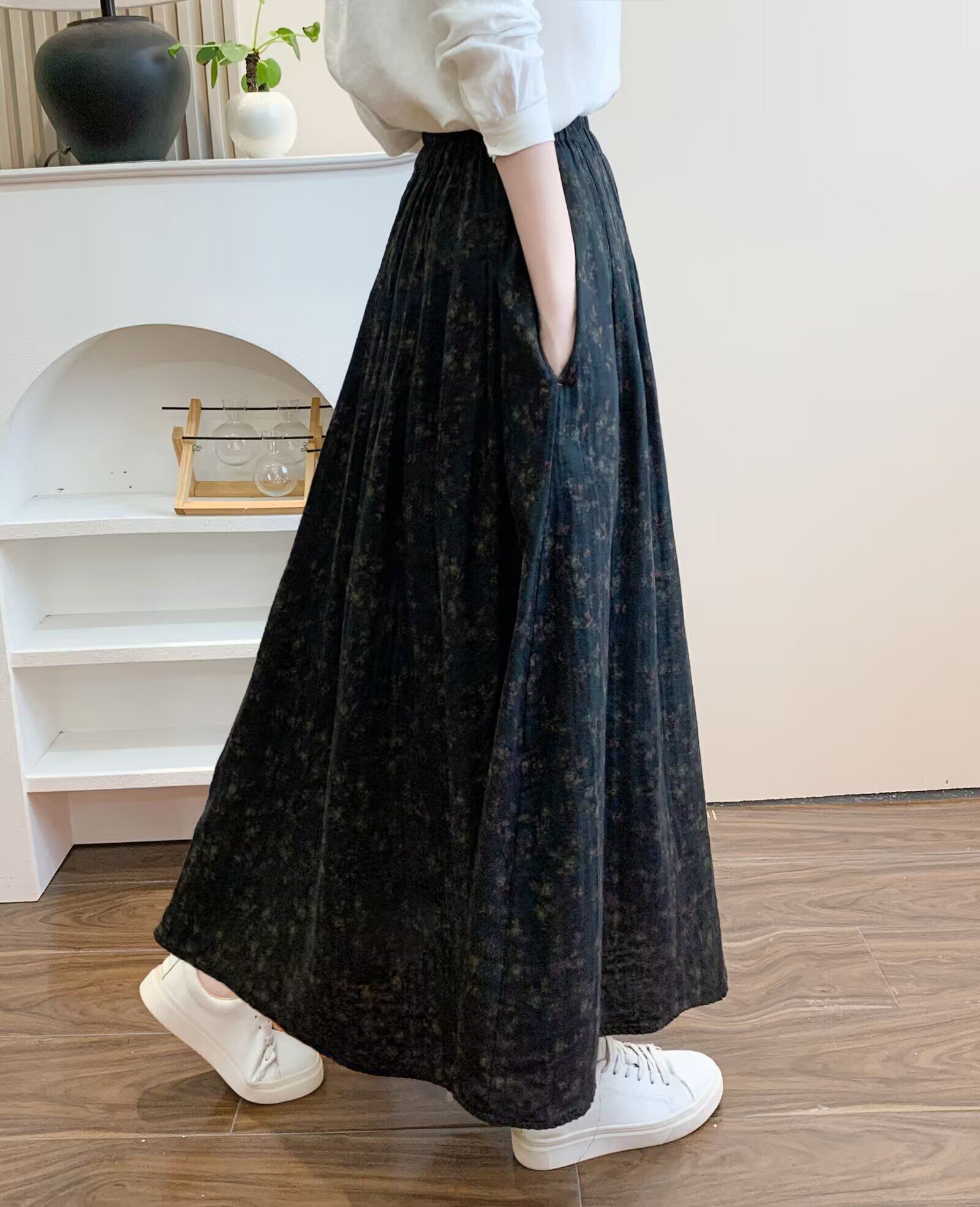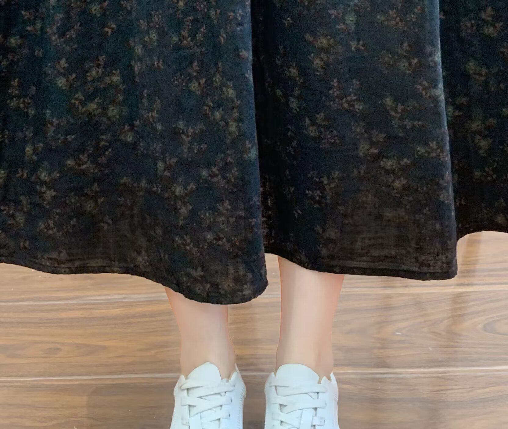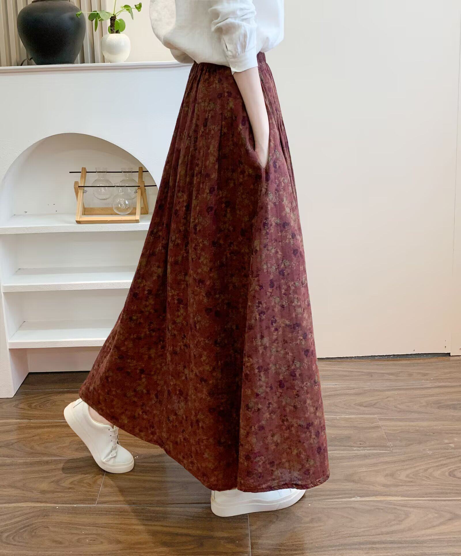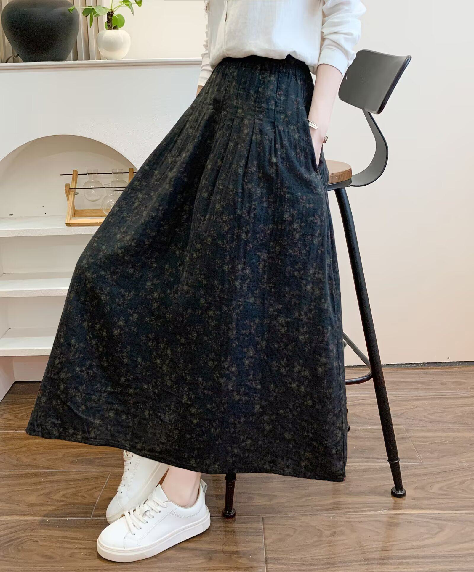 Retro Pure Cotton Floral Skirt for Women, Long, Drapey, Loose, Versatile, Slimming, Artistic Mid-Length A-Line Skirt