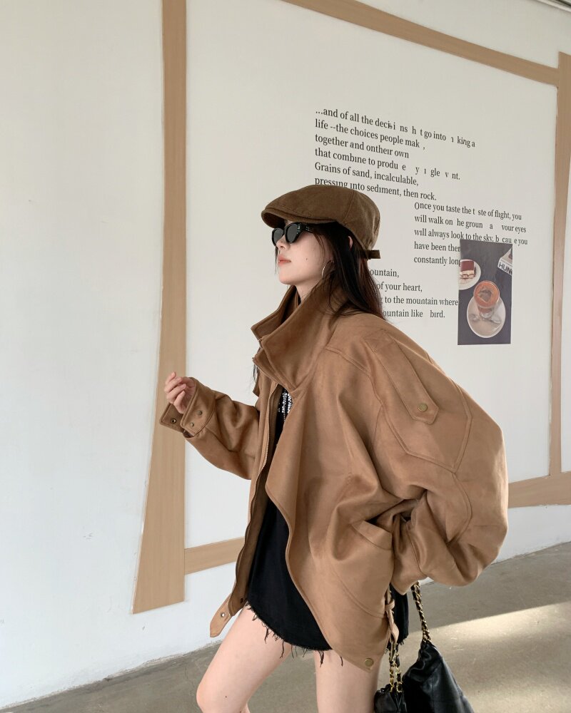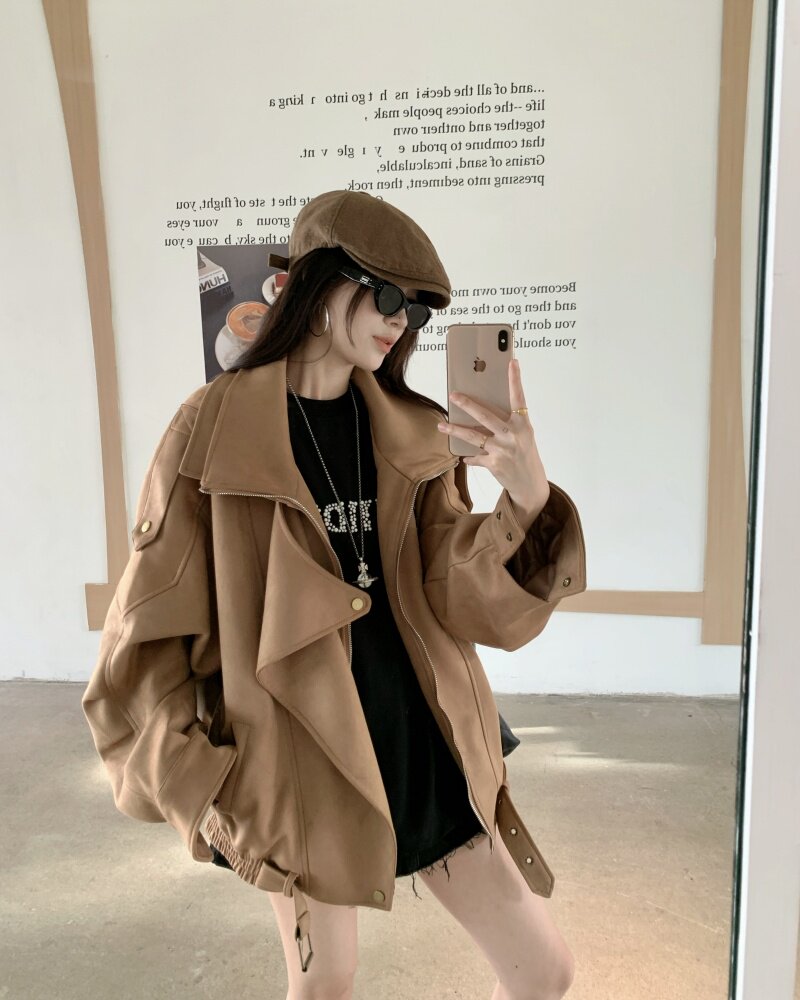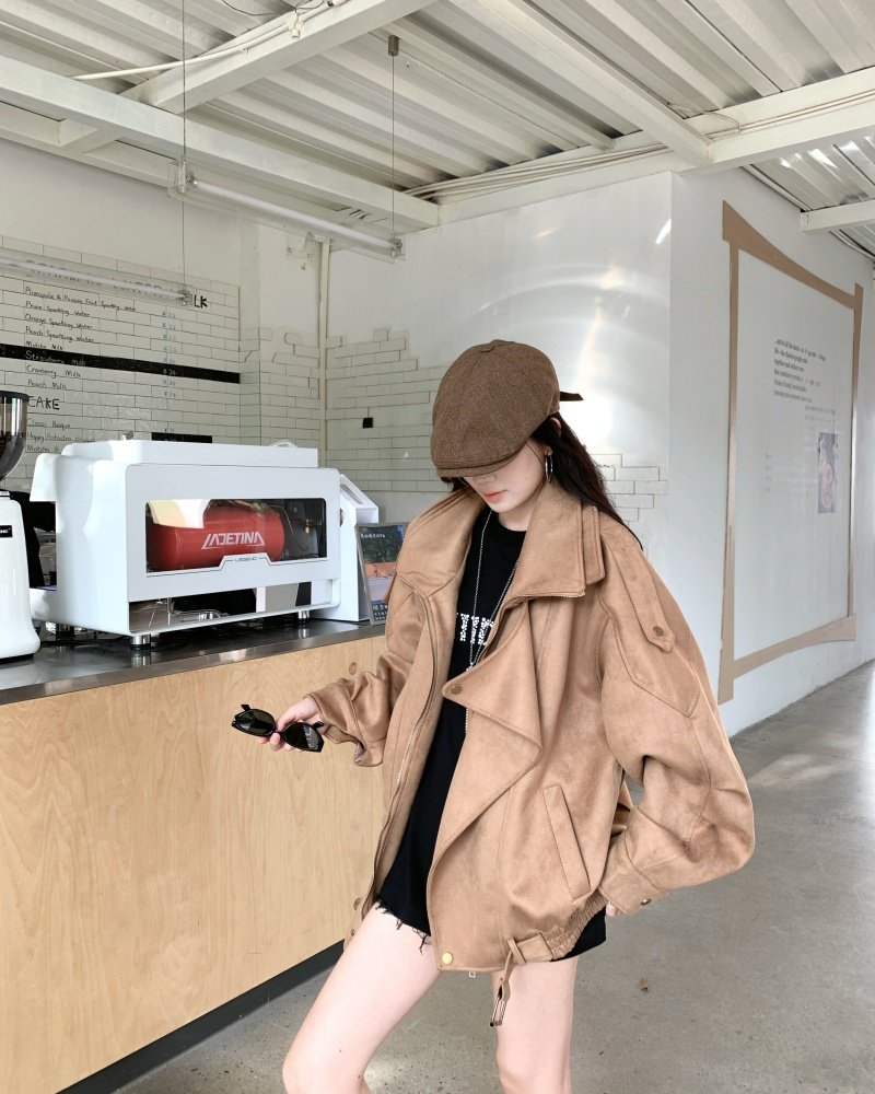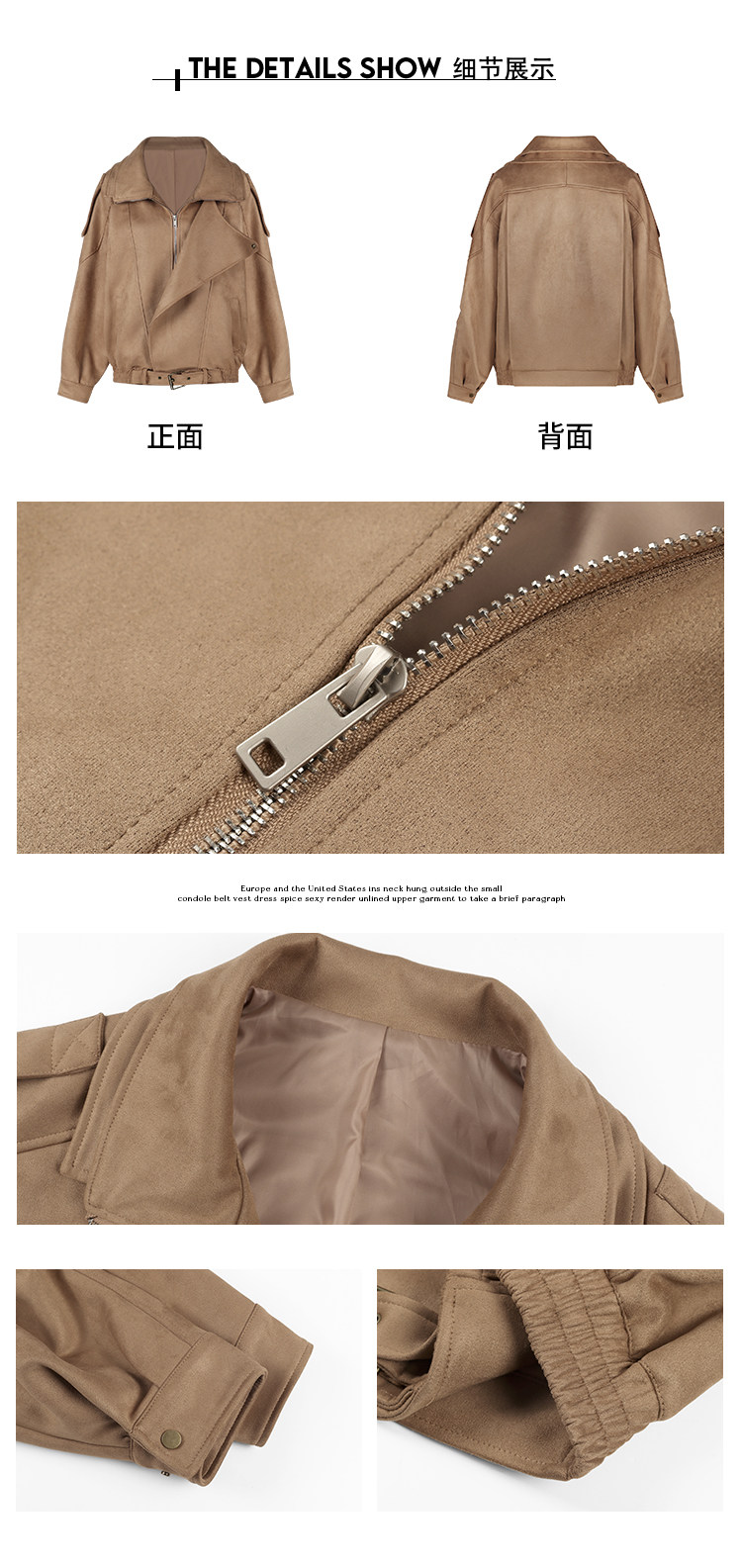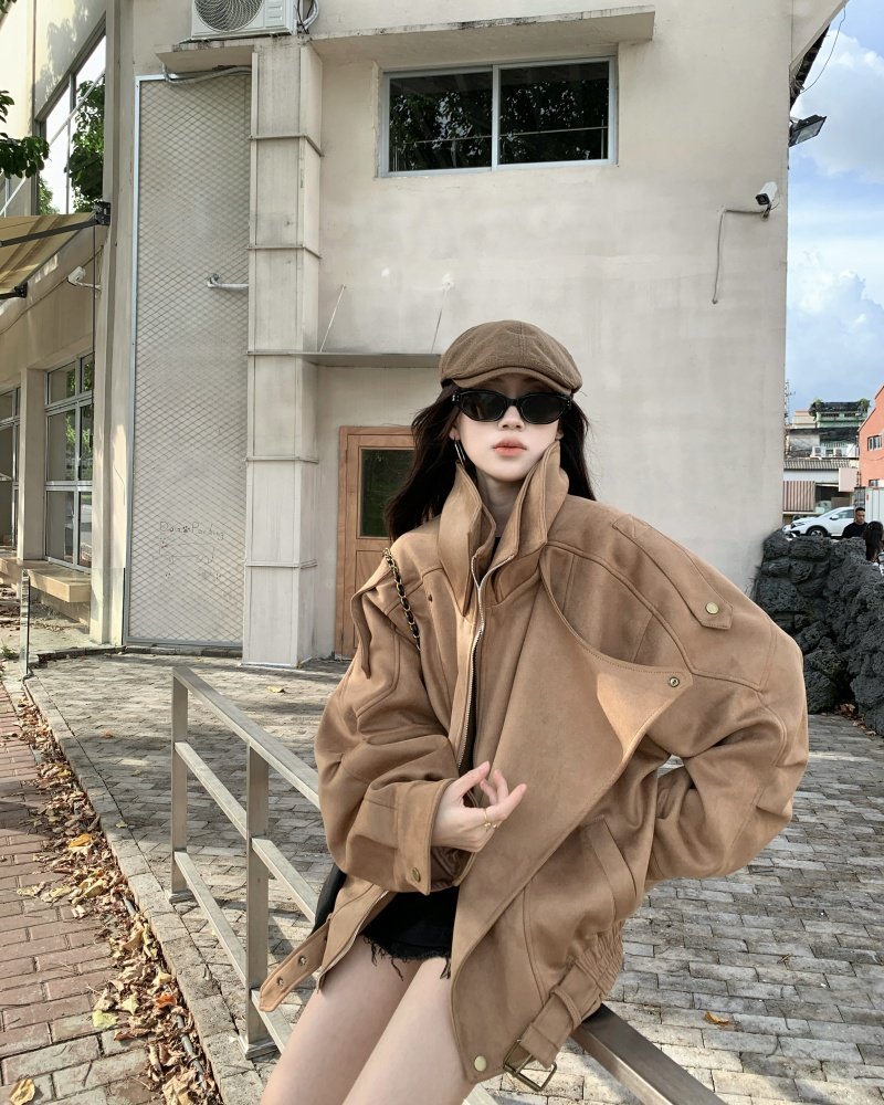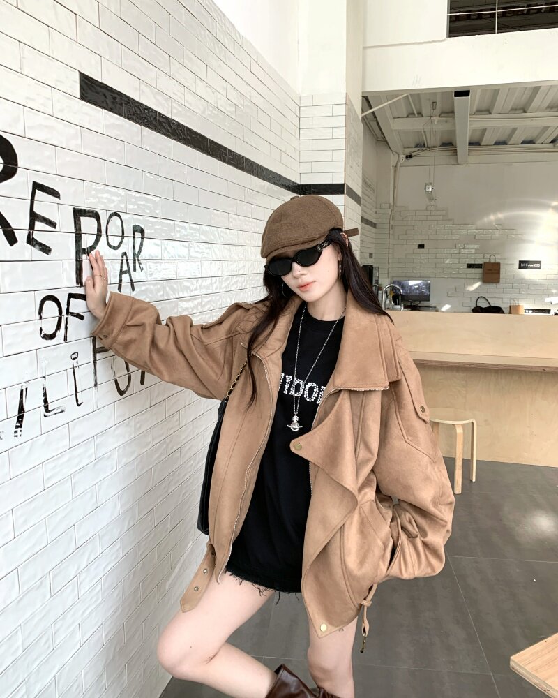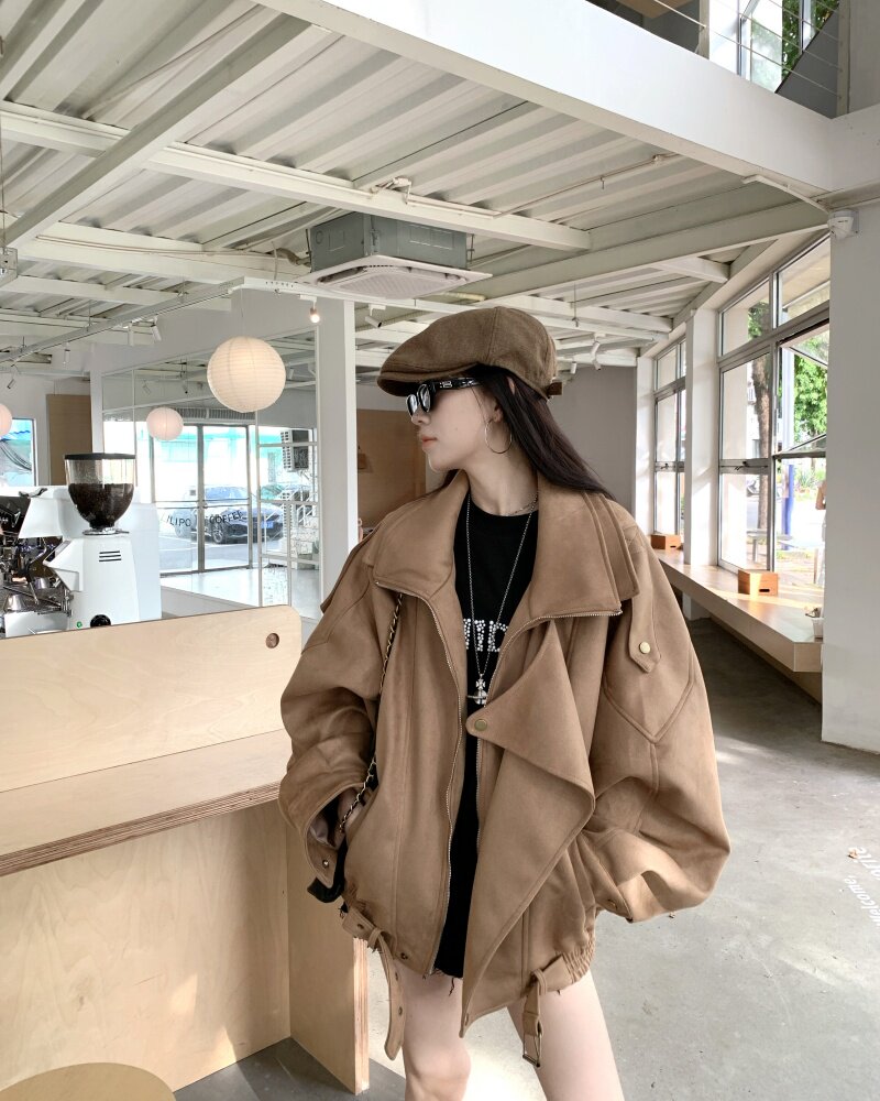 Khaki retro long-sleeved suede jacket women's autumn and winter American motorcycle wear loose temperament jacket cardigan top