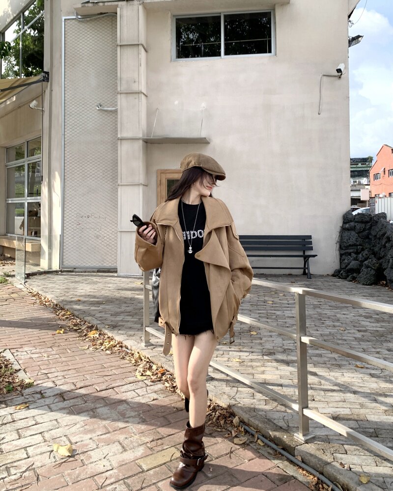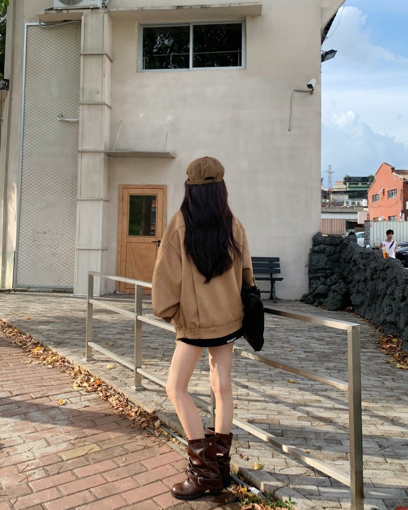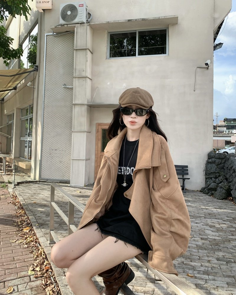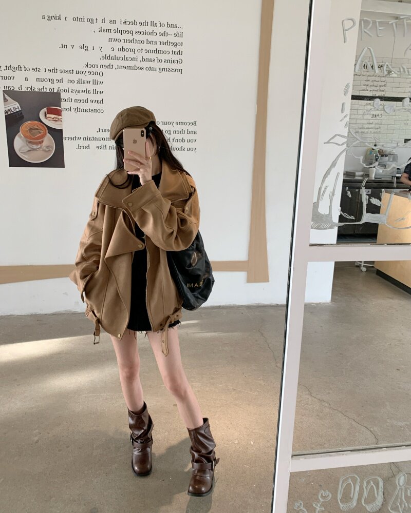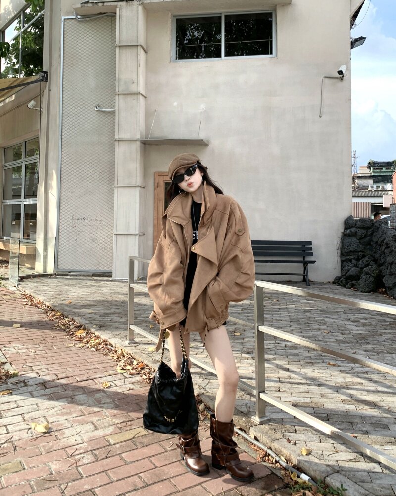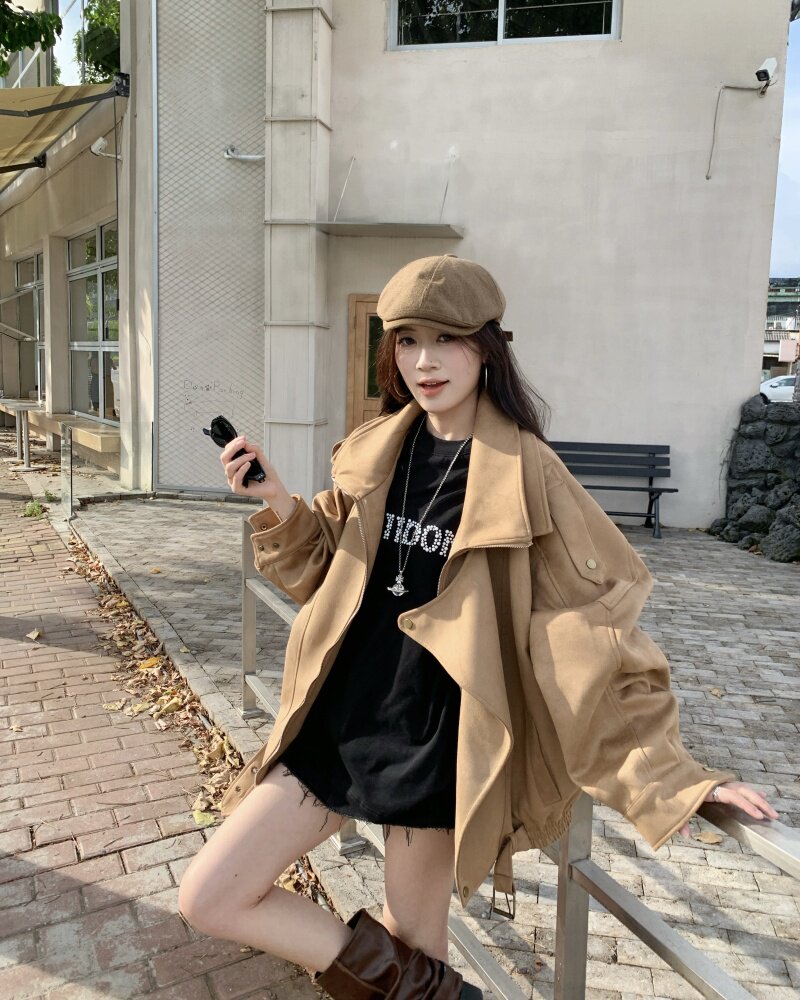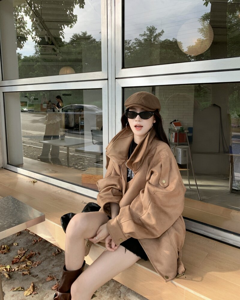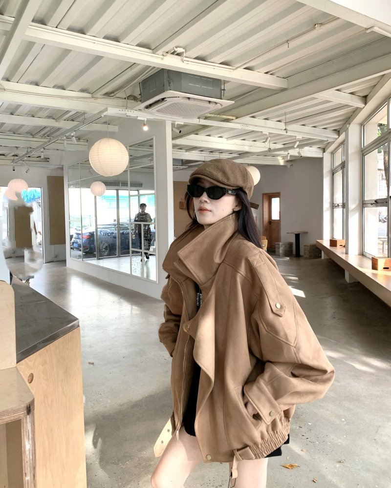 Khaki retro long-sleeved suede jacket women's autumn and winter American motorcycle wear loose temperament jacket cardigan top