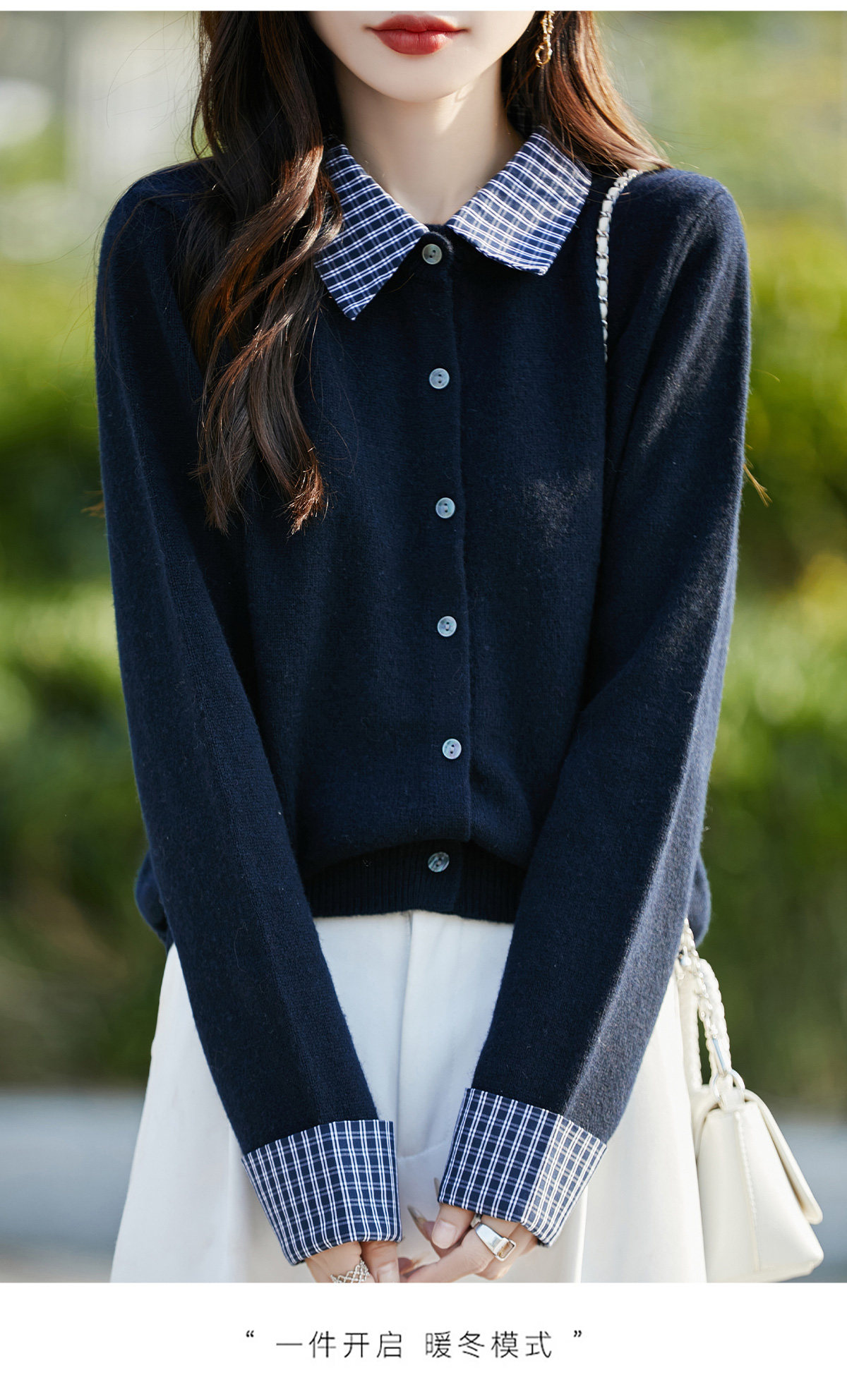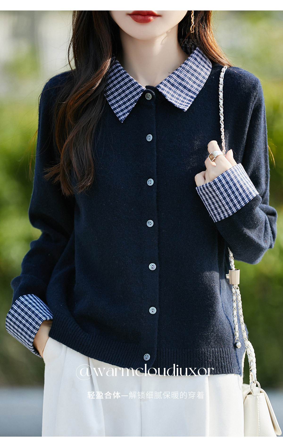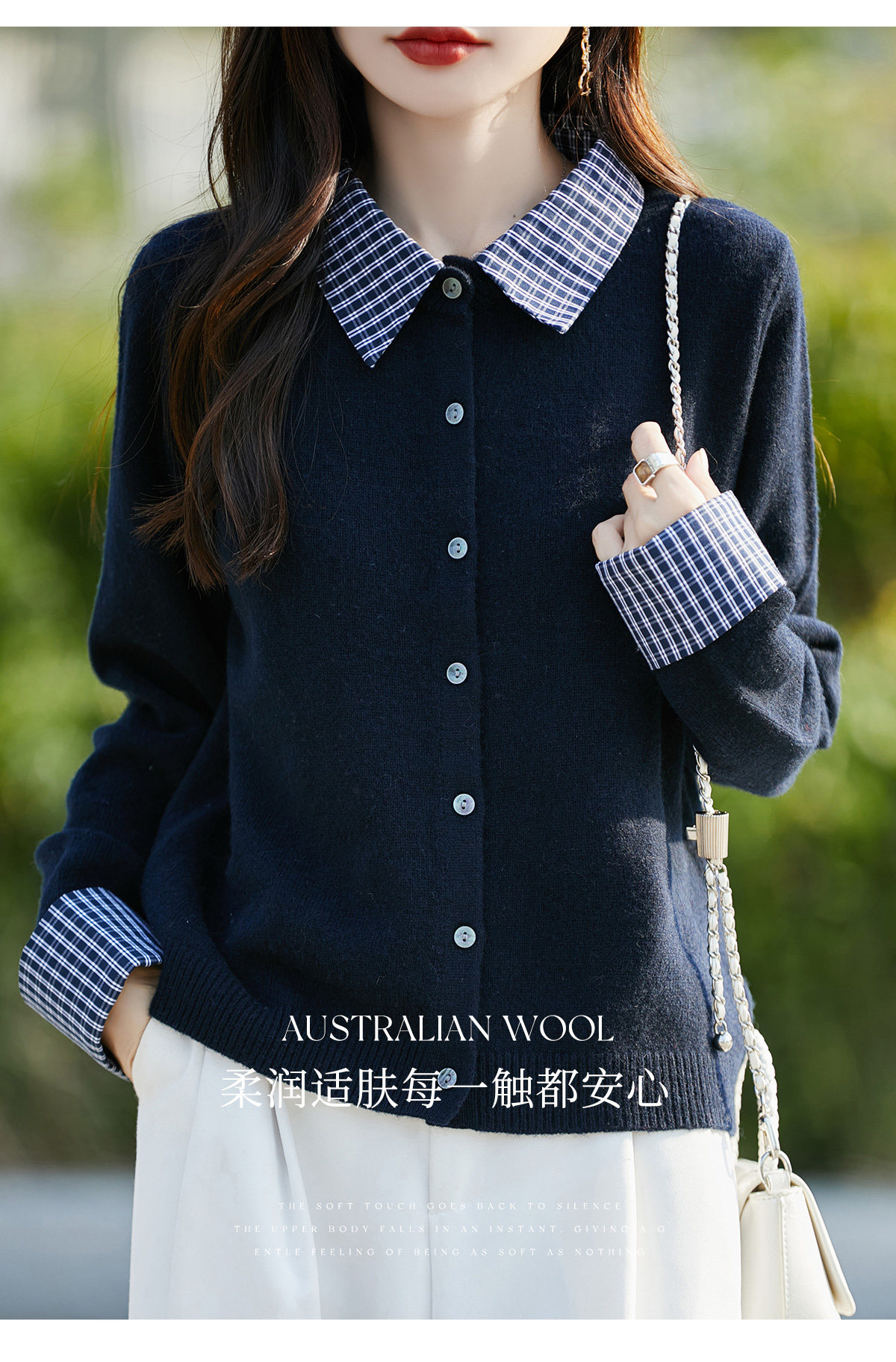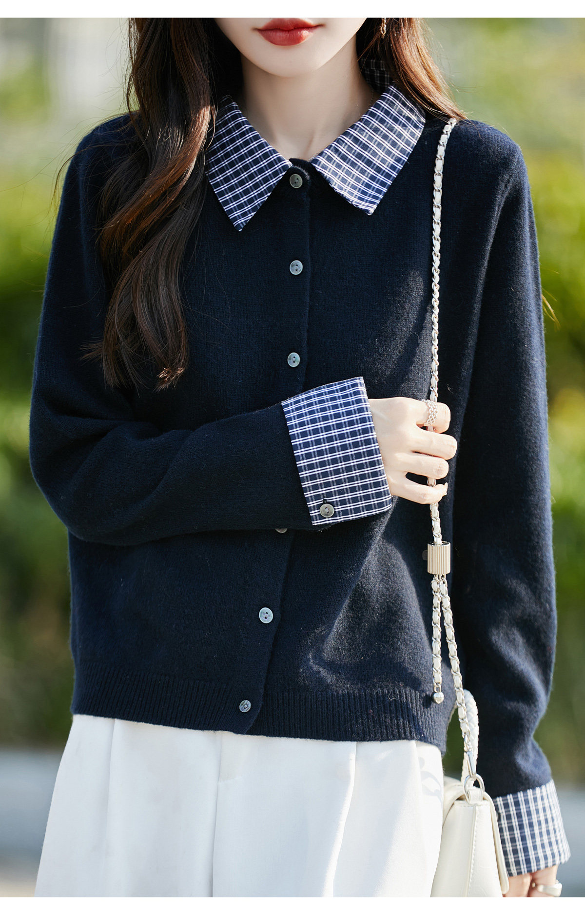 Plaid fake two-piece pure wool knitted cardigan for women 26 autumn and winter new style wool soft and waxy splicing jacket top shirt
