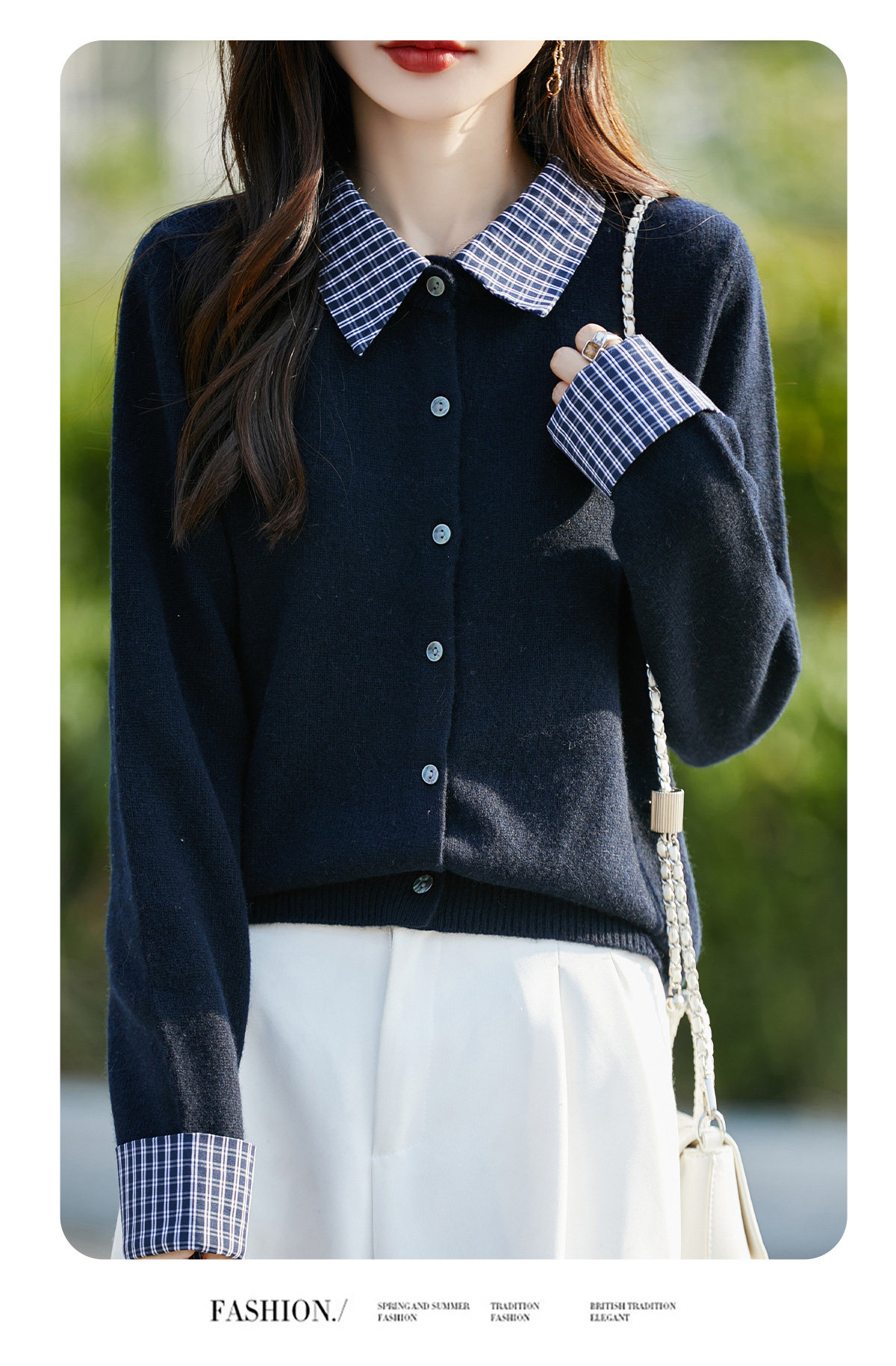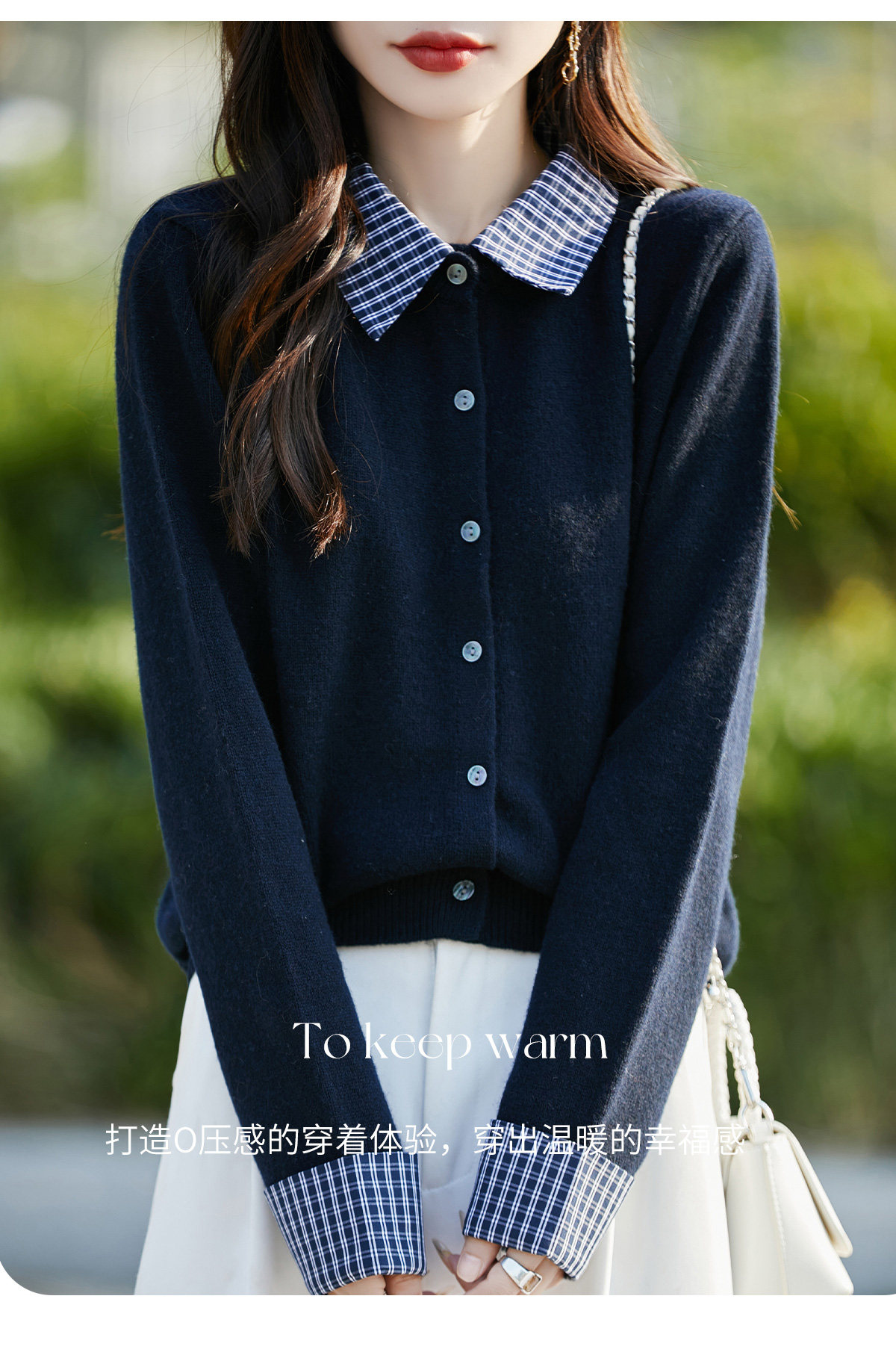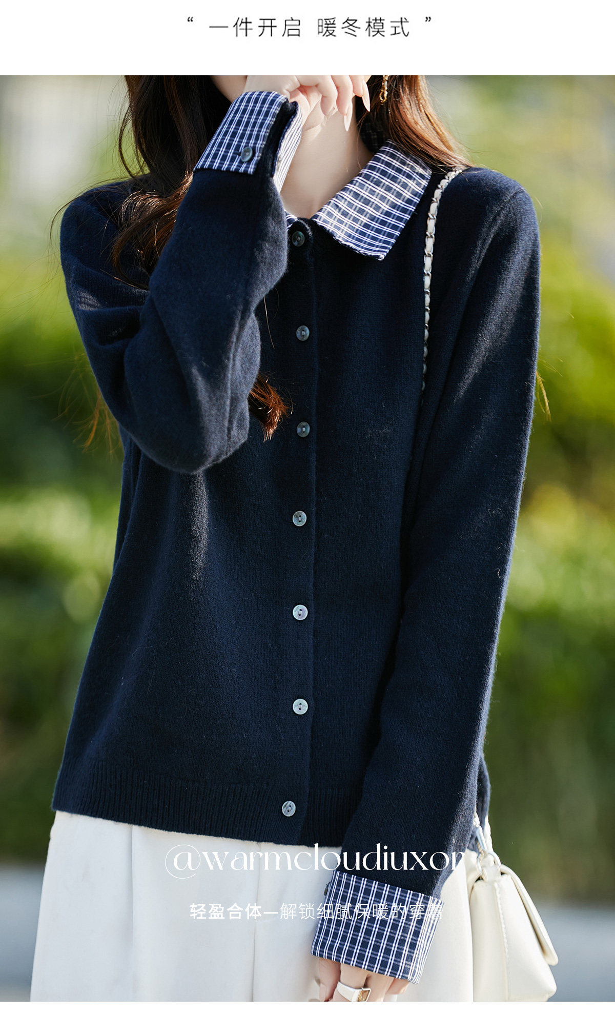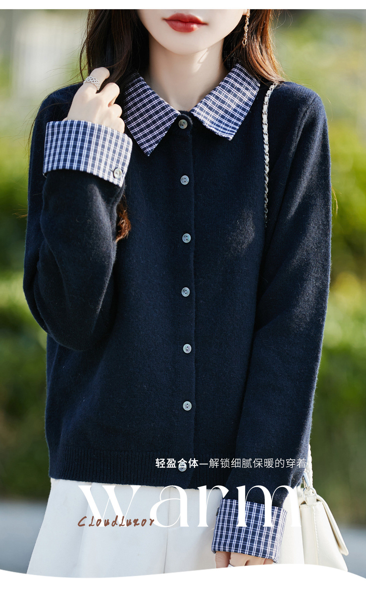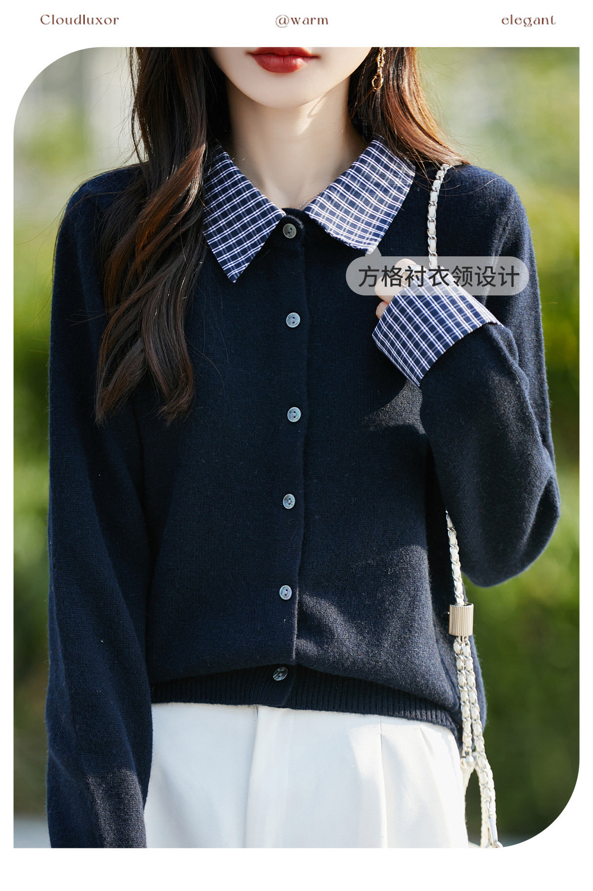 Plaid fake two-piece pure wool knitted cardigan for women 26 autumn and winter new style wool soft and waxy splicing jacket top shirt