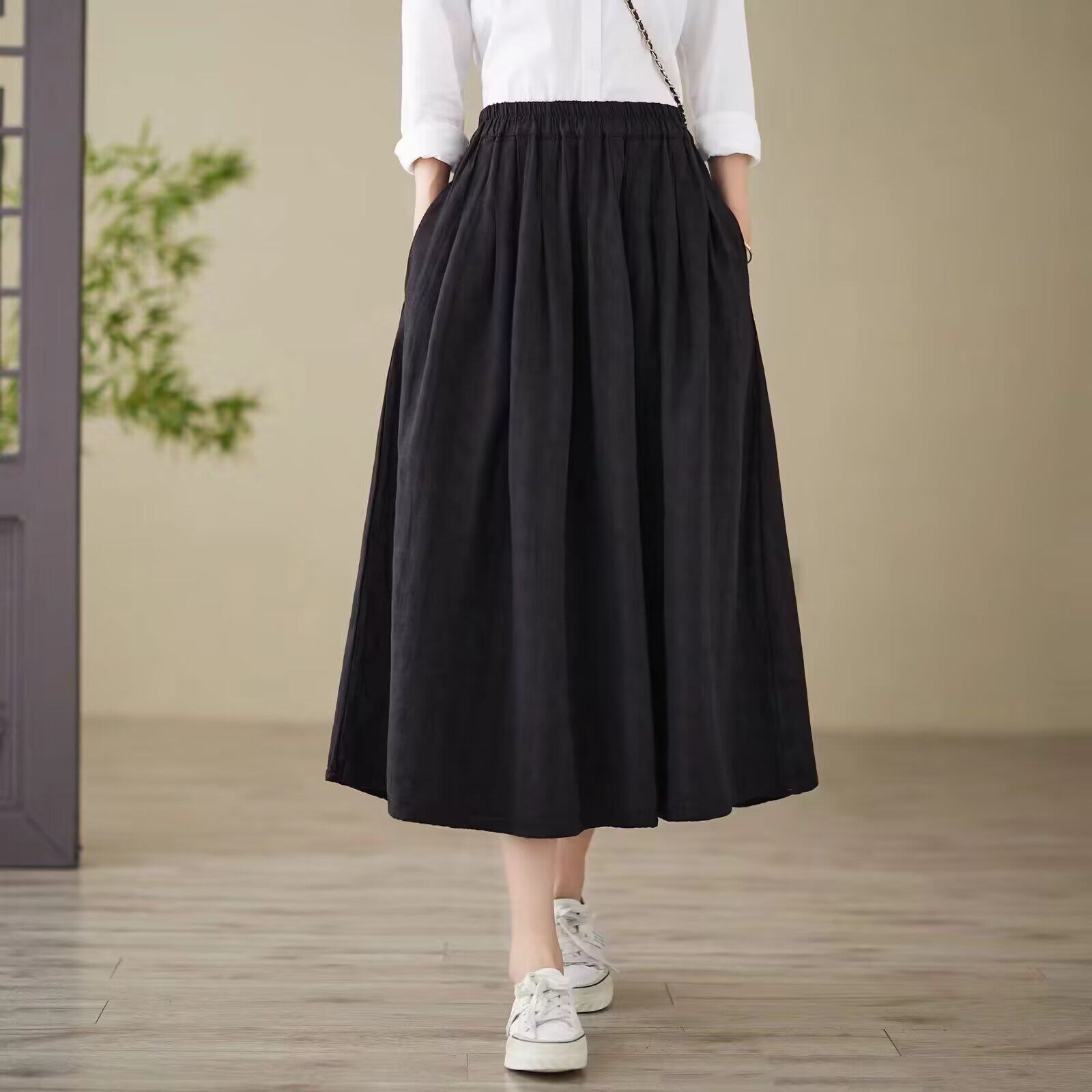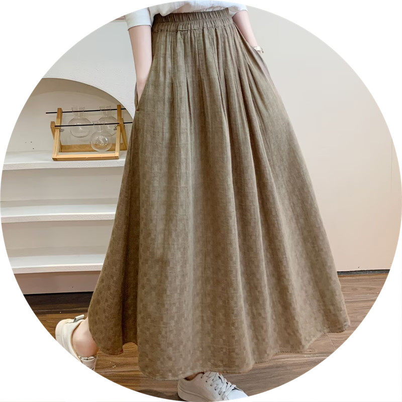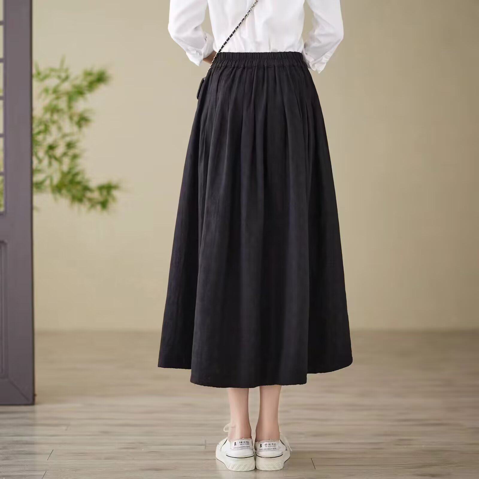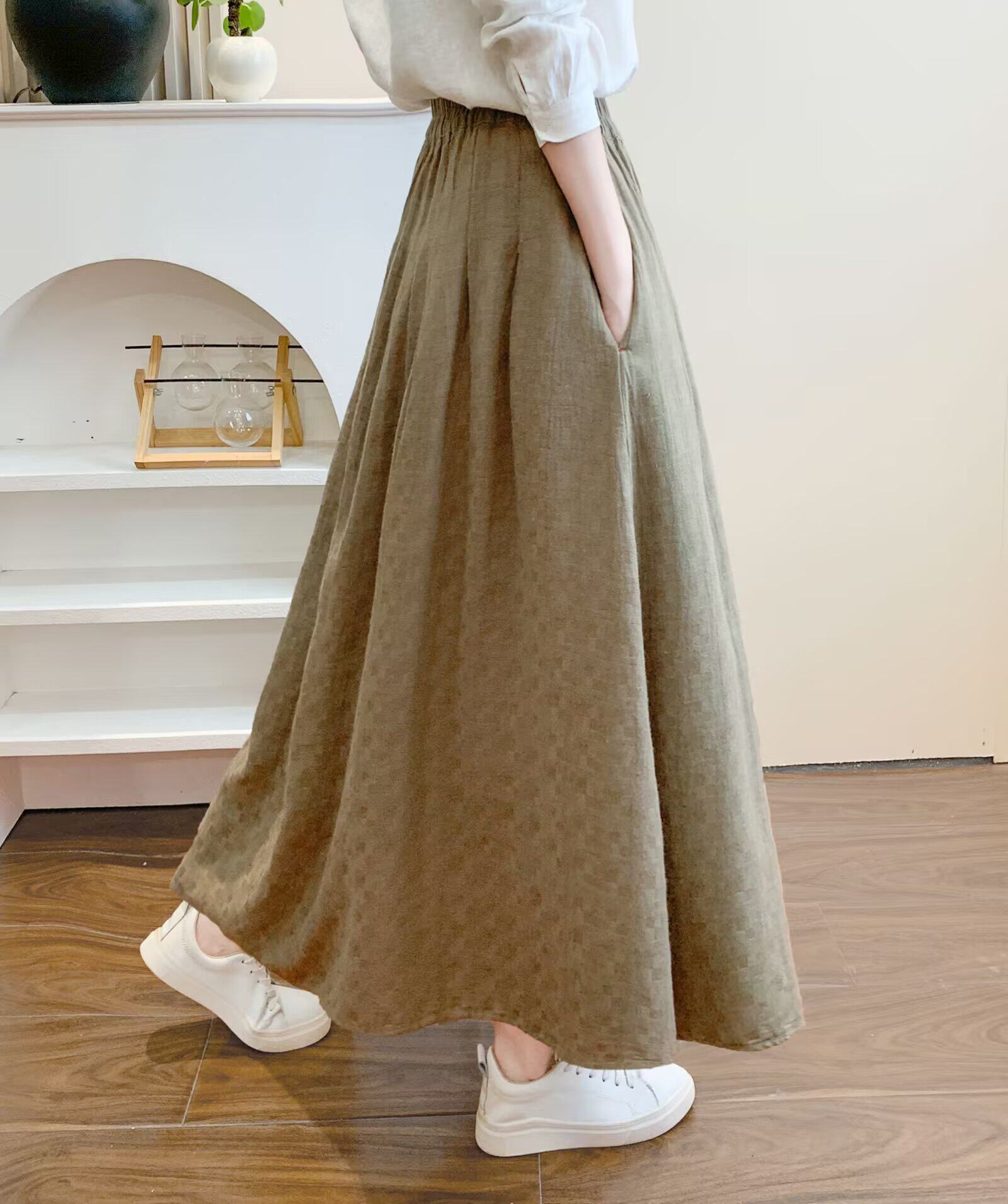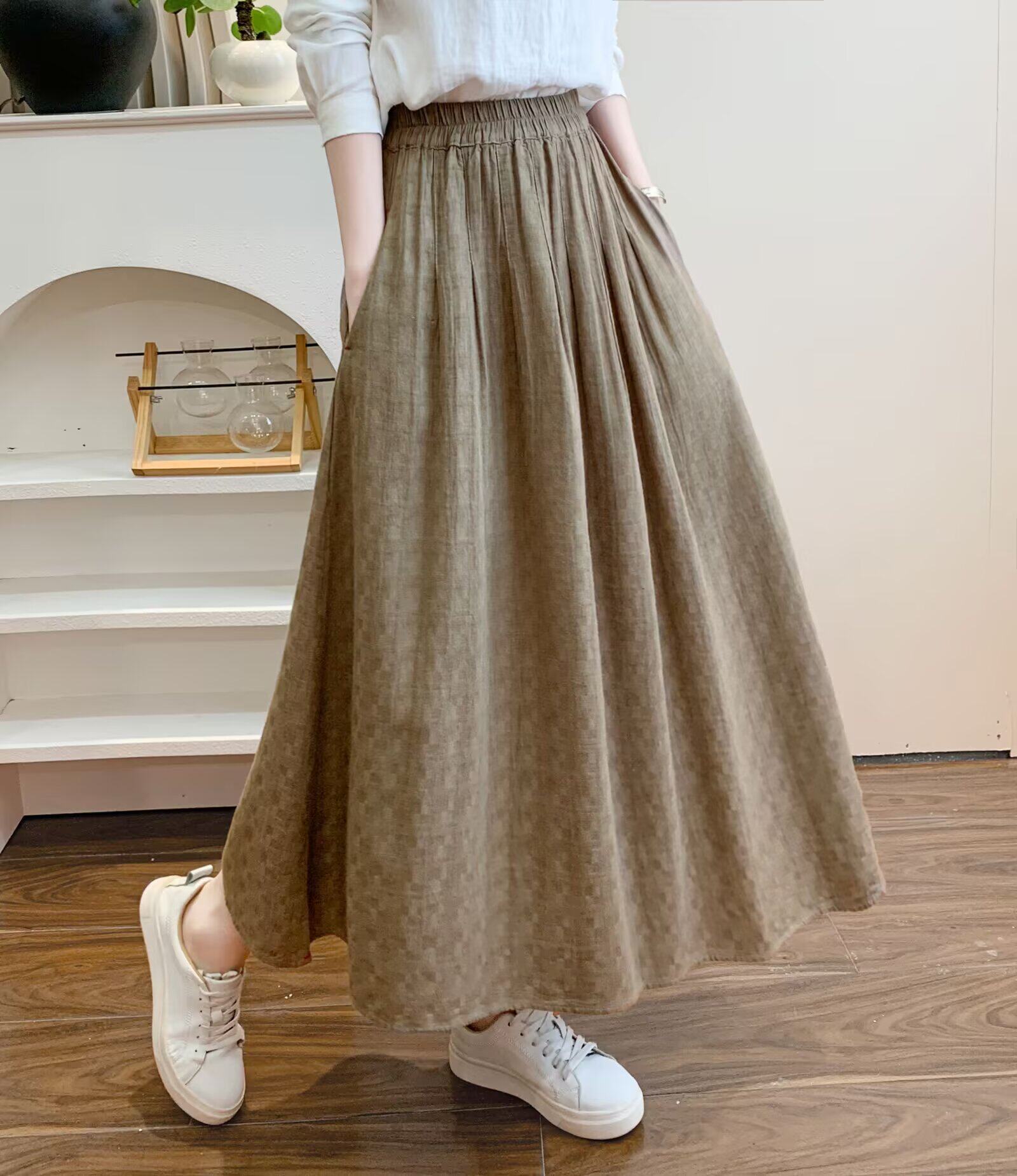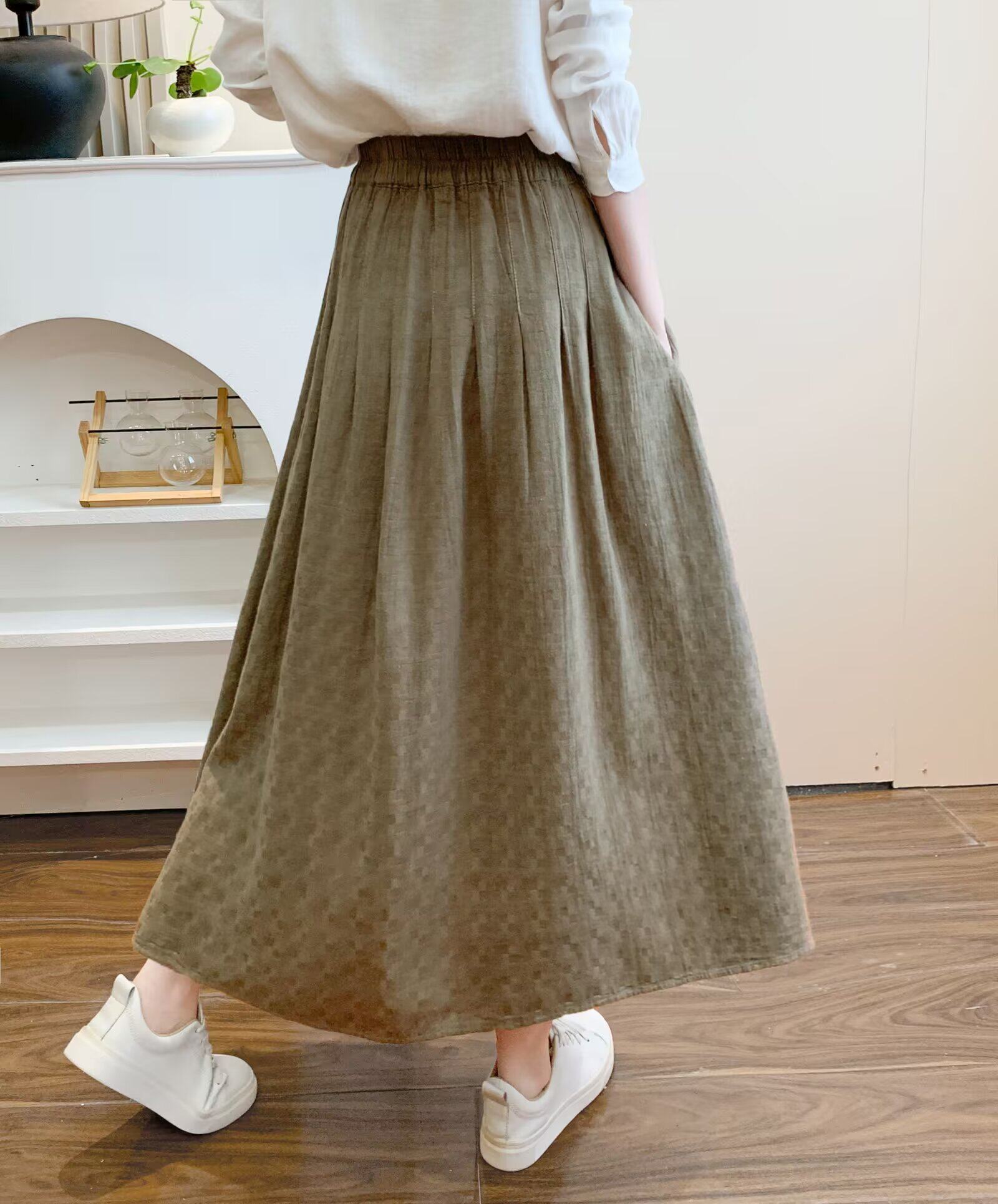 Vintage Jacquard Cotton Midi Skirt, Loose, Artistic, Versatile, Mid-Length, Slimming, Drapey A-Line Skirt for Women with Pockets