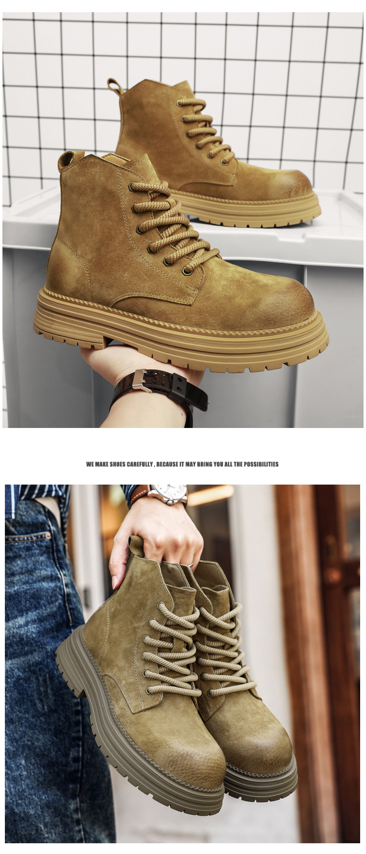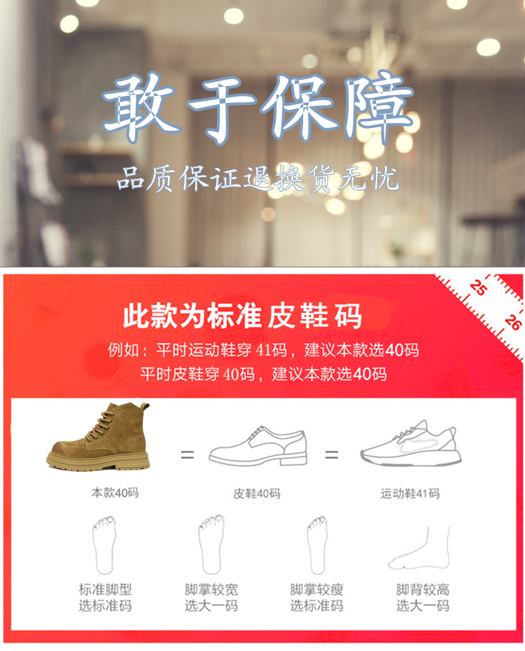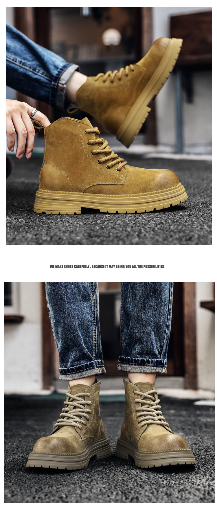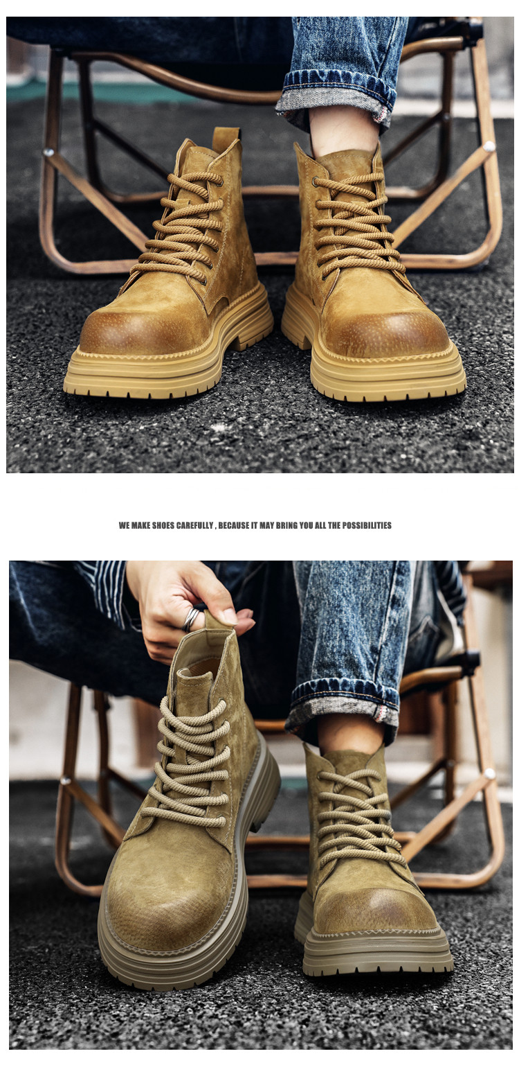 Martin Boots for Men, Winter Genuine Leather High-Top Shoes, British Style Thick-Soled Couple's Yellow Boots, Fleece-Lined Outdoor Mid-Top Work Boots